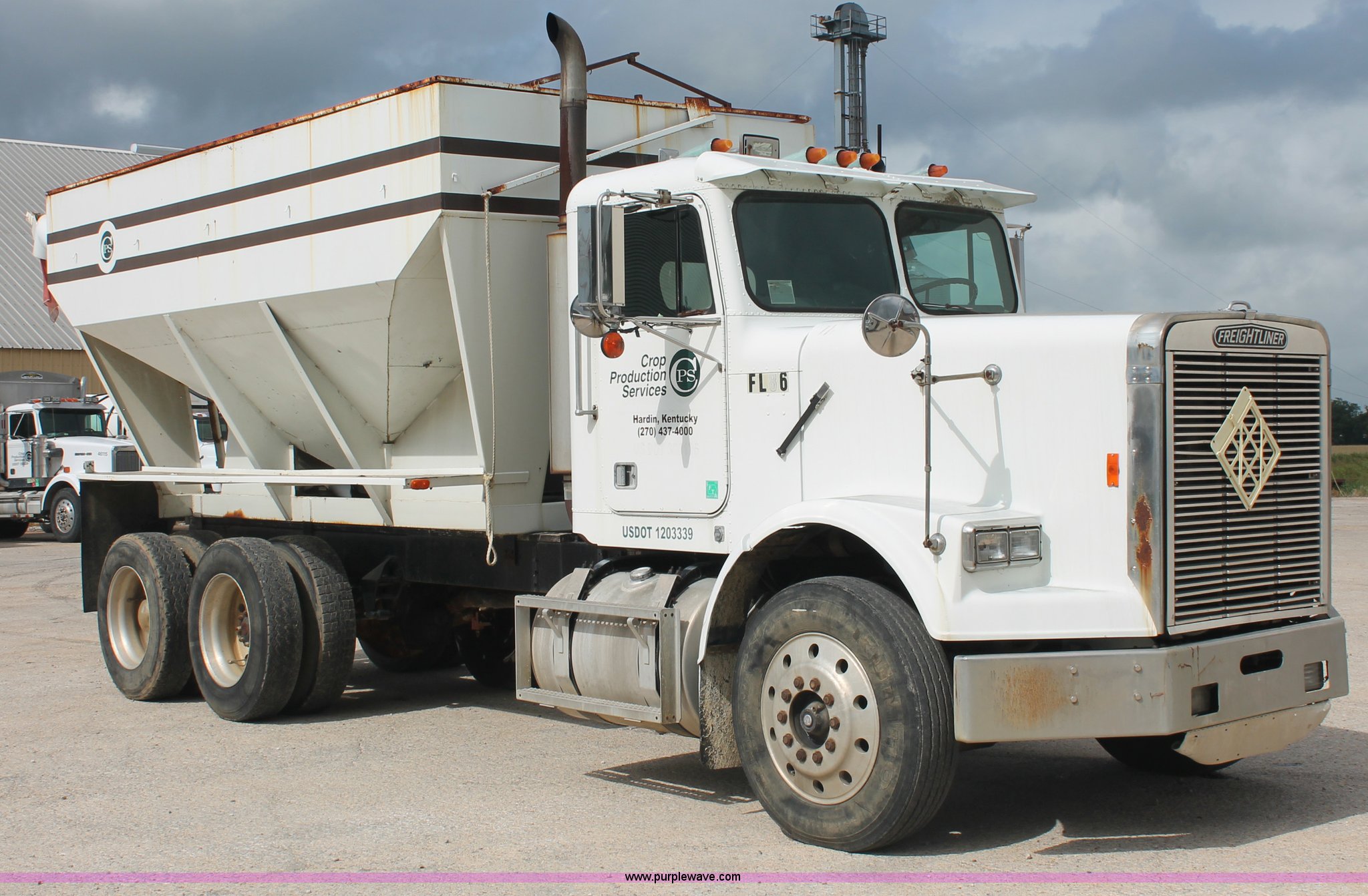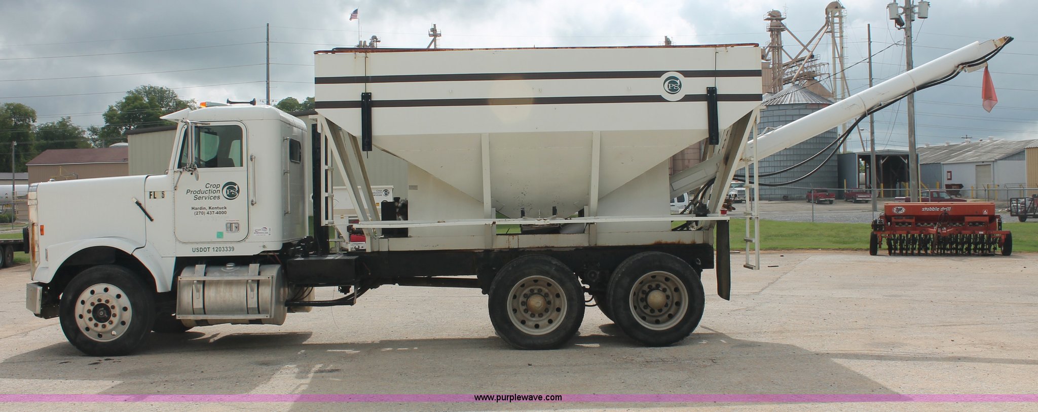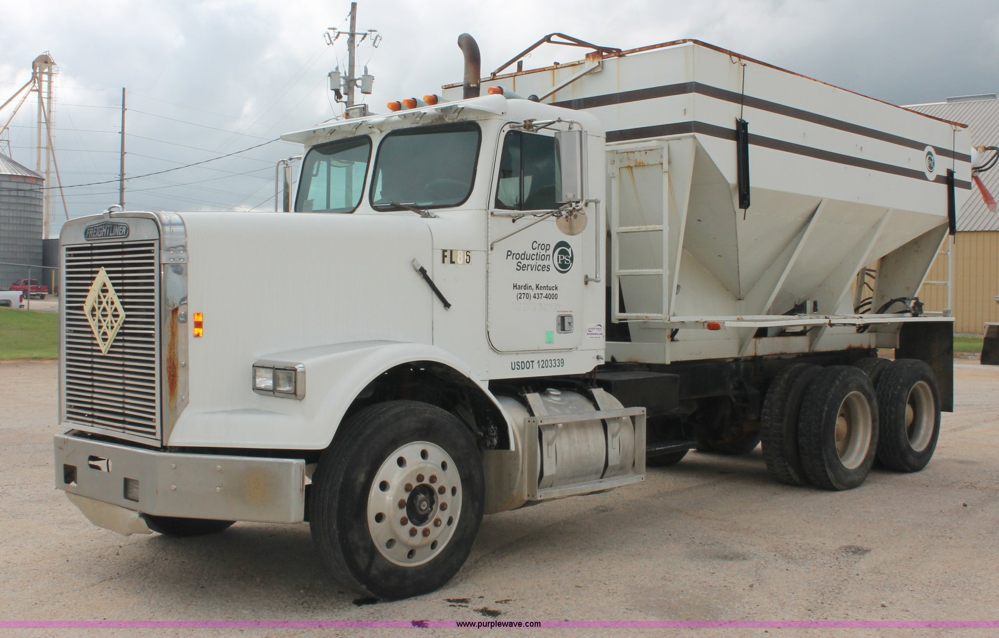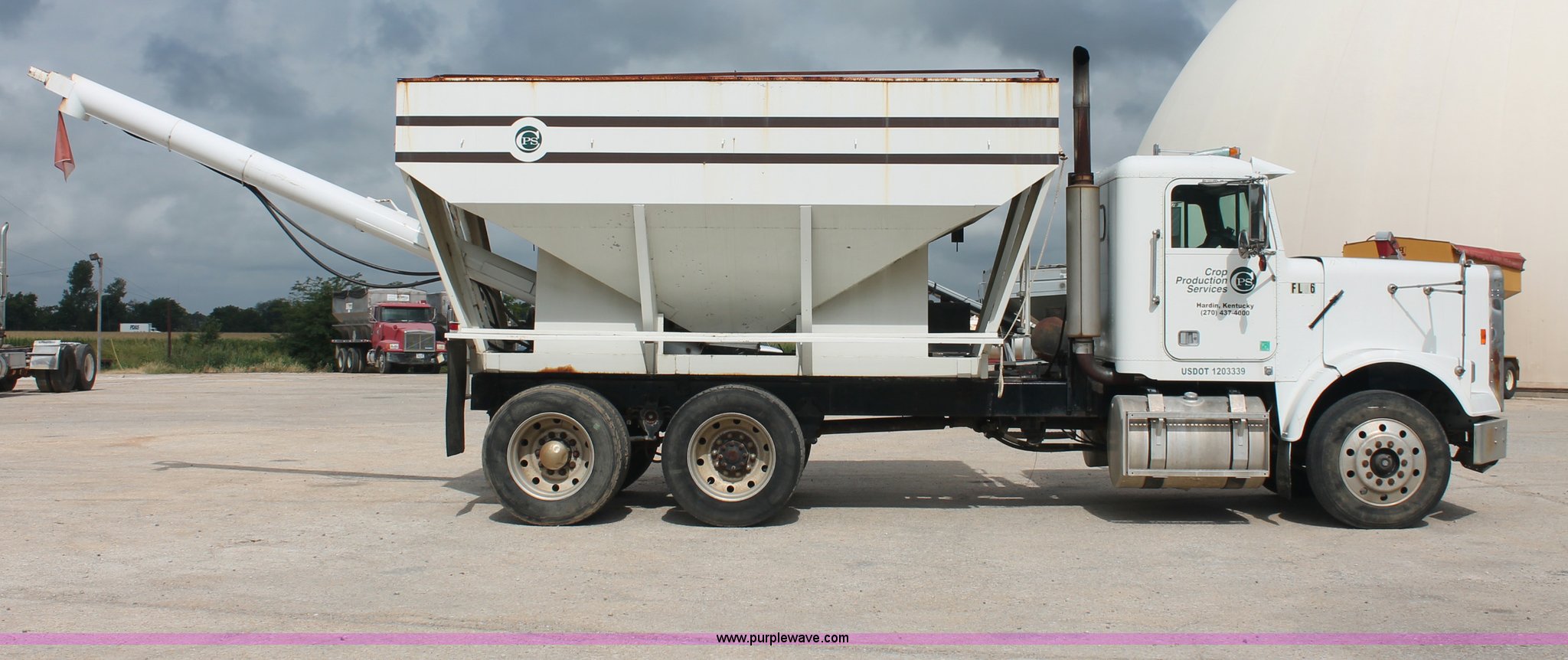 Purple Wave is selling a used Fertilizer or Feed Delivery Truck in Tennessee. This item is a 1986 Freightliner Conventional FLC120-64T fertilizer tender truck with the following: 219,598 miles on odometer, Cummins 14.0L L6 diesel engine, Fuller Road Ranger nine speed manual transmission, Twin screw, Differential lock, AC and heat, AM/FM/Cassette, Heated mirrors, Air seat, Highway Equipment LT16 16' tender bed, 10" diameter auger, (2) access ladders, Hydraulic toggle single stick operation, Serial 97124, Visor, Bumper, Block heater, Single rear exhaust stack, PTO, Wet kit, Spring suspension, Air brakes, 212" wheelbase, 275/80R24.5 tires, GVWR 50,000 lbs, FAWR 12,000 lbs, IAWR 19,000 lbs, RAWR 19,000 lbs, Unit# 44164