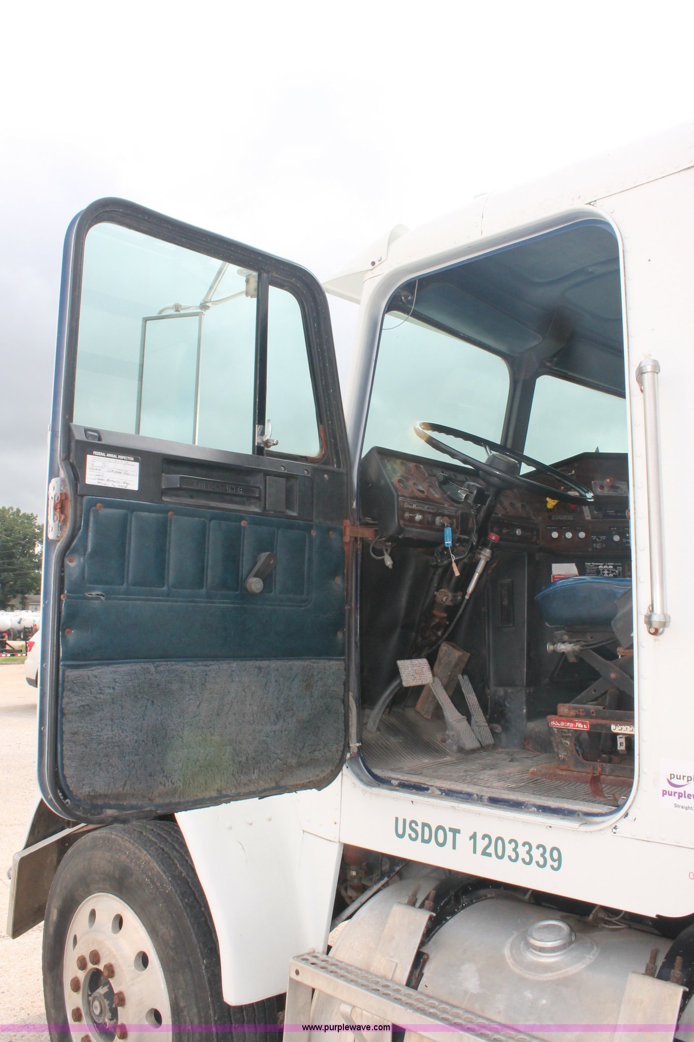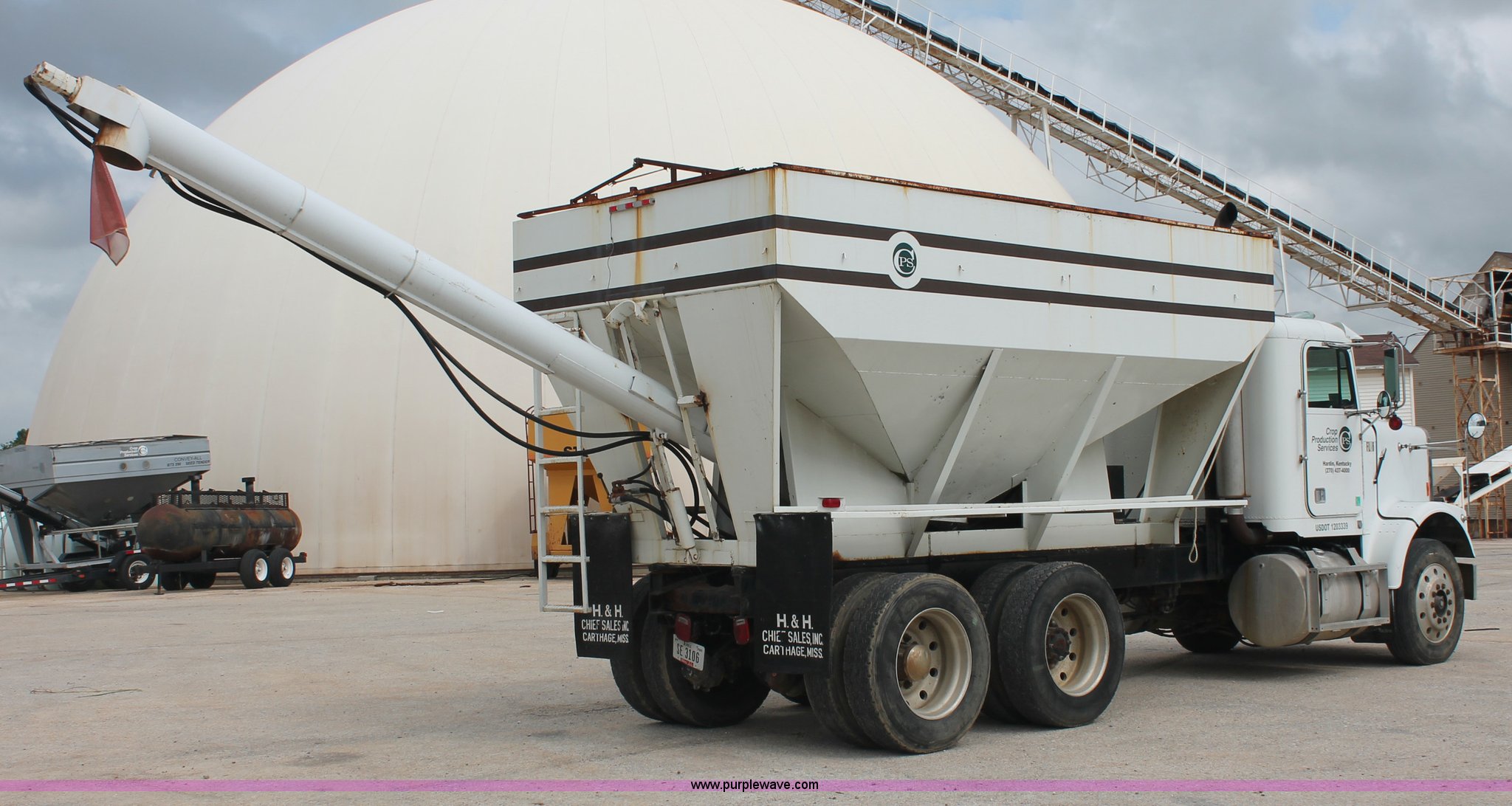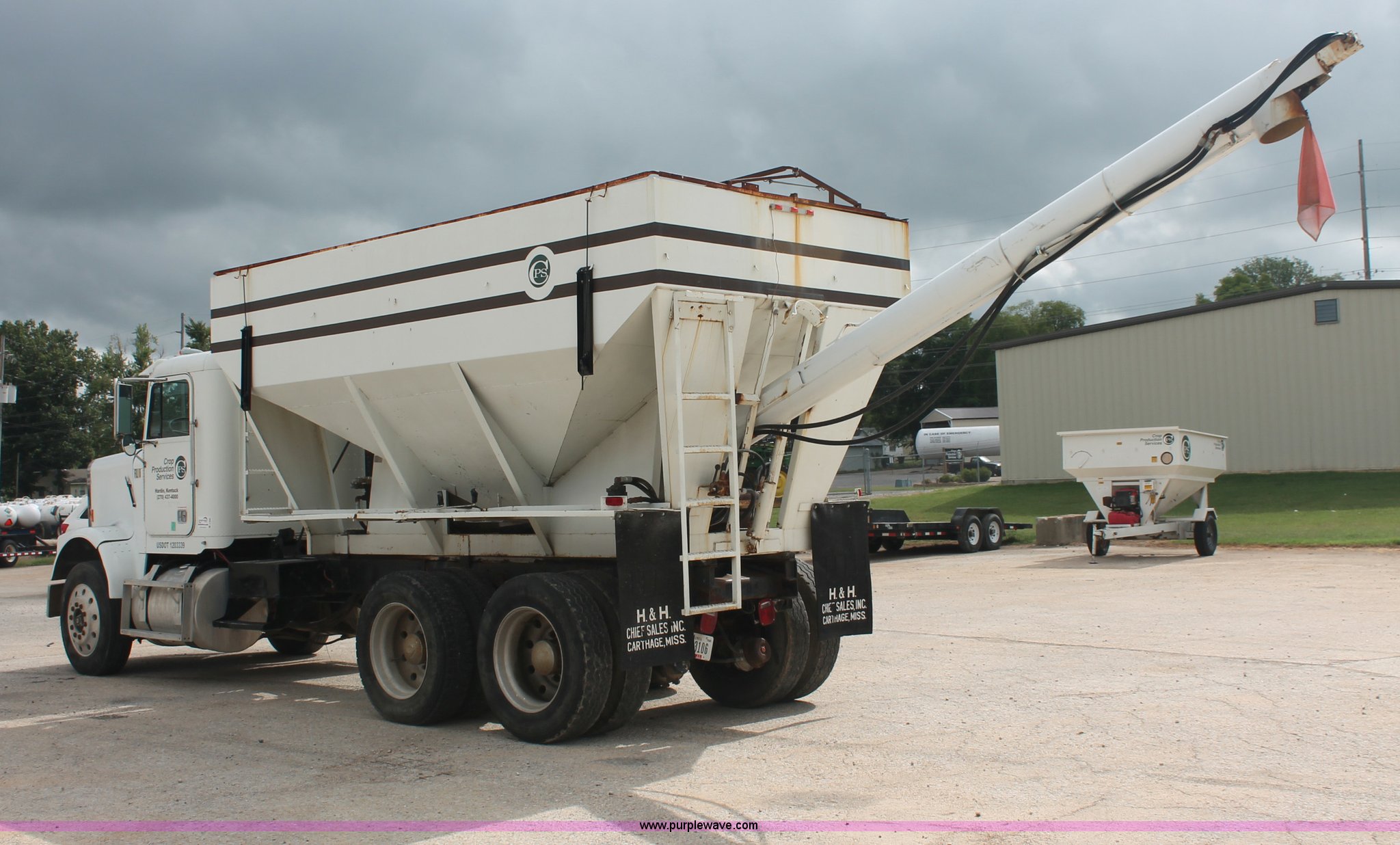 Purple Wave is selling a used Fertilizer or Feed Delivery Truck in Tennessee. This item is a 1986 Freightliner Conventional FLC120-64T fertilizer tender truck with the following: 219,598 miles on odometer, Cummins 14.0L L6 diesel engine, Fuller Road Ranger nine speed manual transmission, Twin screw, Differential lock, AC and heat, AM/FM/Cassette, Heated mirrors, Air seat, Highway Equipment LT16 16' tender bed, 10" diameter auger, (2) access ladders, Hydraulic toggle single stick operation, Serial 97124, Visor, Bumper, Block heater, Single rear exhaust stack, PTO, Wet kit, Spring suspension, Air brakes, 212" wheelbase, 275/80R24.5 tires, GVWR 50,000 lbs, FAWR 12,000 lbs, IAWR 19,000 lbs, RAWR 19,000 lbs, Unit# 44164