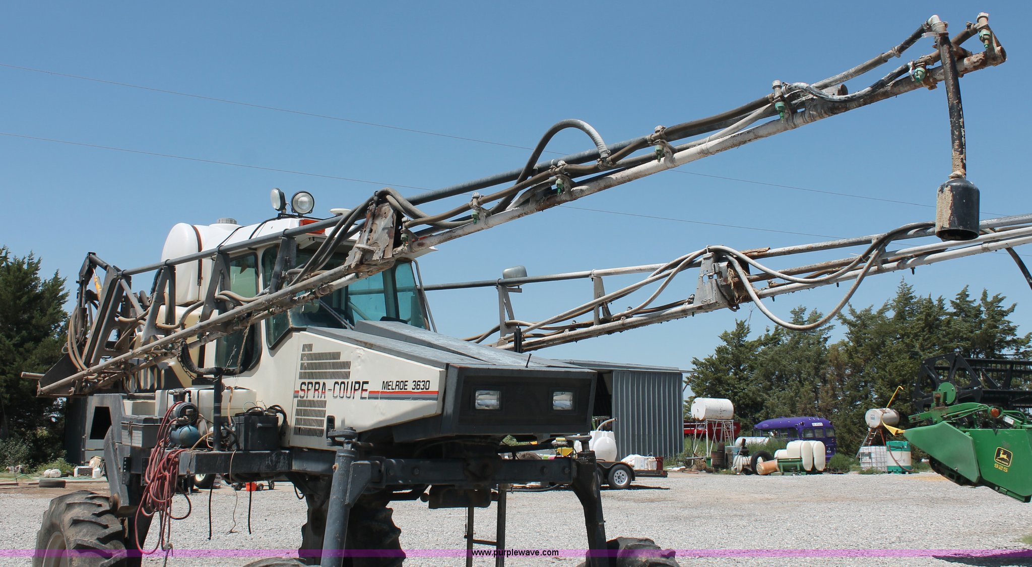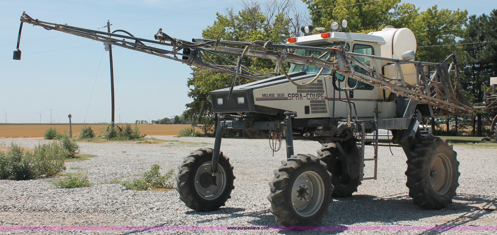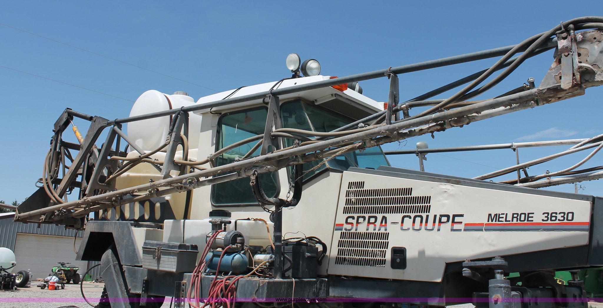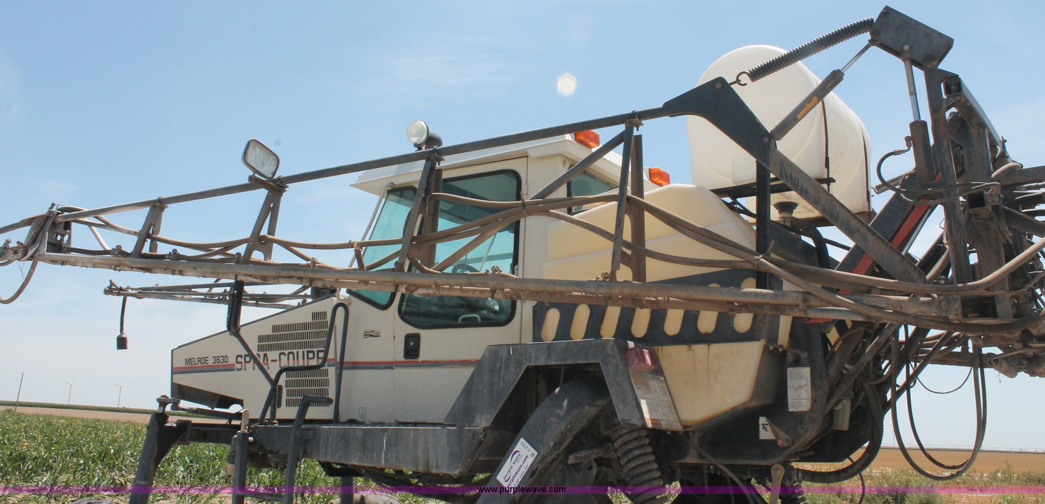 Purple Wave is selling a used Applicator Self Propelled in Kansas. This item is a 1992 Melroe 3630 SpraCoupe self propelled sprayer with the following: 3,336 hours on meter, Peugeot 2.1L four cylinder diesel engine, 95 HP, Five speed manual transmission, AC and heat, AC compressor locked up, AM/FM/Cassette, Work lights, EZ-Steer, Trimble EZ-Guide Plus GPS, Trimble light bar, Hydraulic axle width adjust, 60' boom width, (5) boom sections, Shut-off valves, Single nozzle bodies, 20" nozzle spacing, 60 gallon rinse tank, 300 gallon induction tank, Hydraulic height adjust, Hydraulic boom fold, Foam marker, 12.4-24 front tires, 14.9-28 rear tires, Operation manual, Serial 209411019