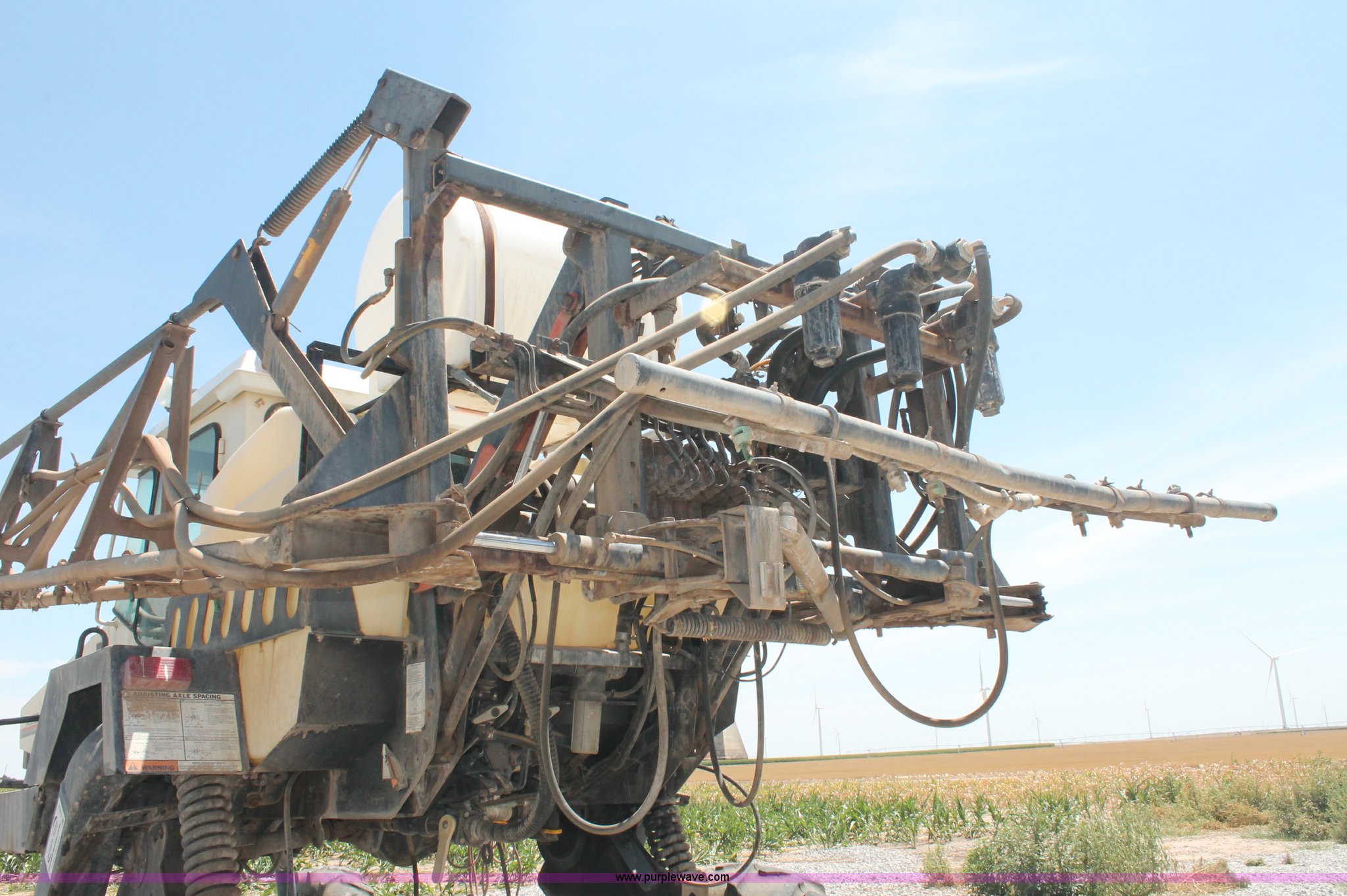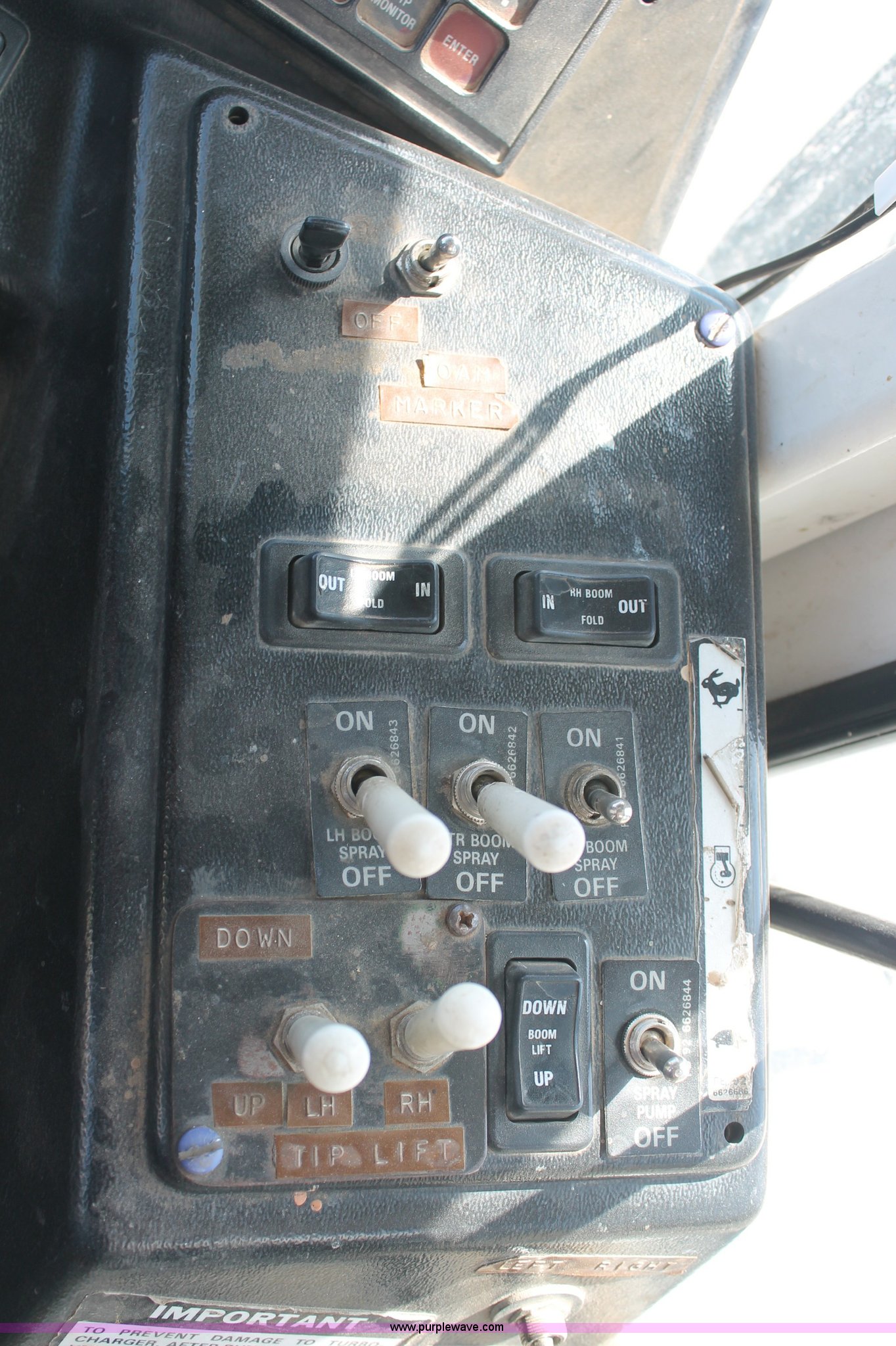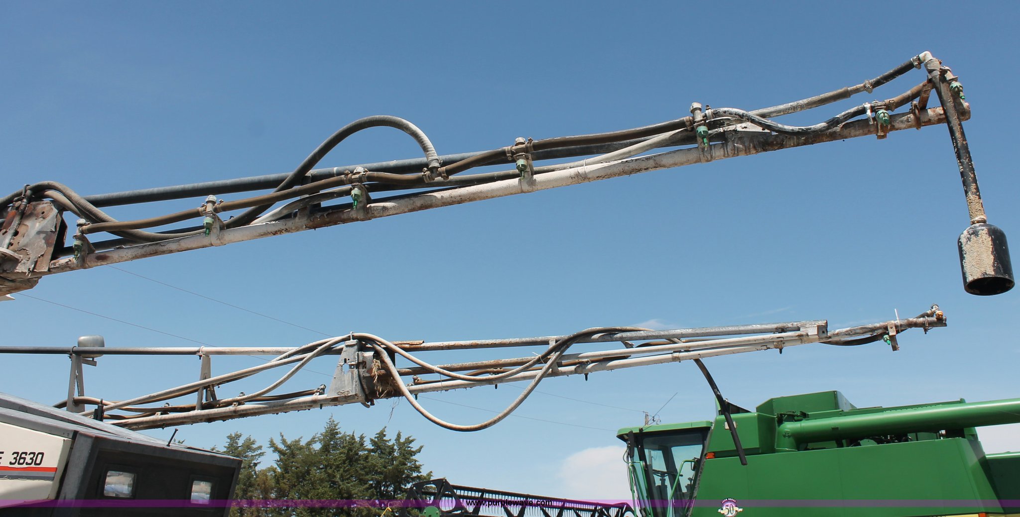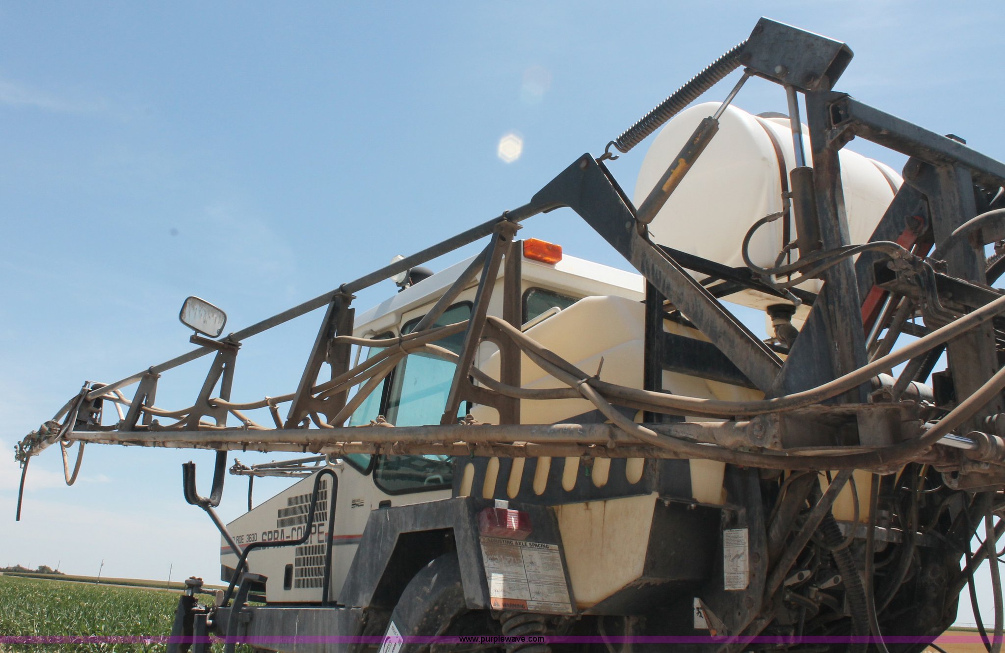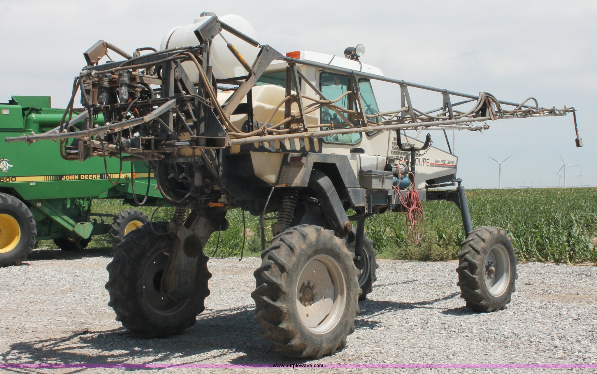 Purple Wave is selling a used Applicator Self Propelled in Kansas. This item is a 1992 Melroe 3630 SpraCoupe self propelled sprayer with the following: 3,336 hours on meter, Peugeot 2.1L four cylinder diesel engine, 95 HP, Five speed manual transmission, AC and heat, AC compressor locked up, AM/FM/Cassette, Work lights, EZ-Steer, Trimble EZ-Guide Plus GPS, Trimble light bar, Hydraulic axle width adjust, 60' boom width, (5) boom sections, Shut-off valves, Single nozzle bodies, 20" nozzle spacing, 60 gallon rinse tank, 300 gallon induction tank, Hydraulic height adjust, Hydraulic boom fold, Foam marker, 12.4-24 front tires, 14.9-28 rear tires, Operation manual, Serial 209411019