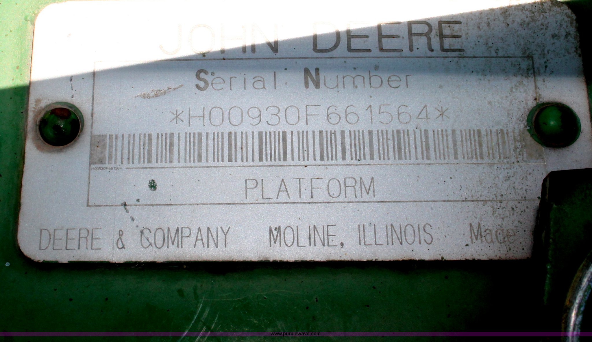 Purple Wave is selling a used Platform or Stripper Head in Kansas. This item is a John Deere 930 30' flex header with the following: Tine reel, Full finger auger, Hydraulic fore/aft, Stubble lights, Recently replaced poly skid plates, Serial H00930F661564