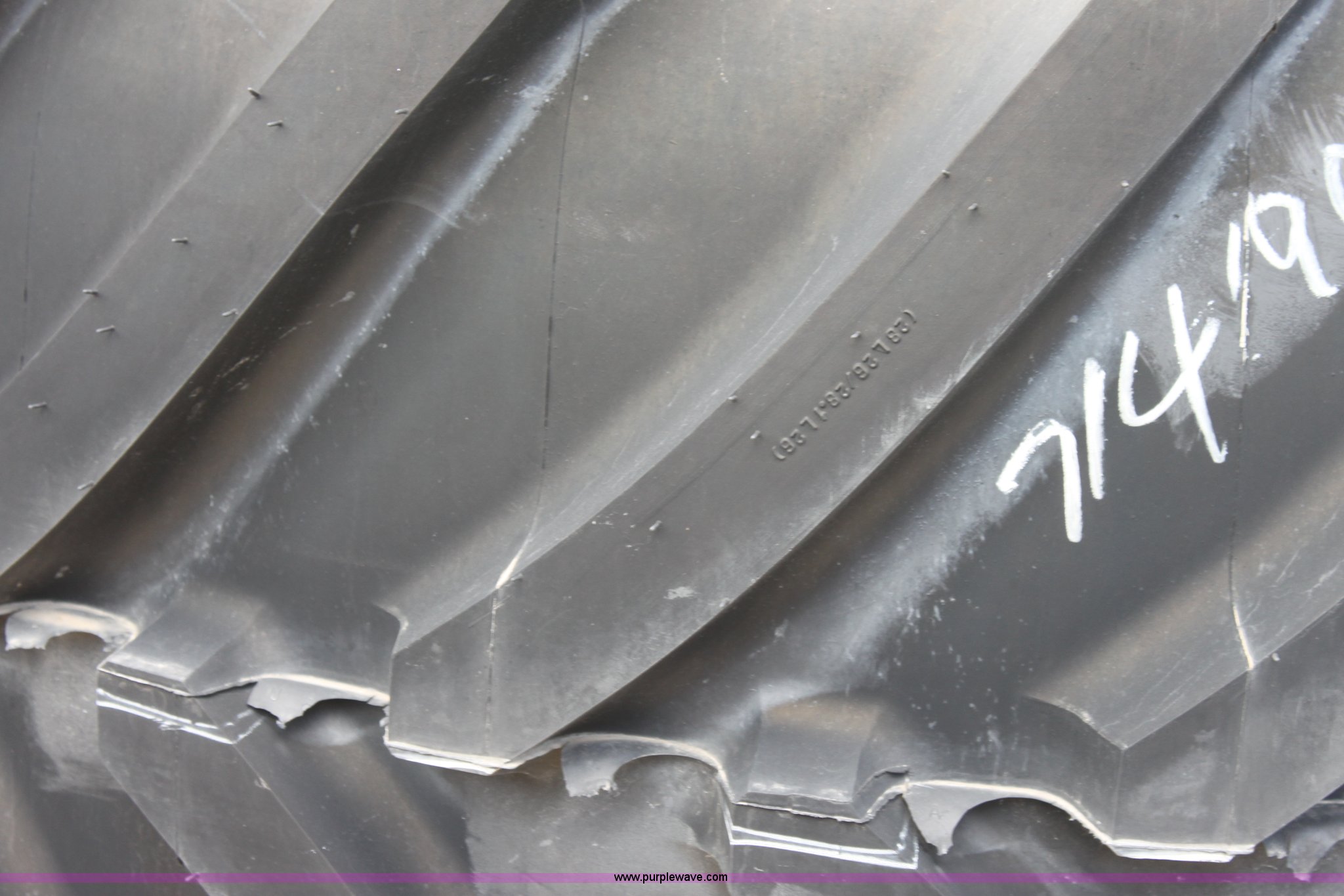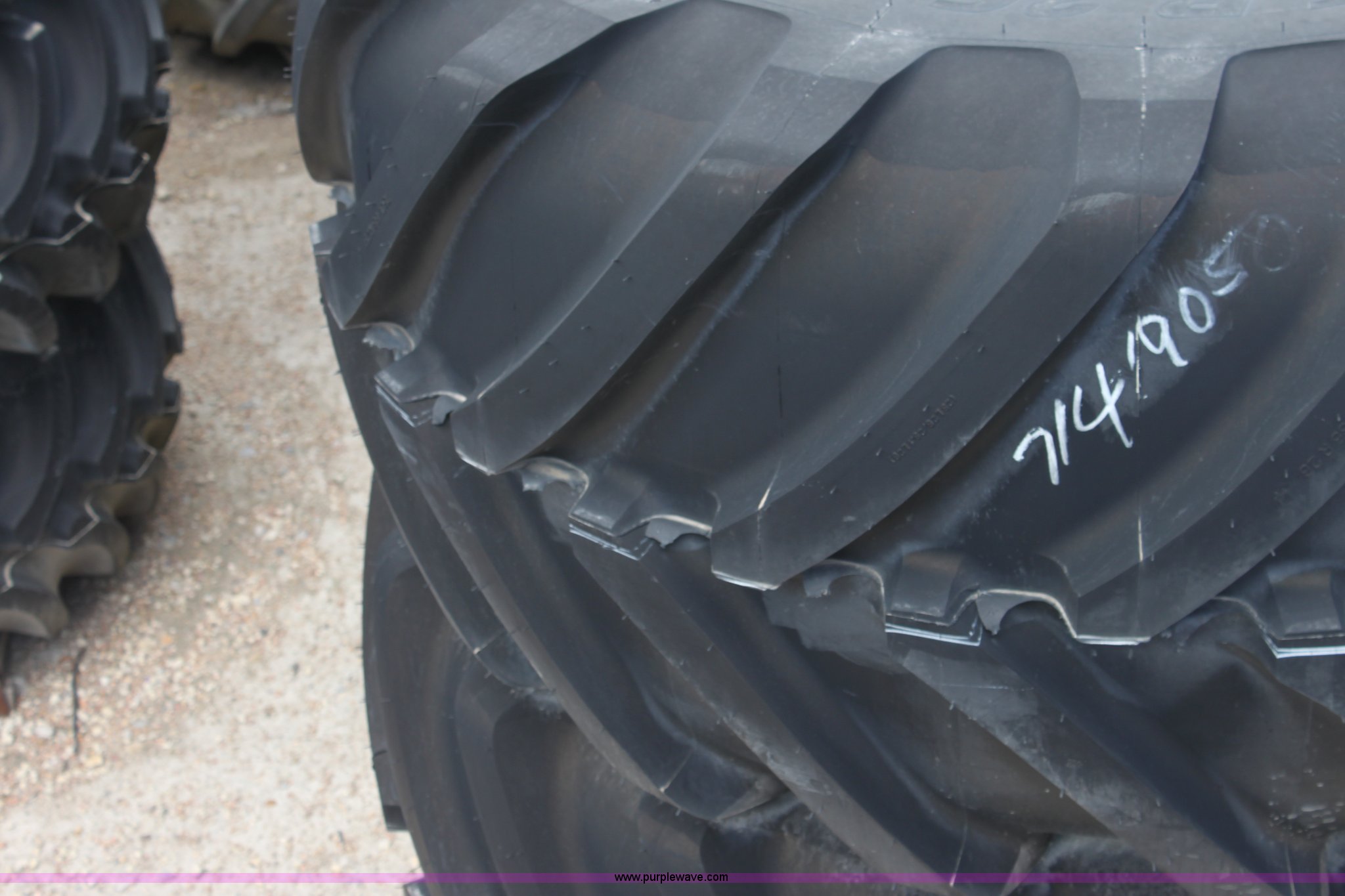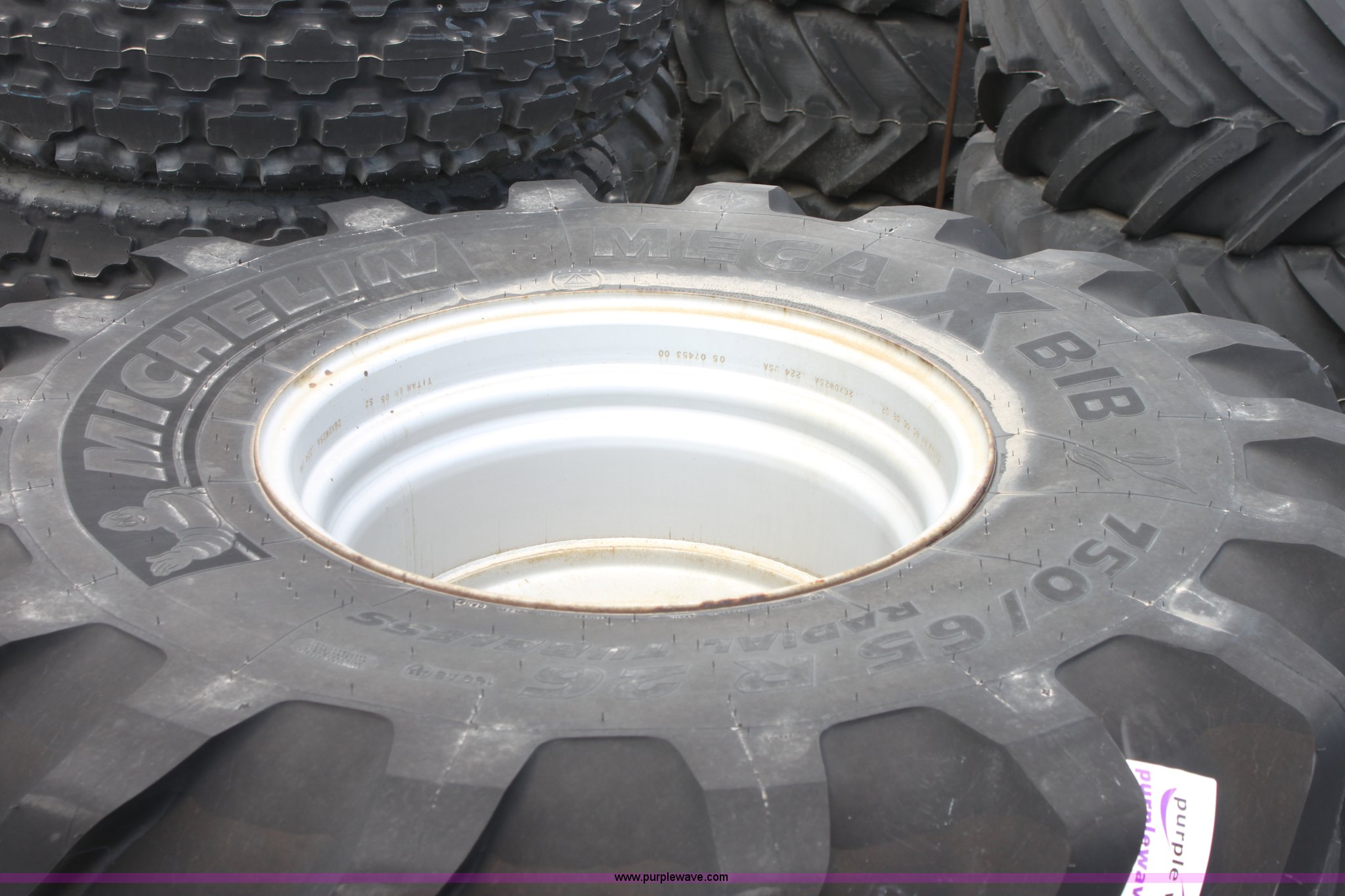 Purple Wave is selling a used Industrial Tires or Tracks in Kansas. This item is a (2) Michelin Mega X 750/65R26 tires with the following: 10 lug, 13 3/16" bolt center, 71419055/0