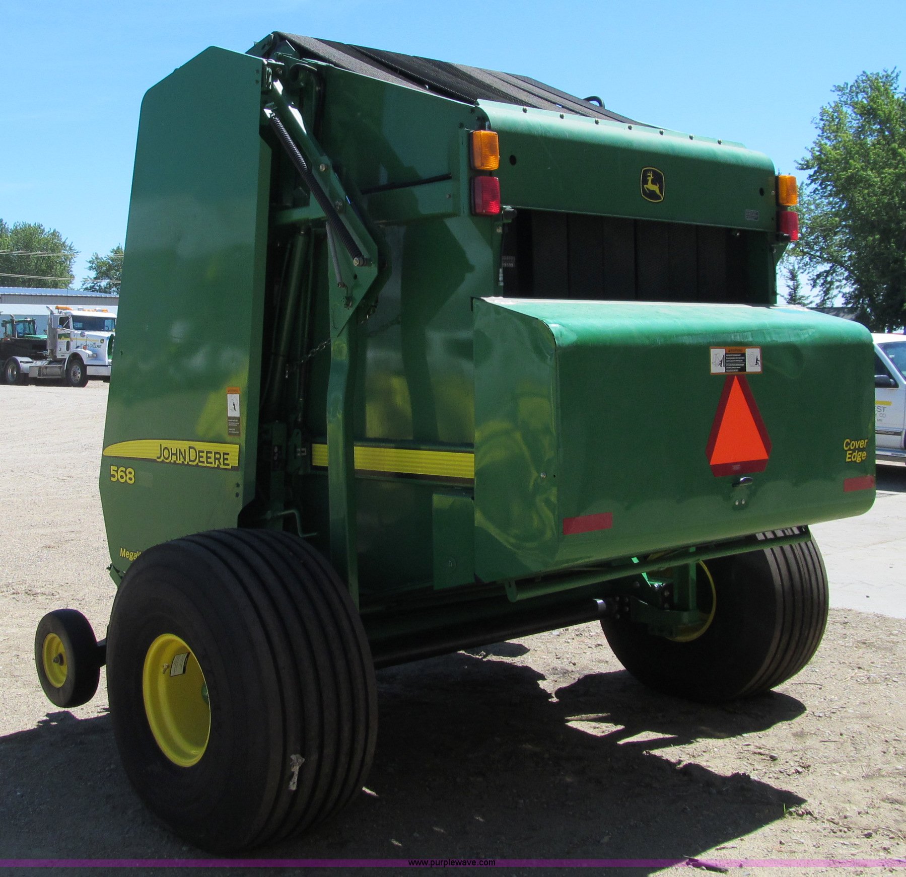 Purple Wave is selling a used Round Baler in Minnesota. This item is a 2009 John Deere 568 round baler with the following: Megawide Plus pickup, Push bar, Cover-edge surface wrap, Hydraulic pickup, High moisture kit, Variable core valve, Bale-Trak PRO monitor-controller, 9,058 bales produced, Small 1000 PTO, PTO shaft included, 21.5x16 tires, Unused, Serial E00568X358203