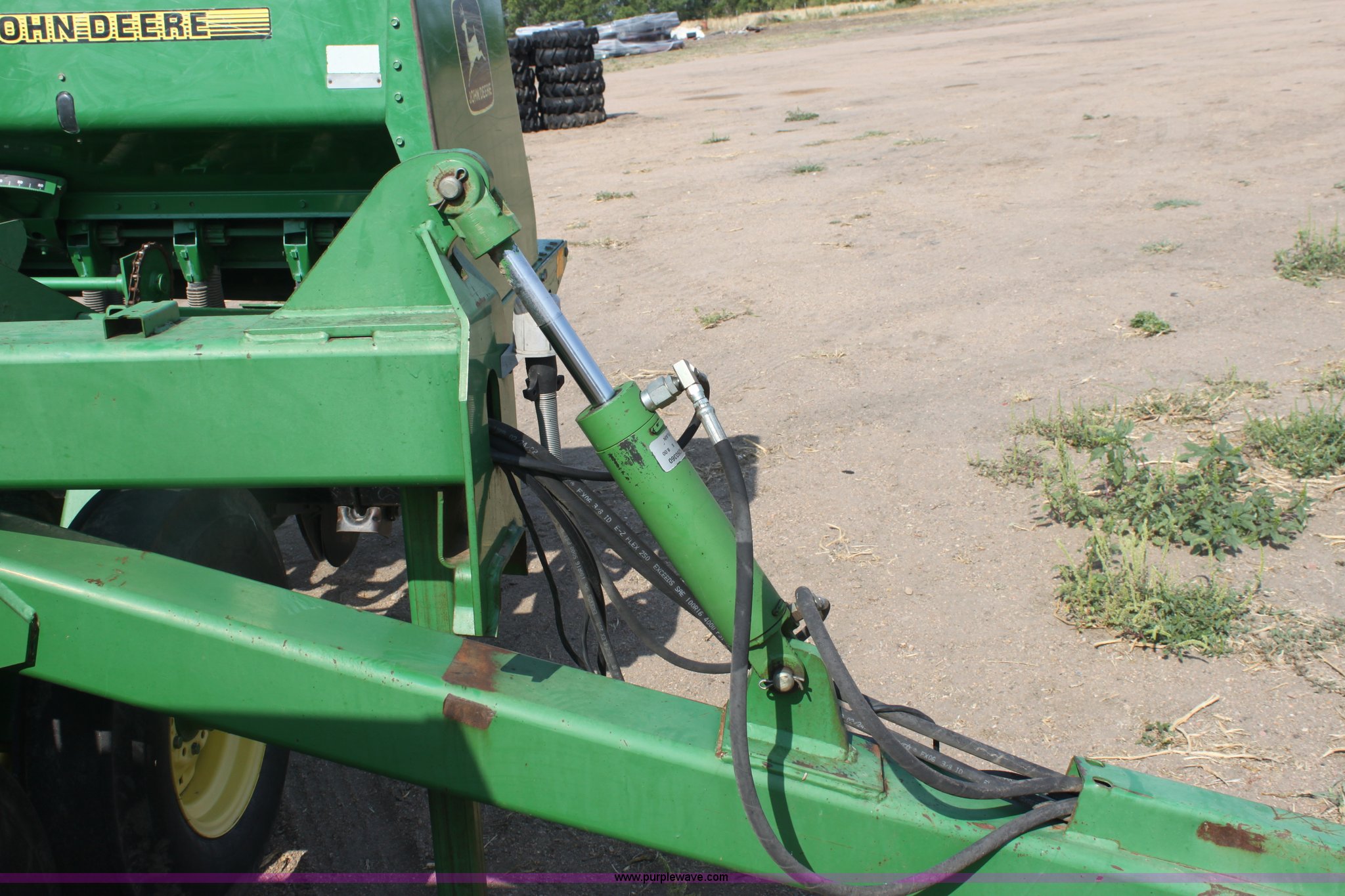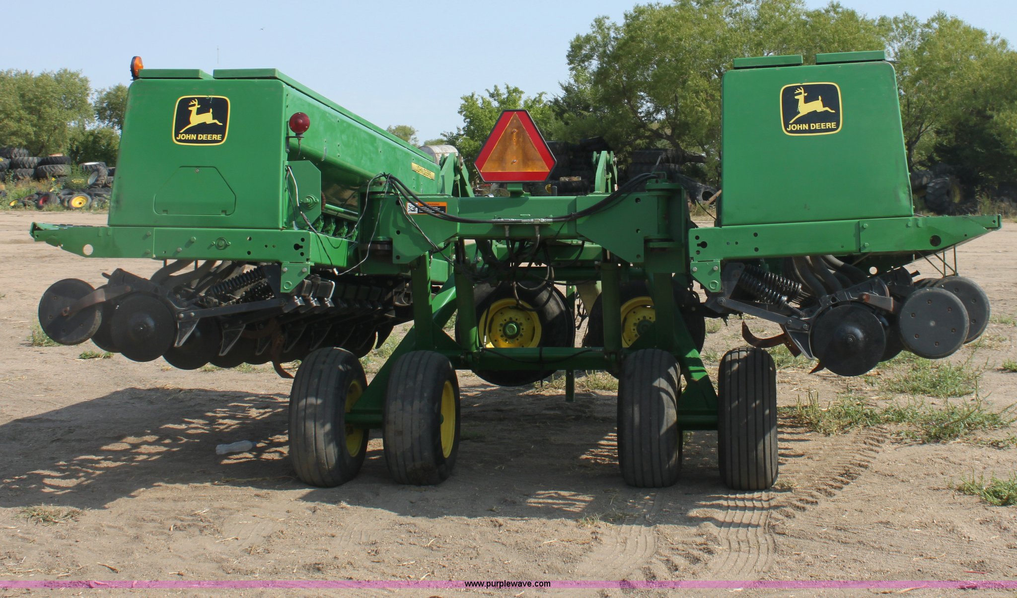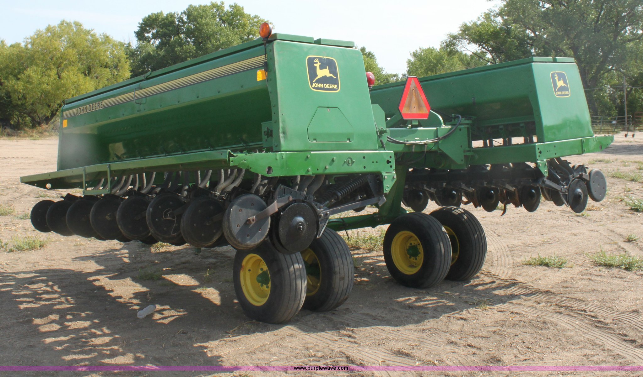 Purple Wave is selling a used Grain Drill or Seeder in Kansas. This item is a John Deere 455 drill with the following: (30) rows, 25'L toolbar, 10" row spacing, Double disk openers, Hydraulic folding wings, Bulk fill, Mechanical delivery, Mechanical meters, Ground driven meter system, 12" press wheels, Adjustable pin hitch, 11L-15 tires, Serial N00455H004210