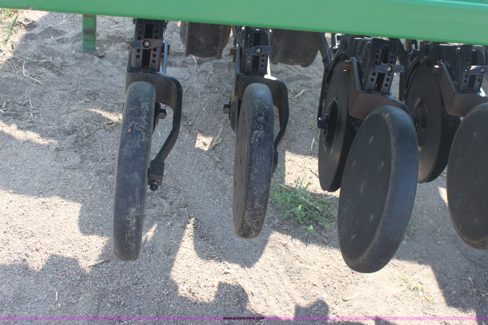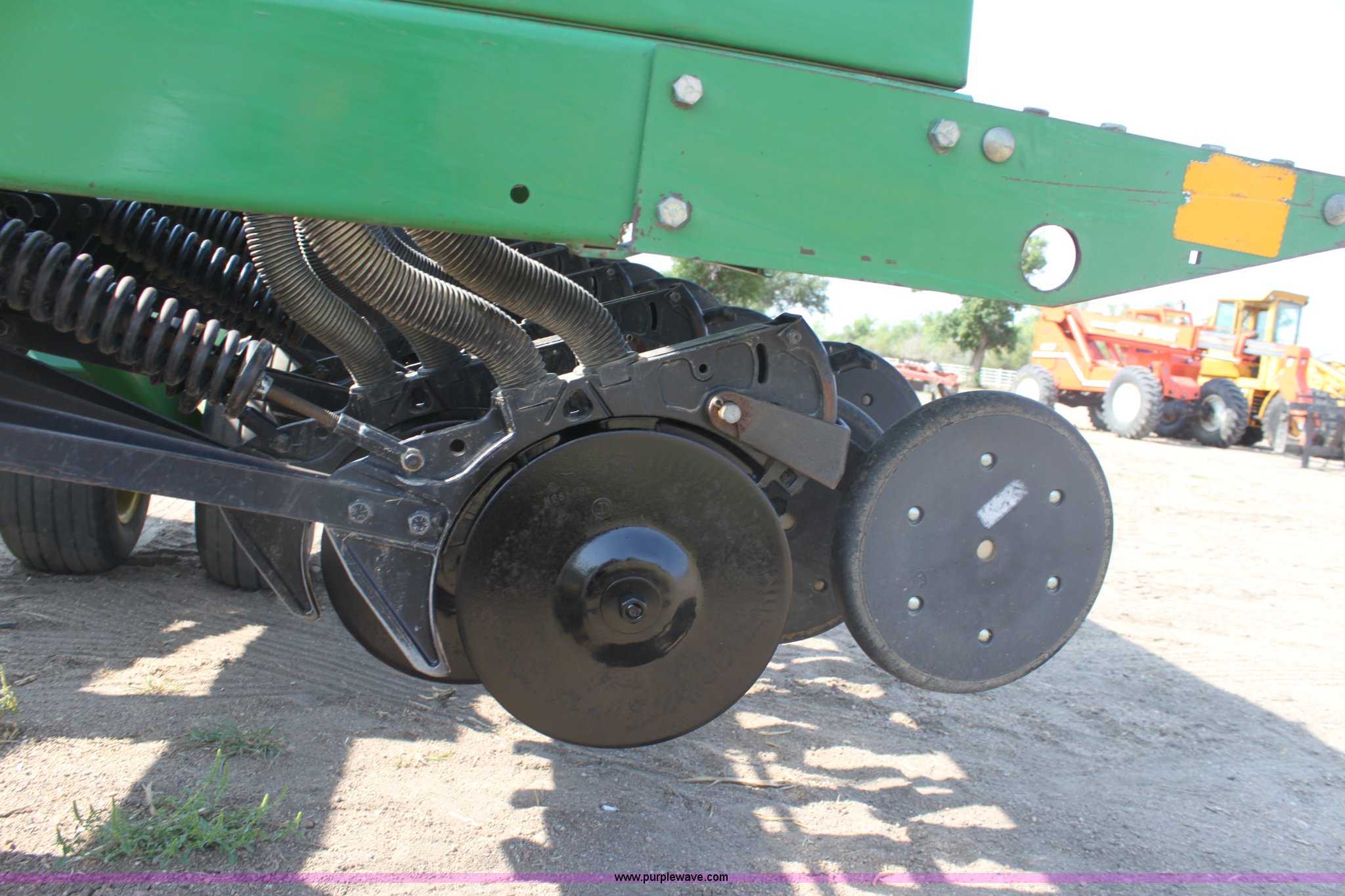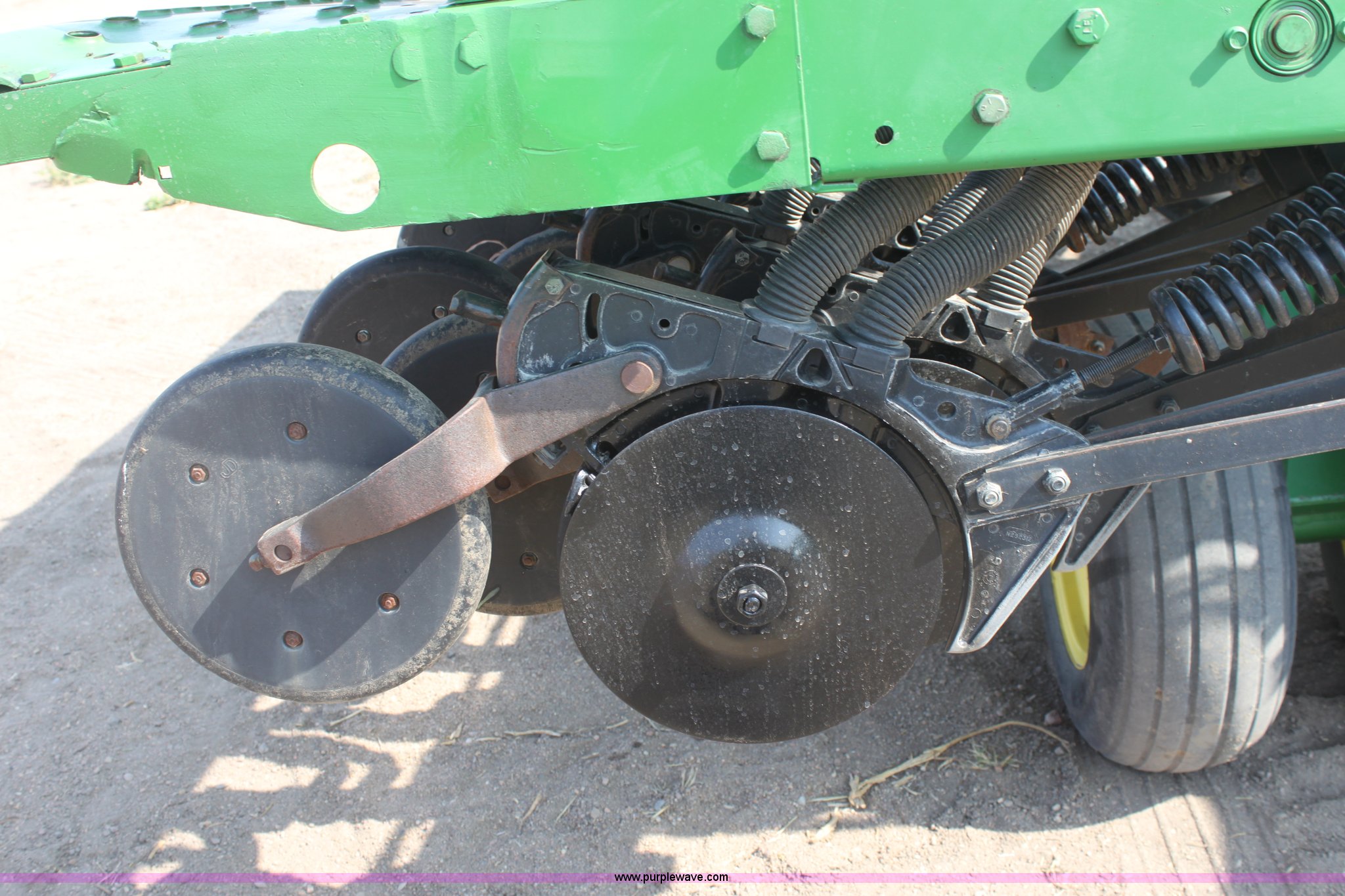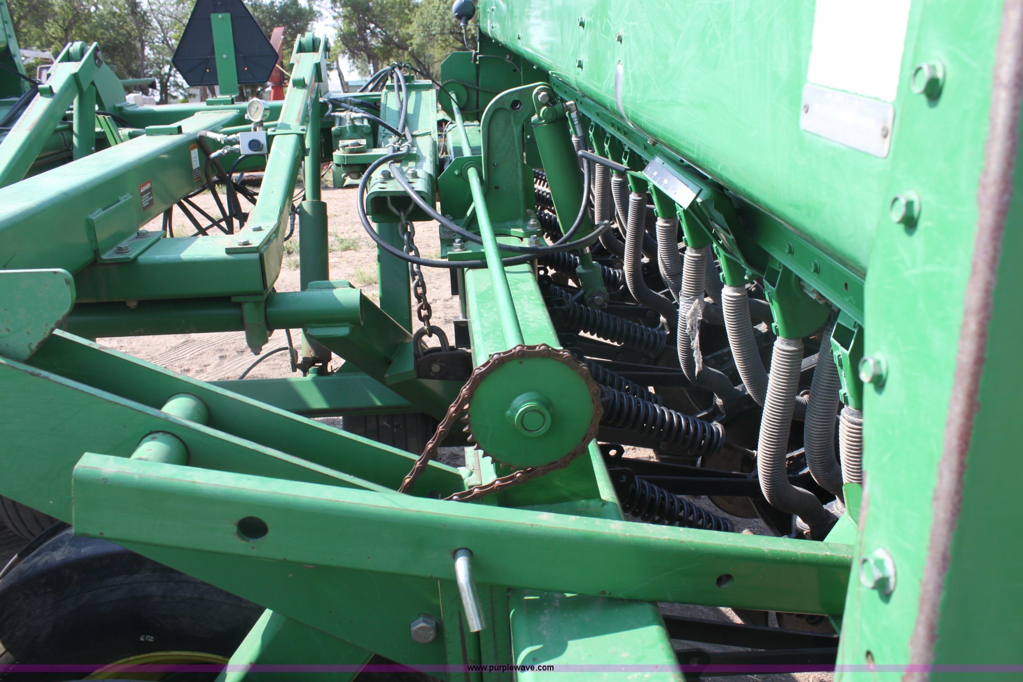 Purple Wave is selling a used Grain Drill or Seeder in Kansas. This item is a John Deere 455 drill with the following: (30) rows, 25'L toolbar, 10" row spacing, Double disk openers, Hydraulic folding wings, Bulk fill, Mechanical delivery, Mechanical meters, Ground driven meter system, 12" press wheels, Adjustable pin hitch, 11L-15 tires, Serial N00455H004210
