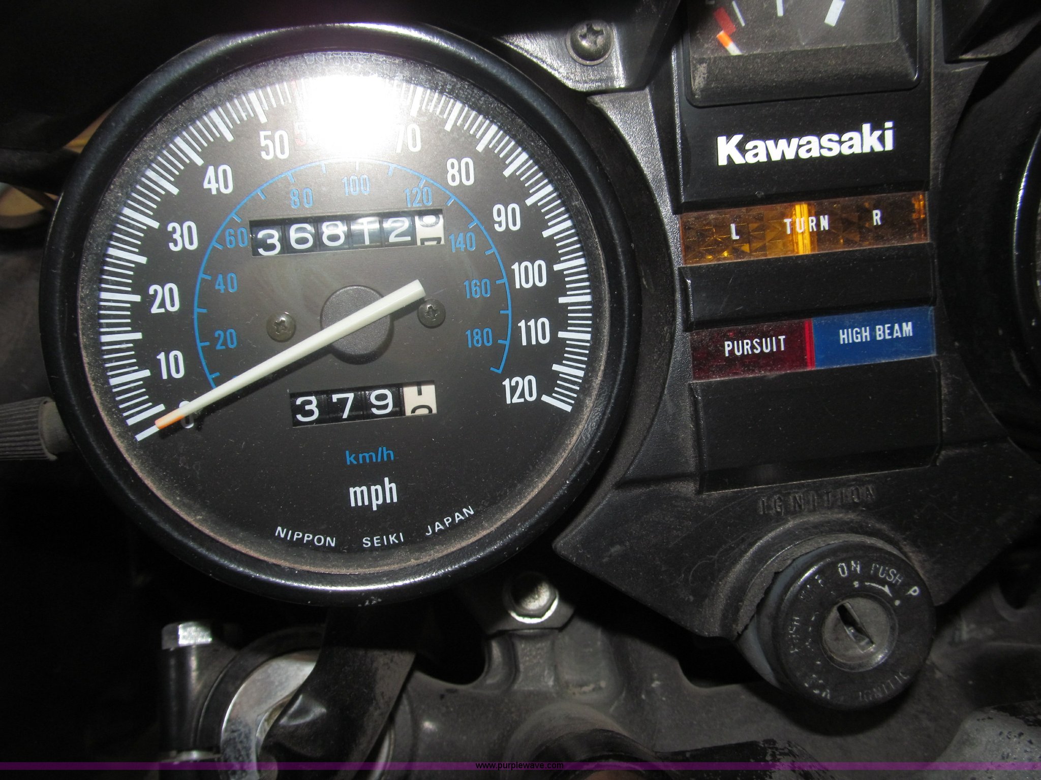 Purple Wave is selling a used Motorcycle in Nebraska. This item is a 1996 Kawasaki 1000 motorcycle with the following: 36,812 miles on odometer, 1,000 cc four cylinder DOHC gas engine, Five speed transmission, Fiberglass fairing with windshield and storage, Hi-way bars, Hard saddle bags with bracket, Operator footboards, Lockable fuel tank, Dual chrome exhaust, Chain drive, Disk brakes, Front dual hydraulics, Rear single disk, Dunlop MN90-18 M/G 65H front tires, Dunlop K327MG rear tire, 596 lbs curb weight, 90.2" overall length, 6.3" ground clearance, Clutch needs work, Police options disconnected