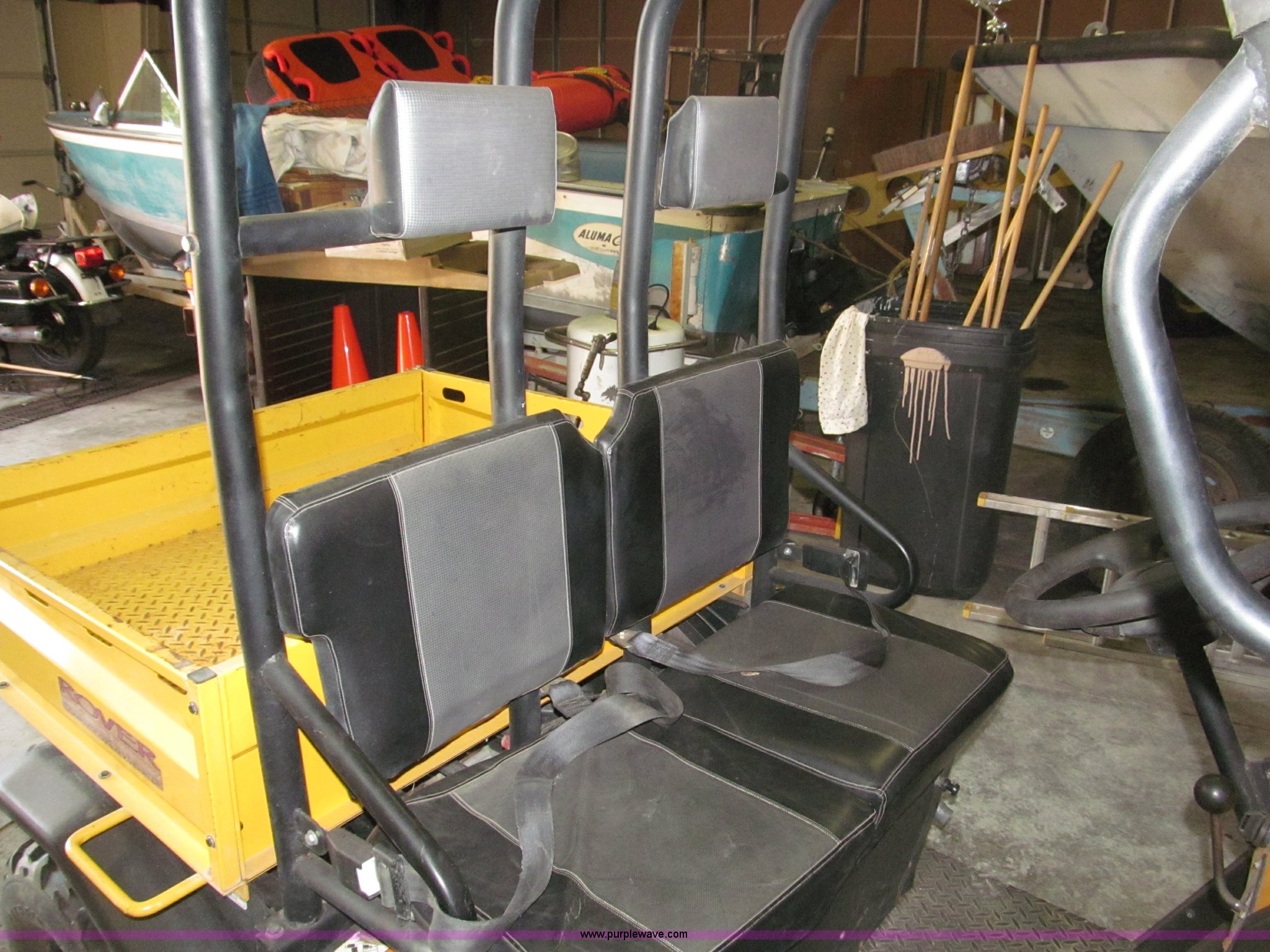 Purple Wave is selling a used Utility Vehicle in Nebraska. This item is a 2003 Yerf-dog Rover utility vehicle with the following: 614 hours on meter, Model 34800, Roll cage, Seat belts, Headlights, Spotlight, 37.5" x 45" dump bed, Electric over hydraulic, Winch, Receiver hitch, Max tongue weight 125 lbs, Chain drive, 22x9-10 front tires, 22x11.00-8 rear tires, Dented tailgate, Passenger seat loose, Serial 025172003