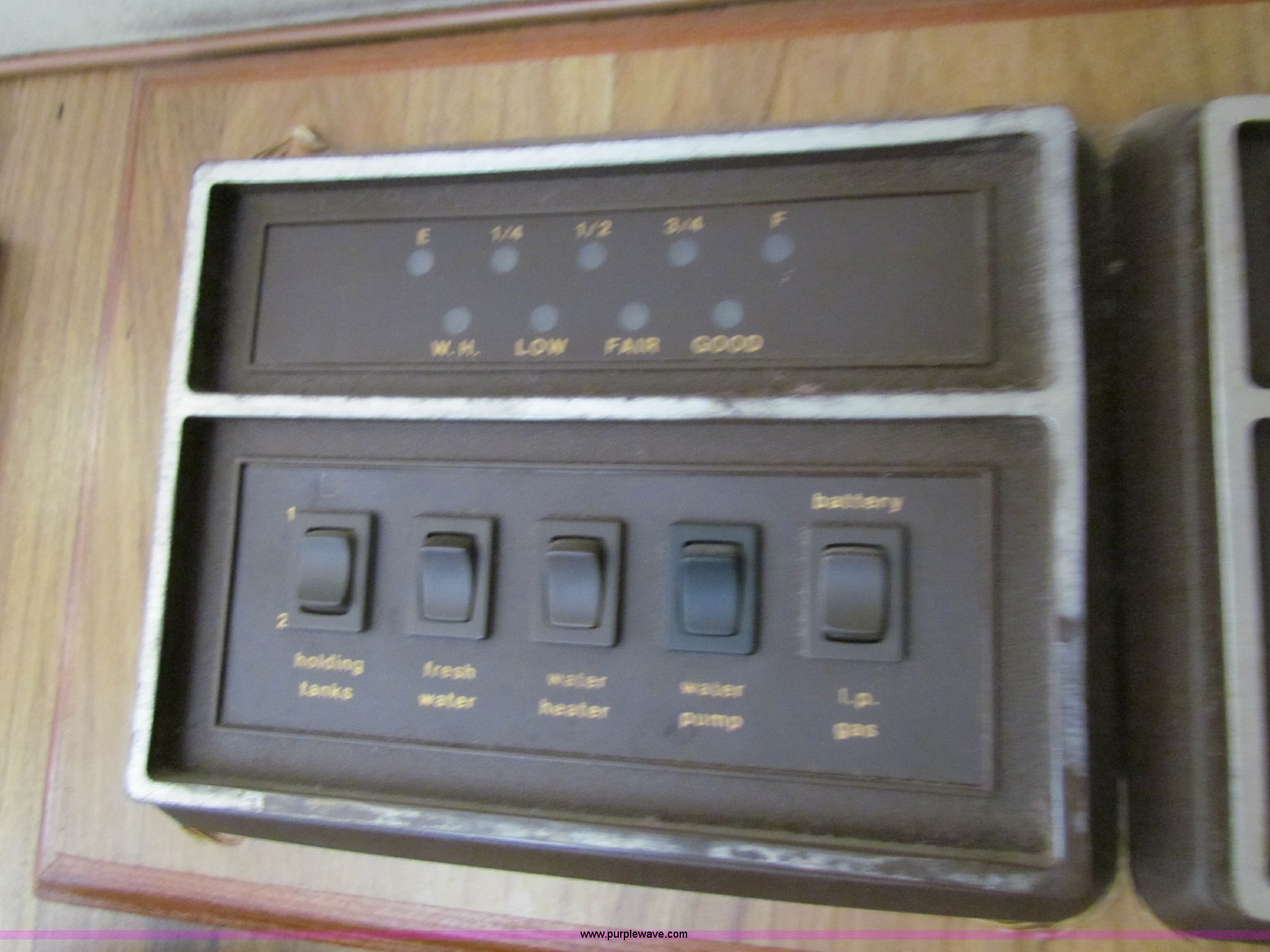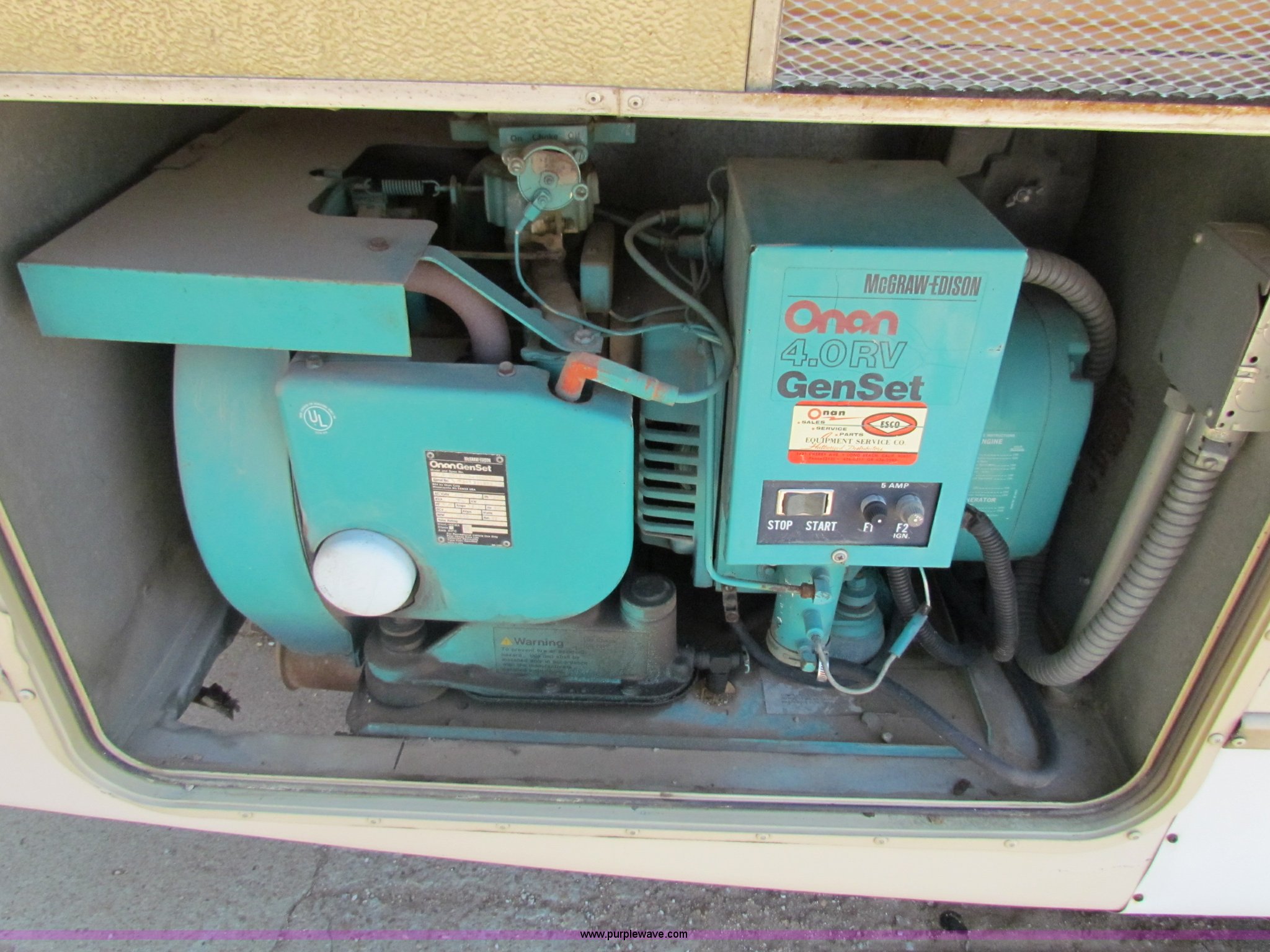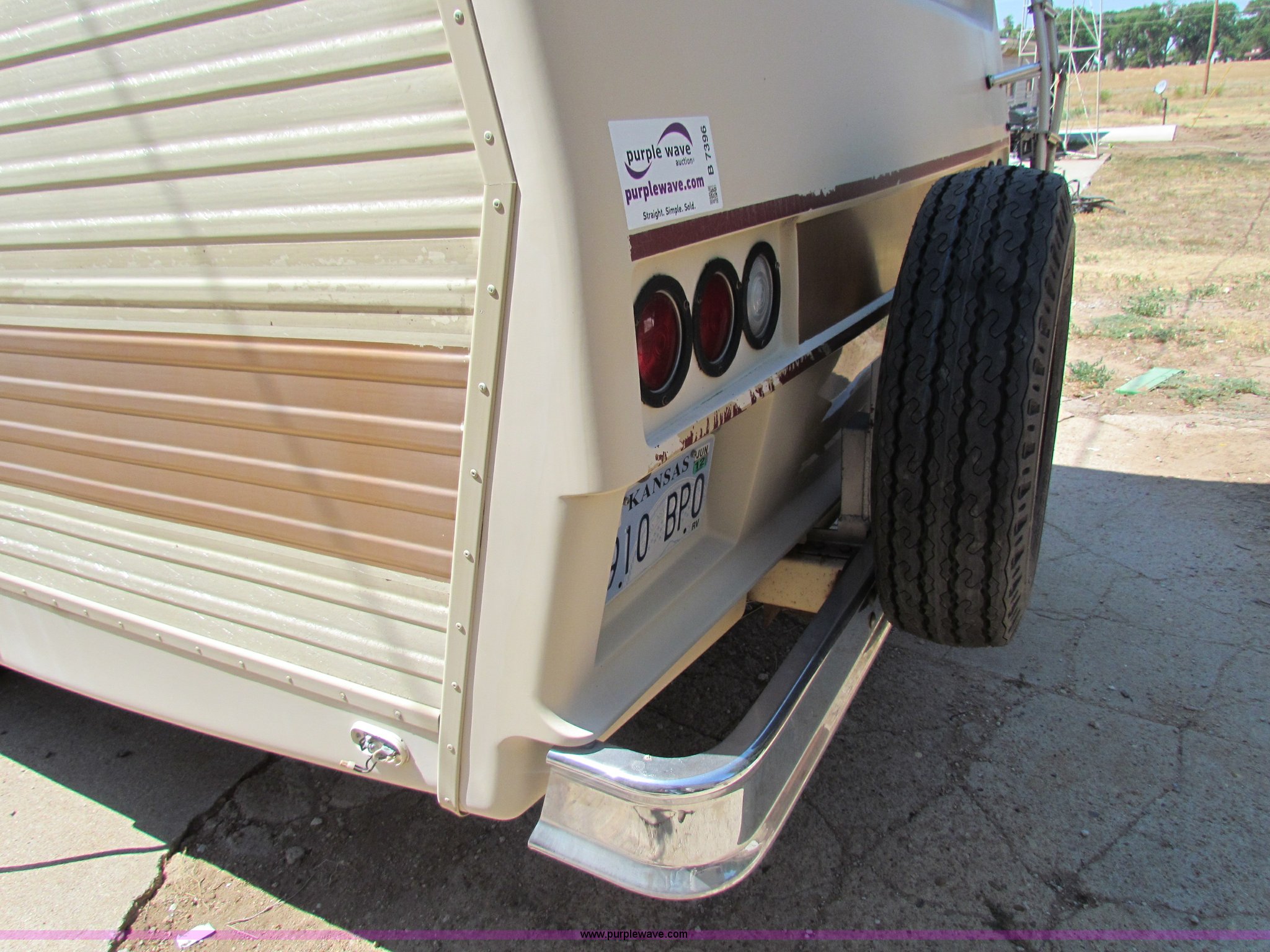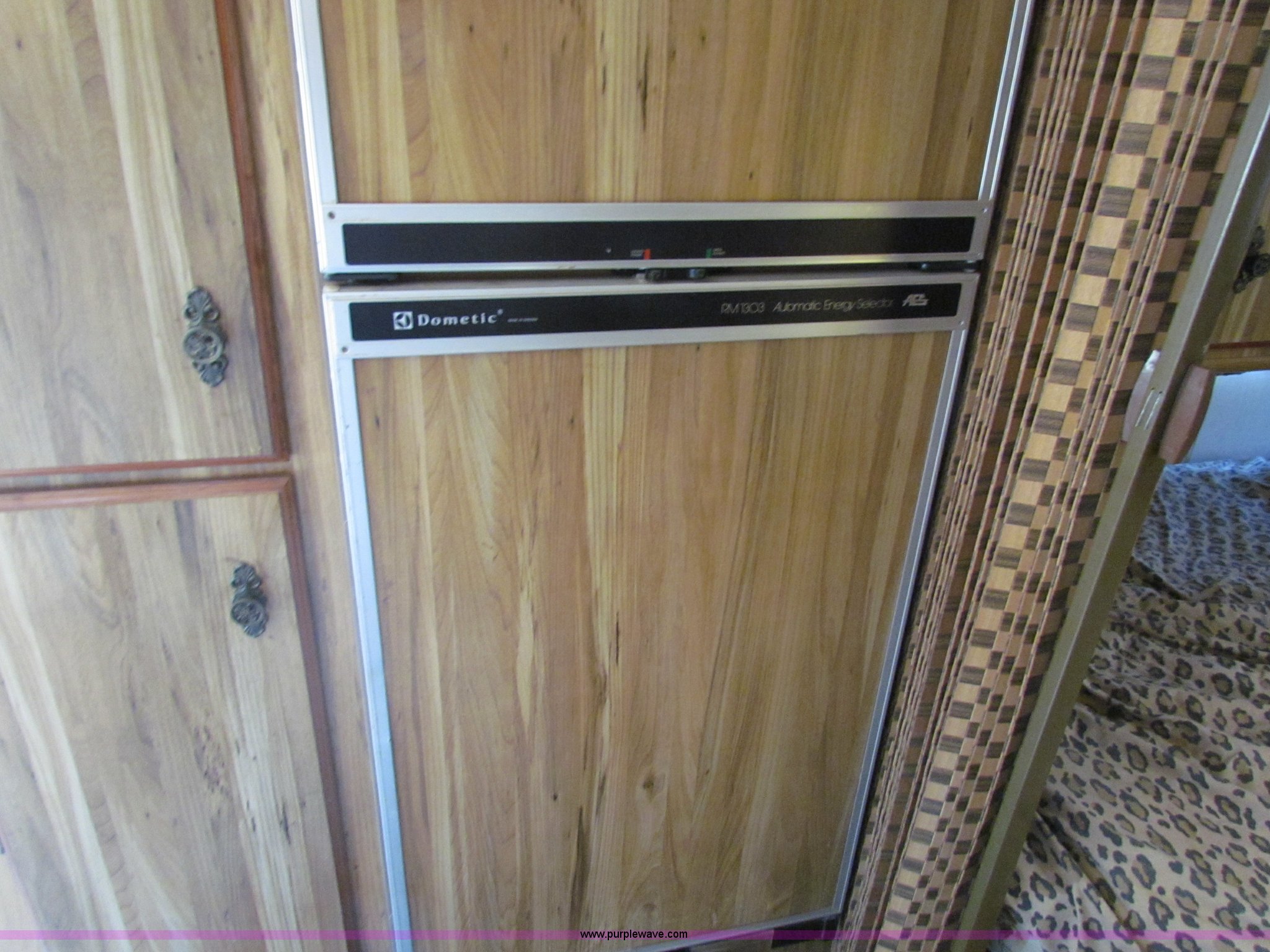 Purple Wave is selling a used RV in Kansas. This item is a 1985 Ford E350 Jamboree RV camper with the following: 57,578 miles on odometer, 7.5L V8 gas engine, Automatic transmission, Tilt, Cruise, Sleeps six, 12' awning, (2) holding tanks, DC or propane water heater, Unknown working condition, Jensen exhaust fan, Duo-therm Briskair roof top AC, Blows cold, Magic Chef oven and microwave, Non-operational, Dometic RM1303 refrigerator, Automatic energy selector, Non-operational, Onan GenSet generator, 4.0 RV, 611 hours on meter, Serial H843811873, 176" wheelbase, 8.75R16.5 tires, GVWR 11,000 lbs, Recently replaced battery, Stored inside, Interior/exterior cosmetic damage