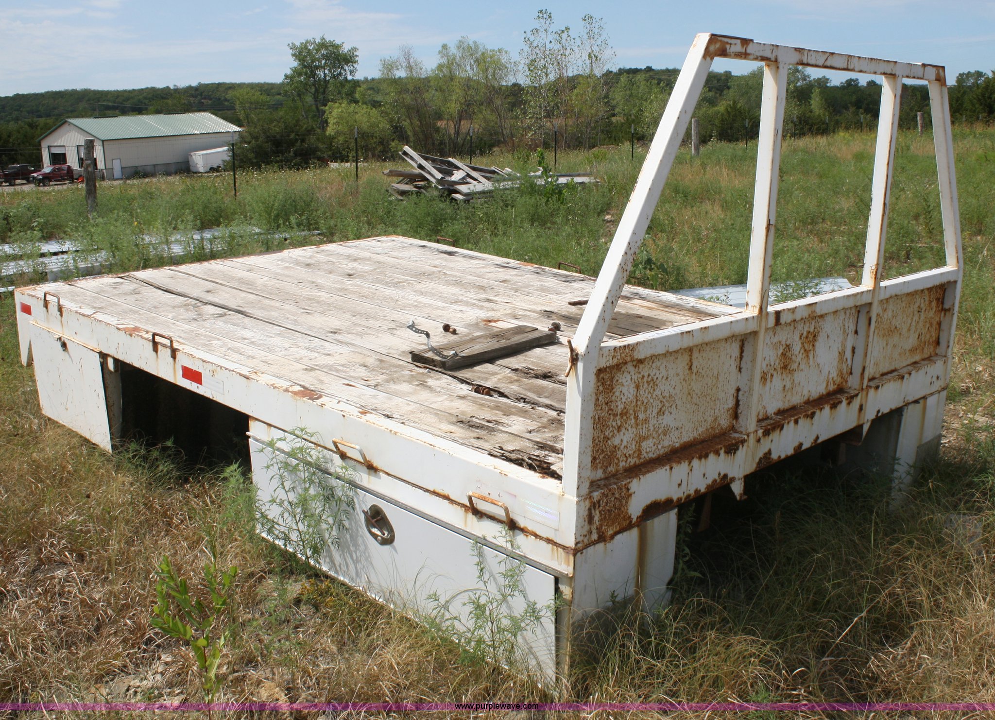 Purple Wave is selling a used Automotive Parts or Acces. in Kansas. This item is a 12'L x 8'W flatbed with the following: (4) under bed toolboxes, (2) 60", (2) 30", Wood floor has bad spots