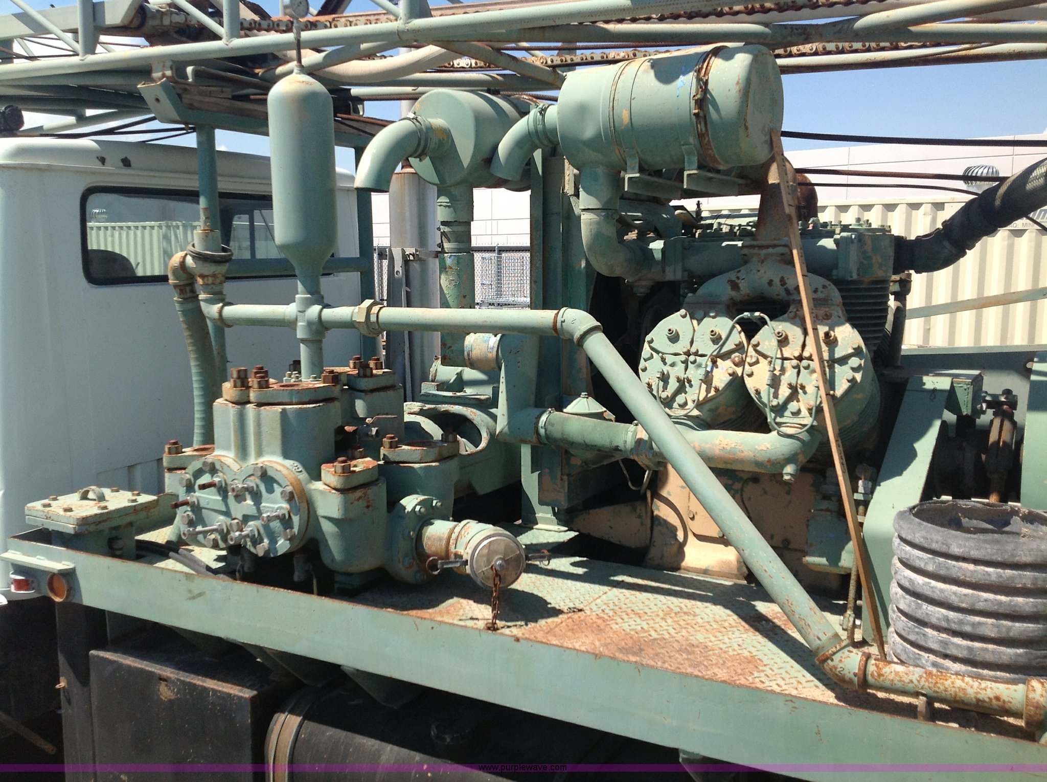 Purple Wave is selling a used Drilling Rig Truck in Nevada. This item is a 1991 International Navistar 8300 drill rig truck with the following: 320,831 miles on odometer, Cummins L10 10.0L L6 diesel engine, 270 HP, 1968 Gardner Denver 1000 drill rig, 5x6 Gardner Denver mud pump, Gardner Denver 7.5" retractable table, 5" insert included, 23' Kelly, 2 3/8" IF thread, Leroi SDS 256 dual stage compressor, Two cylinder Bean pump water injection, Hydraulic pull down, (4) leveling jacks, Breakout wrenches, Mechanical clutches, Tandem axle