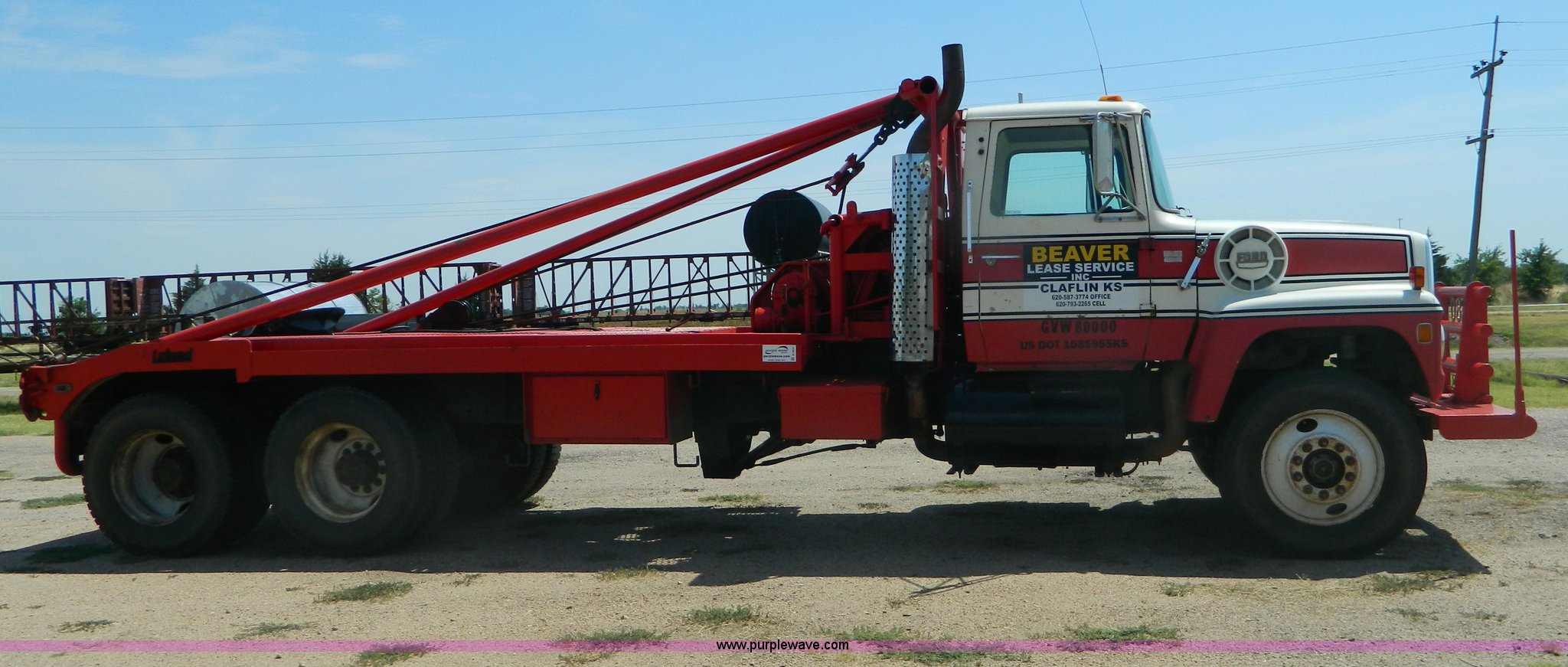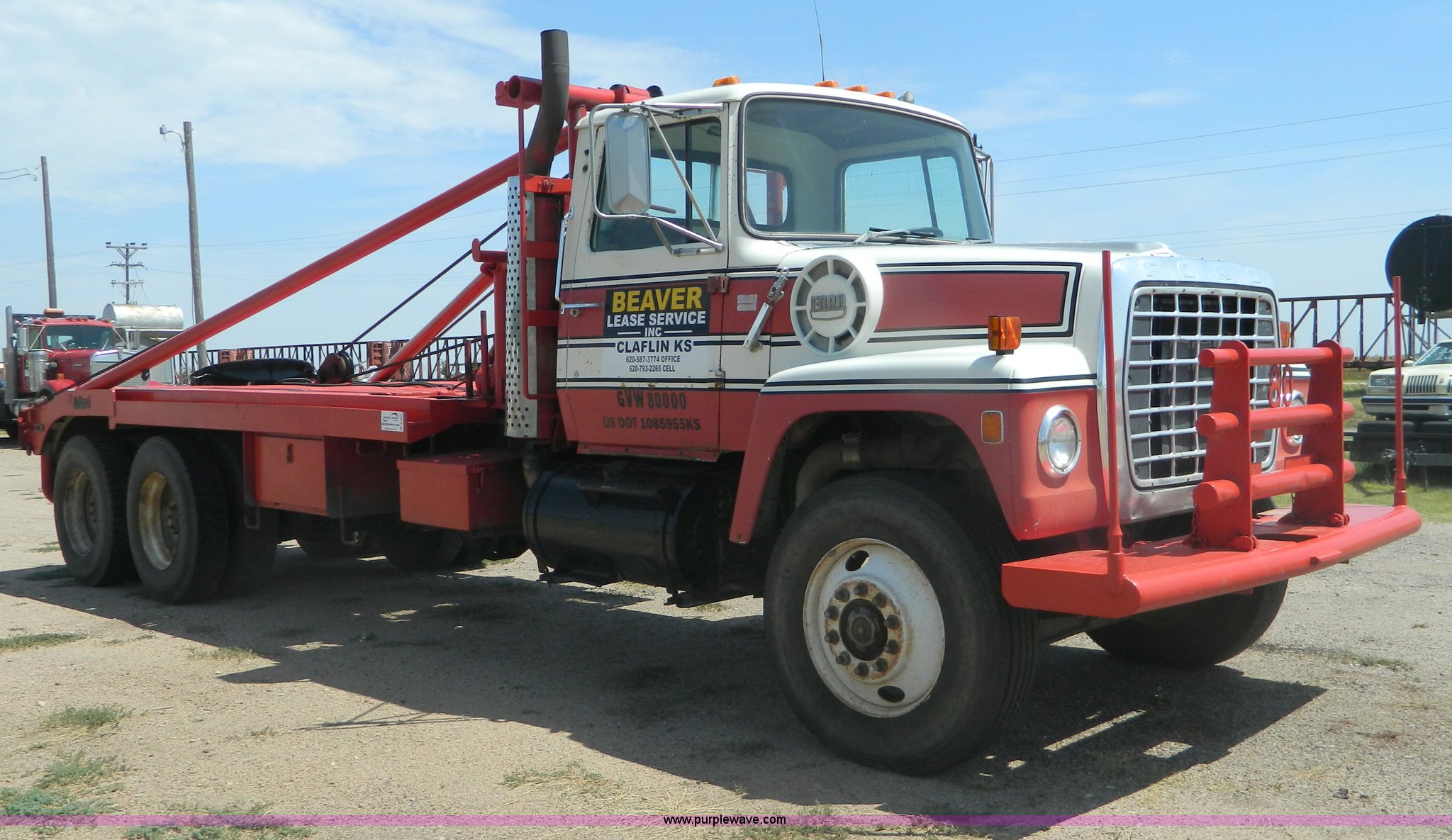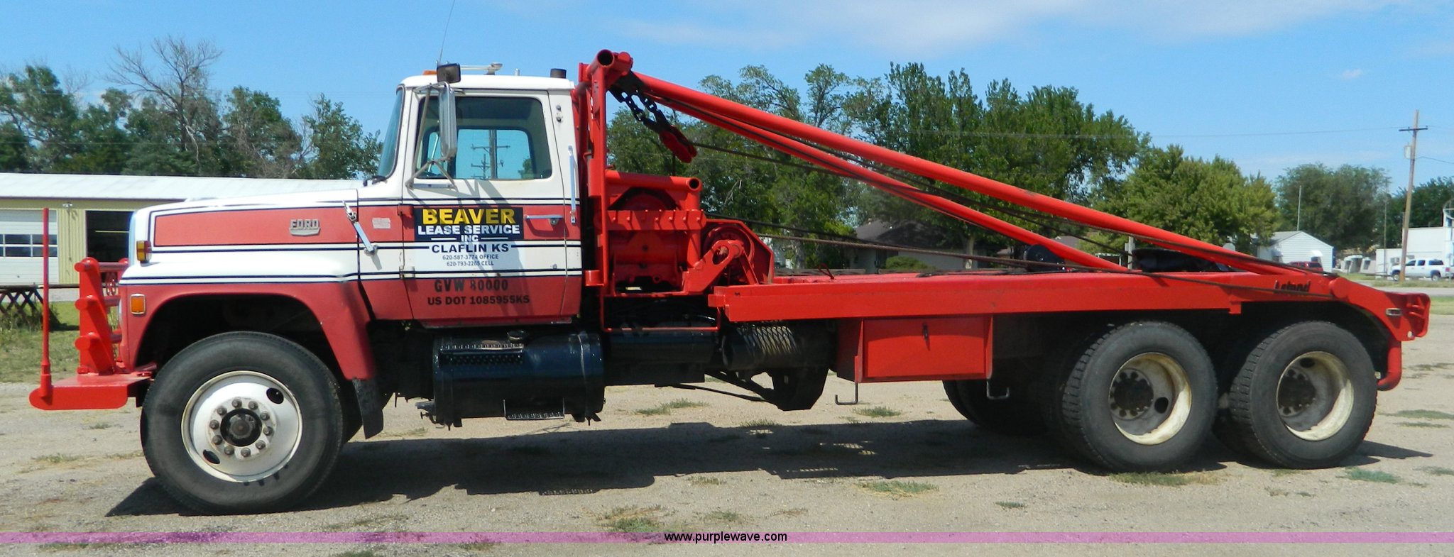 1979 Ford 9000 winch truck. 459,214 miles on odometer, Detroit 8V71T diesel engine Dead cylinder, needs overhauled, Road Ranger 13 speed transmission, Two speed auxiliary transmission, Tulsa 64 and 34 winches, Double framed, 257" wheelbase, 11R24.5 tires, FAWR 12,000 lbs, RAWR 38,000 lbs, Recently replaced rear brakes and drums, Recently replaced springs, bushings, steering box, and 7/8" cable on both winches, Recent repairs documented, Cracked windshield, Decals will be removed. Non-Highway title. U90NVAH3719. Shipping quotes available. Beaver Lease Service, Inc.. 701 Front St. Claflin, KS 67525
