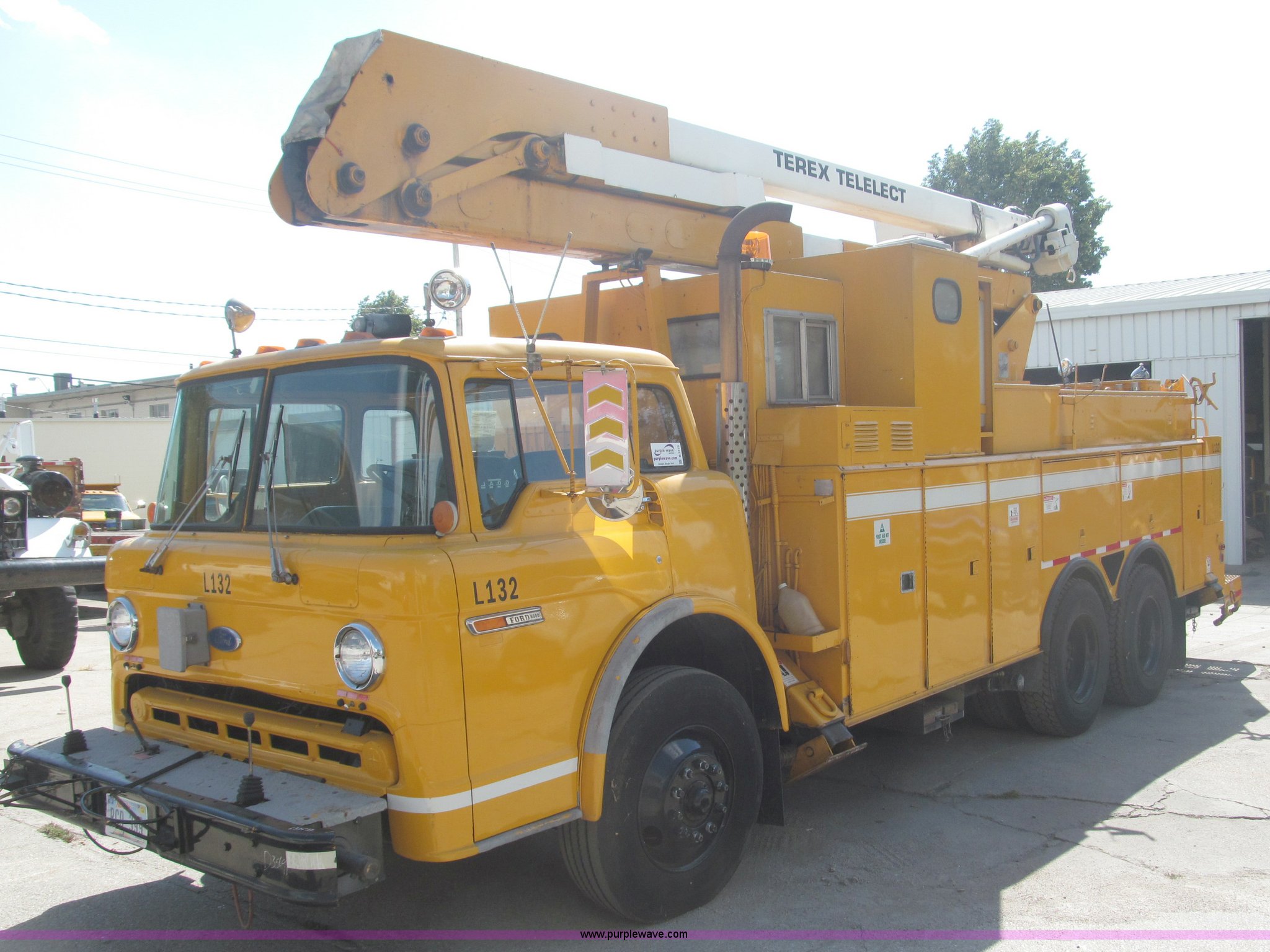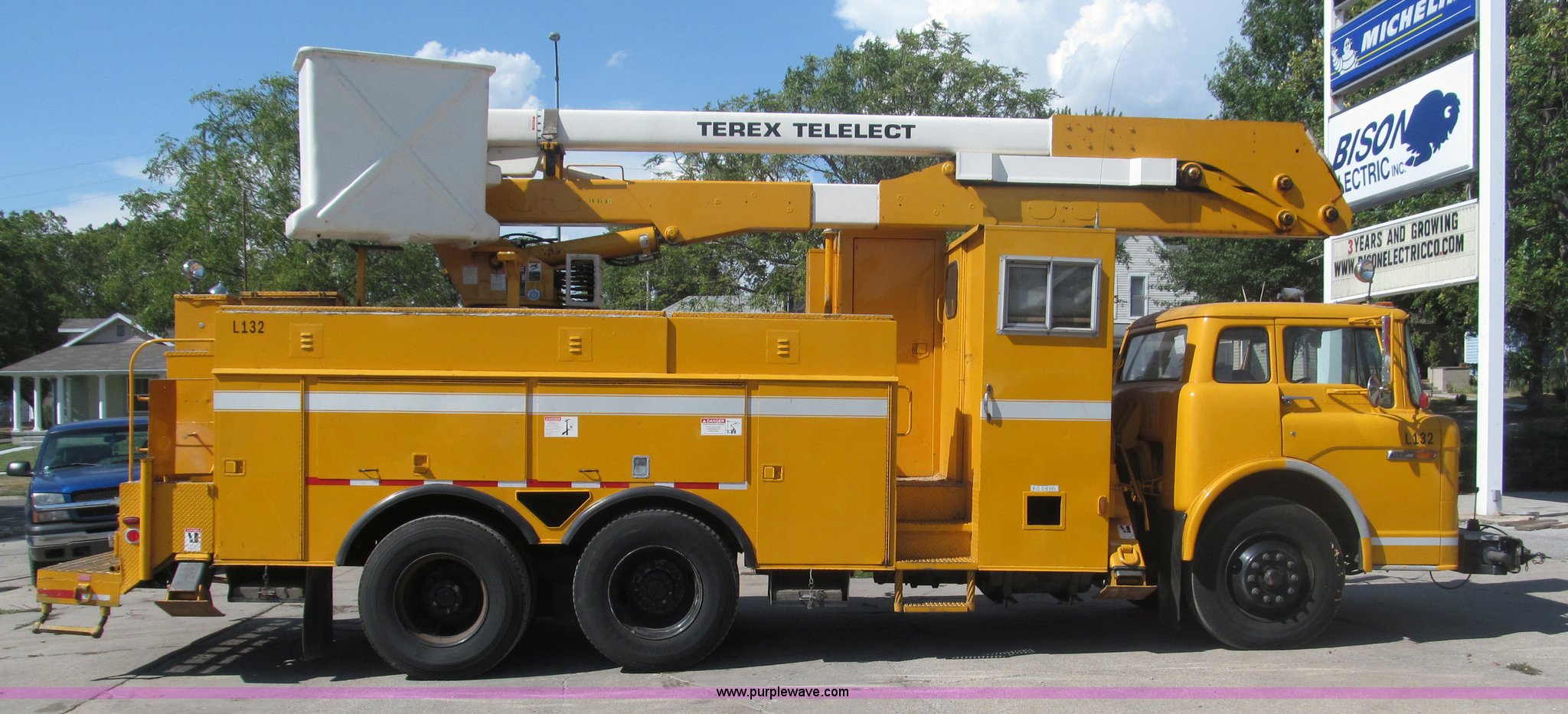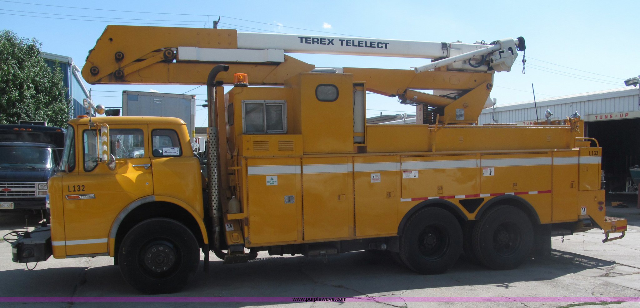 Purple Wave is selling a used Bucket Truck in Nebraska. This item is a 1985 Ford CT8000 low tilt boom truck with the following: 71,108 miles on odometer, 994 hours on meter, Caterpillar 3208 diesel engine, Remanufactured engine, Serial SCD20817, Automatic transmission, MT653, Bench seat, Spotlights, On board latrine and rest area, Terex Telelect TX5049 crane, 49' max boom height, 55' work height, 500 lb max capacity, 47.5" x 27.5" basket, Serial TX5000-798FW, Chelsea PTO, DynaMote controller, (4) outriggers, D-rings, Rear step bumper, Top, side, and rear storage compartments, Telescoping ground cable and electric plug, Damaged plug, 181" wheelbase, 11R22.5 tires, GVWR 50,000 lbs, EIN L132