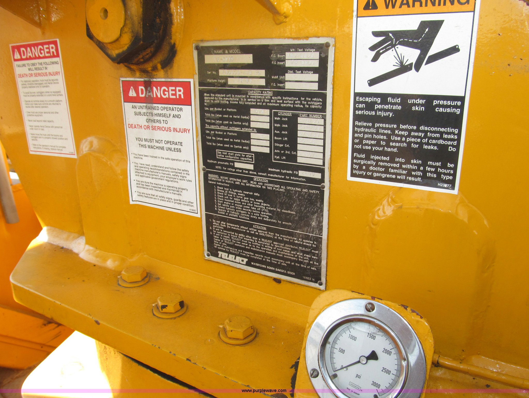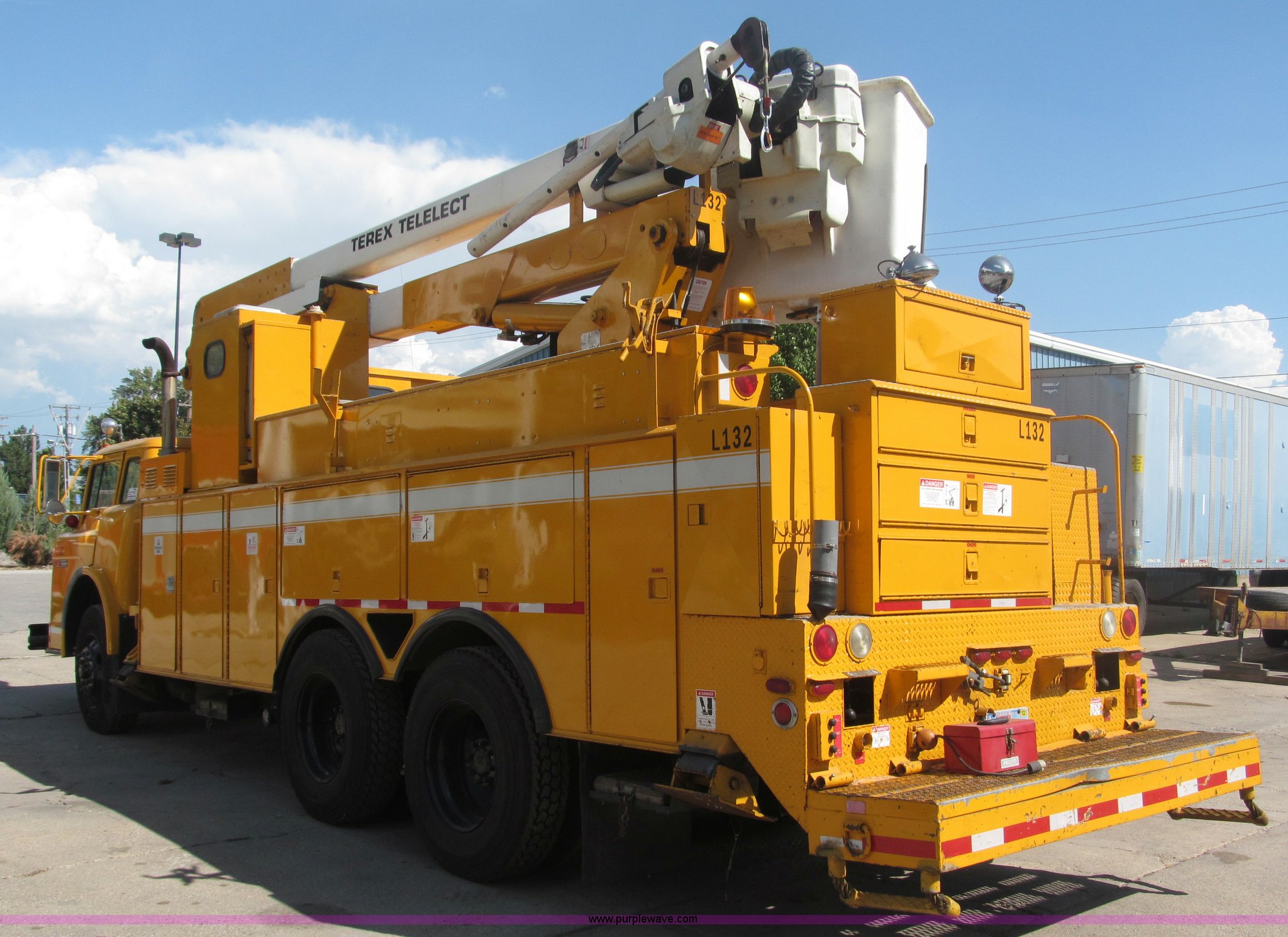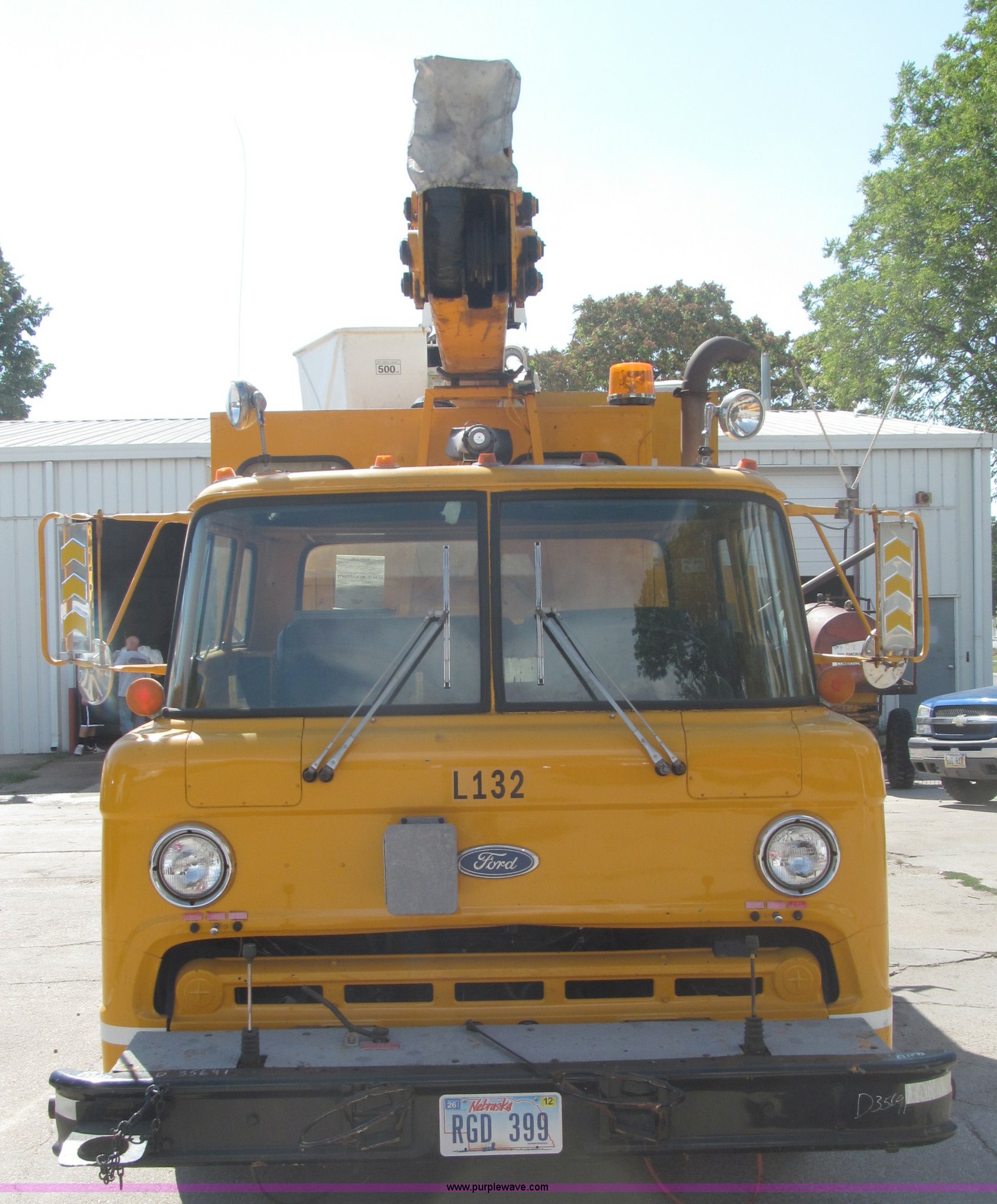 Purple Wave is selling a used Bucket Truck in Nebraska. This item is a 1985 Ford CT8000 low tilt boom truck with the following: 71,108 miles on odometer, 994 hours on meter, Caterpillar 3208 diesel engine, Remanufactured engine, Serial SCD20817, Automatic transmission, MT653, Bench seat, Spotlights, On board latrine and rest area, Terex Telelect TX5049 crane, 49' max boom height, 55' work height, 500 lb max capacity, 47.5" x 27.5" basket, Serial TX5000-798FW, Chelsea PTO, DynaMote controller, (4) outriggers, D-rings, Rear step bumper, Top, side, and rear storage compartments, Telescoping ground cable and electric plug, Damaged plug, 181" wheelbase, 11R22.5 tires, GVWR 50,000 lbs, EIN L132