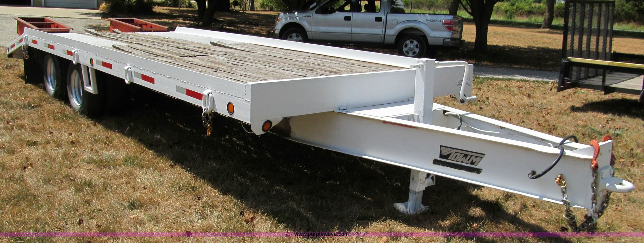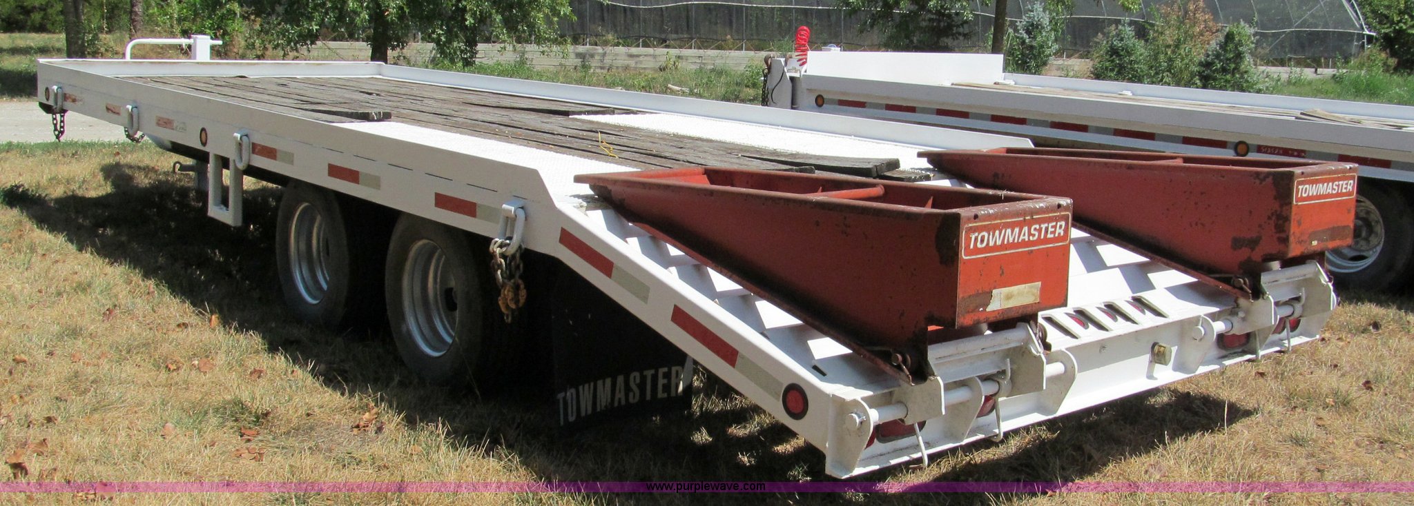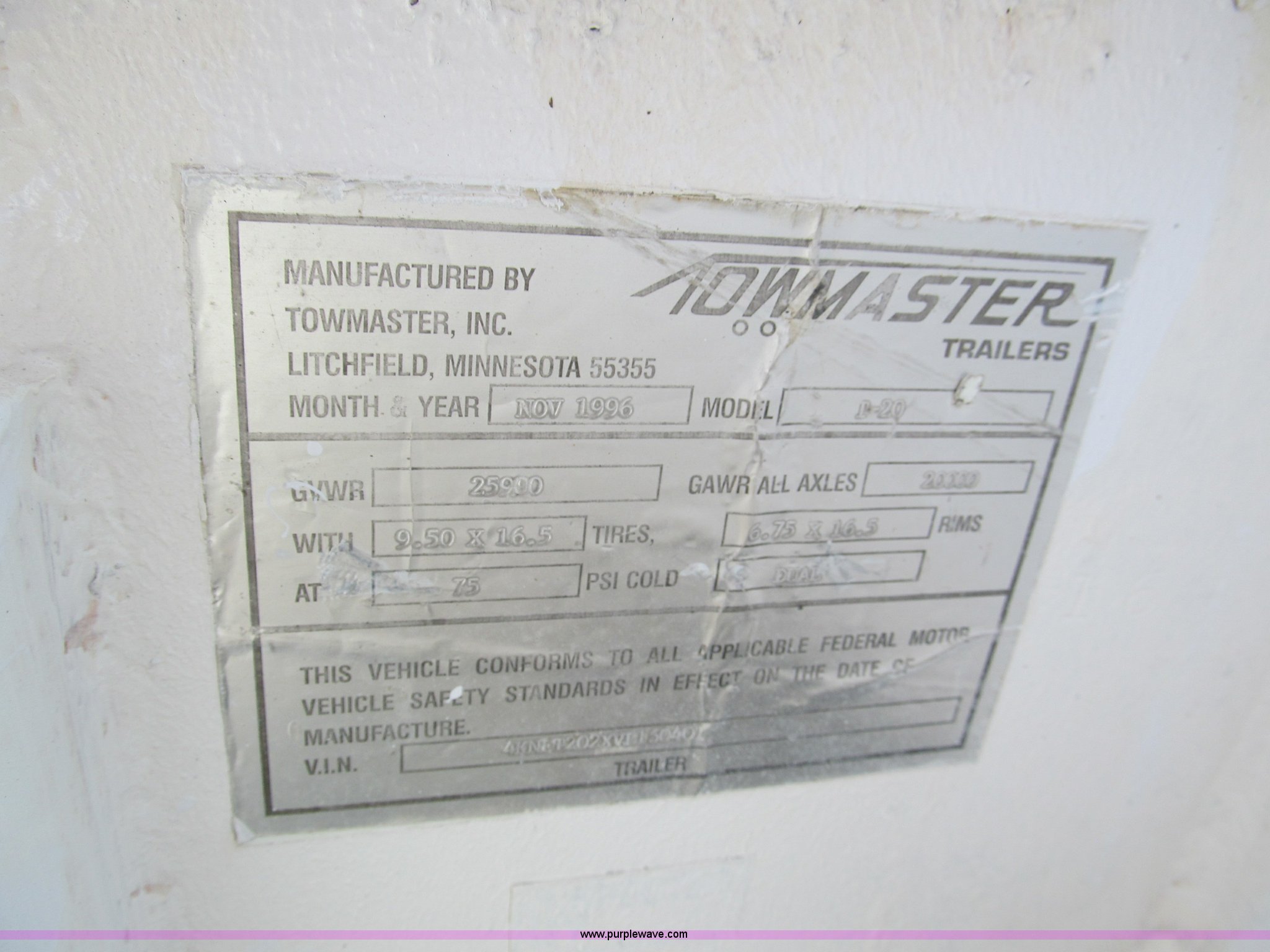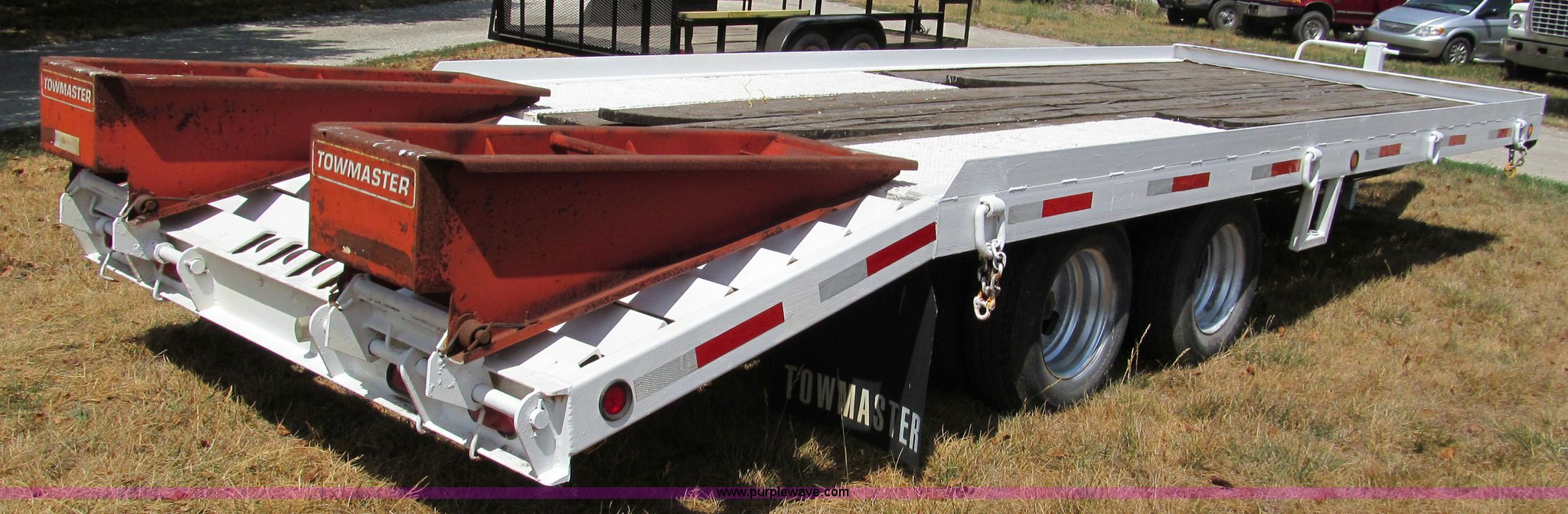Purple Wave is selling a used Equip. Trailer in Missouri. This item is a 1997 Towmaster T20 equipment trailer with the following: 20' flat, 4' dovetail, (2) 48" fold down ramps, Spring suspension, Adjustable height pintle hitch, D-rings, Wood floor, Steel over wheels, Single tongue jack, Dual 10,000 lb axles, 9.50-16.5 tires, 10 ply