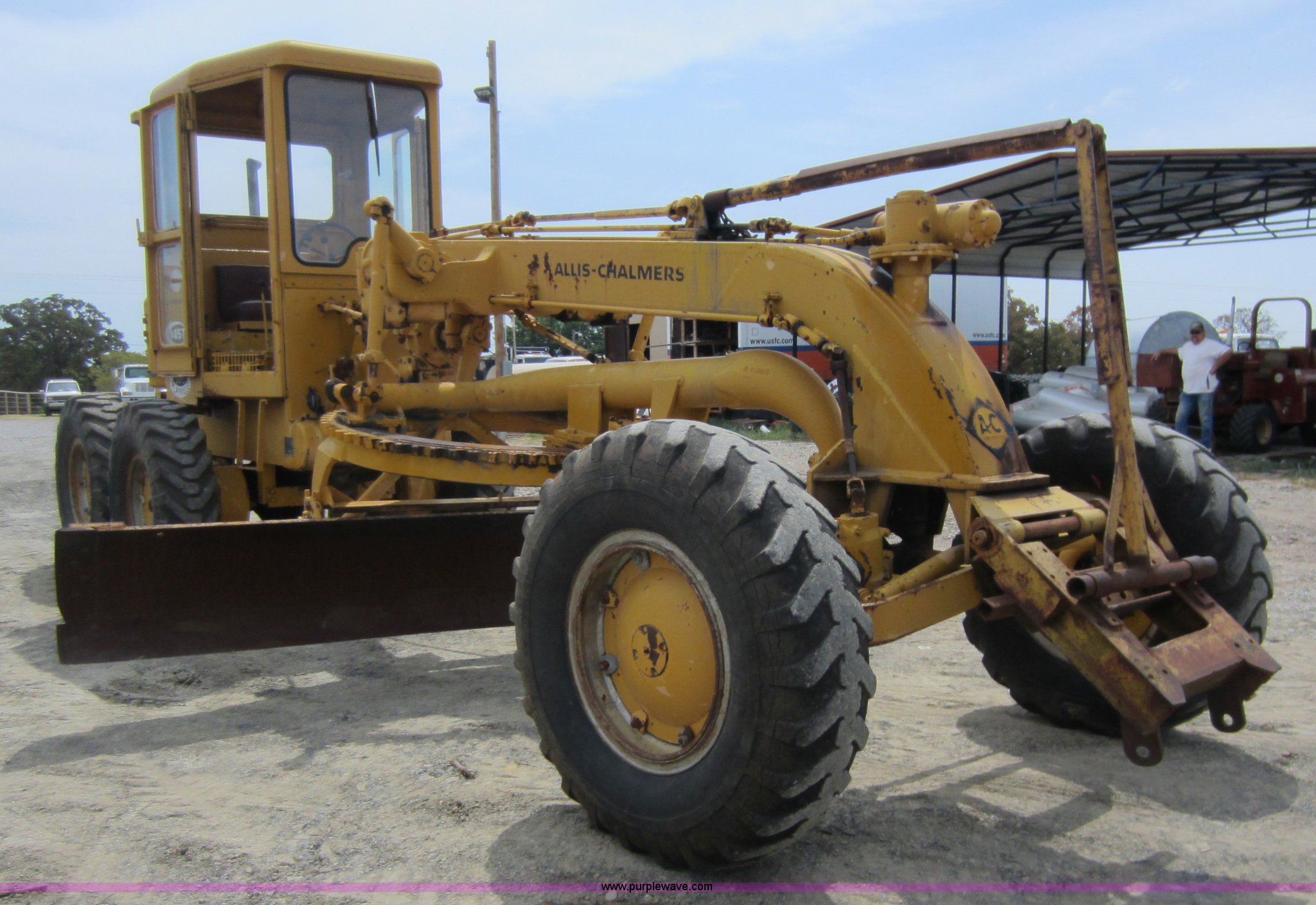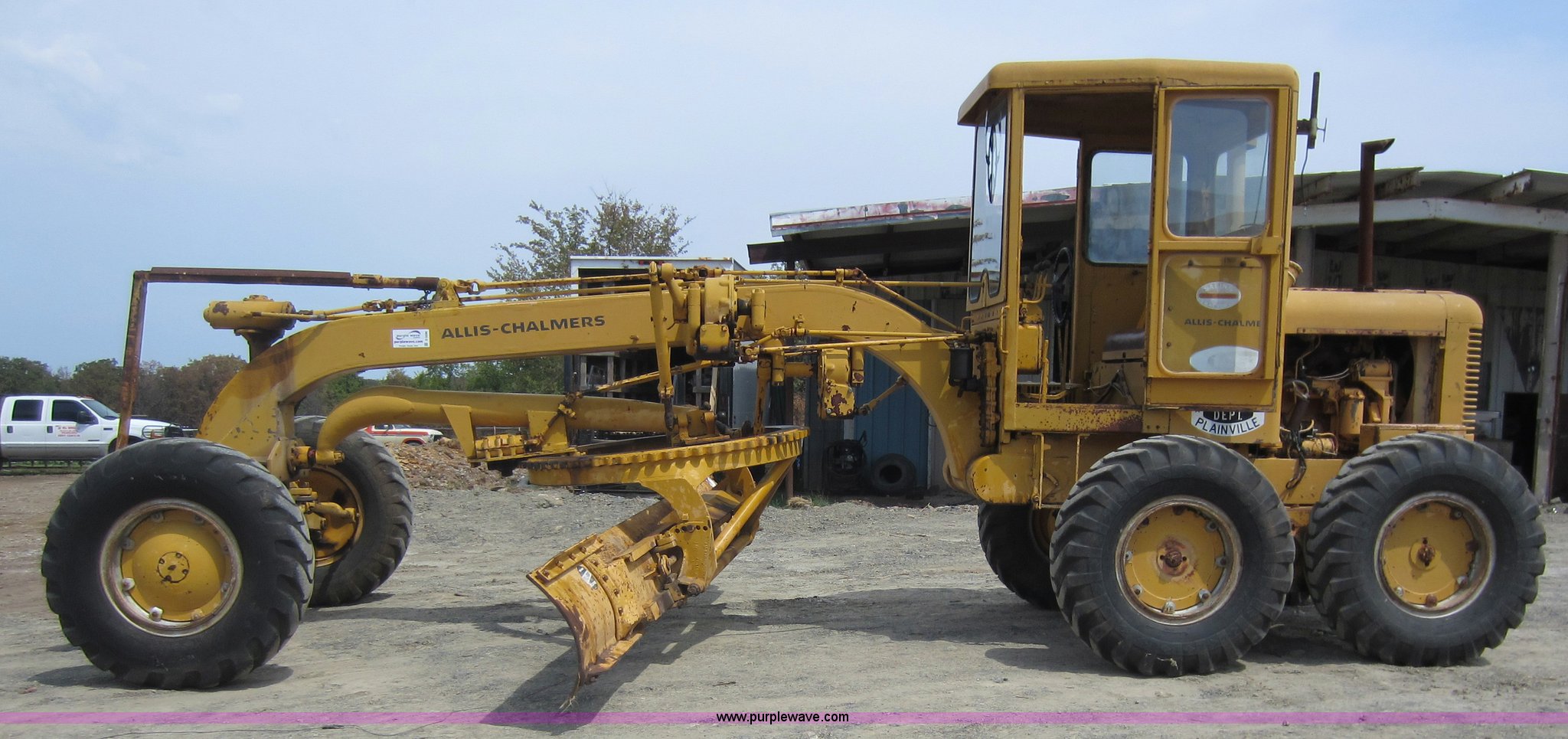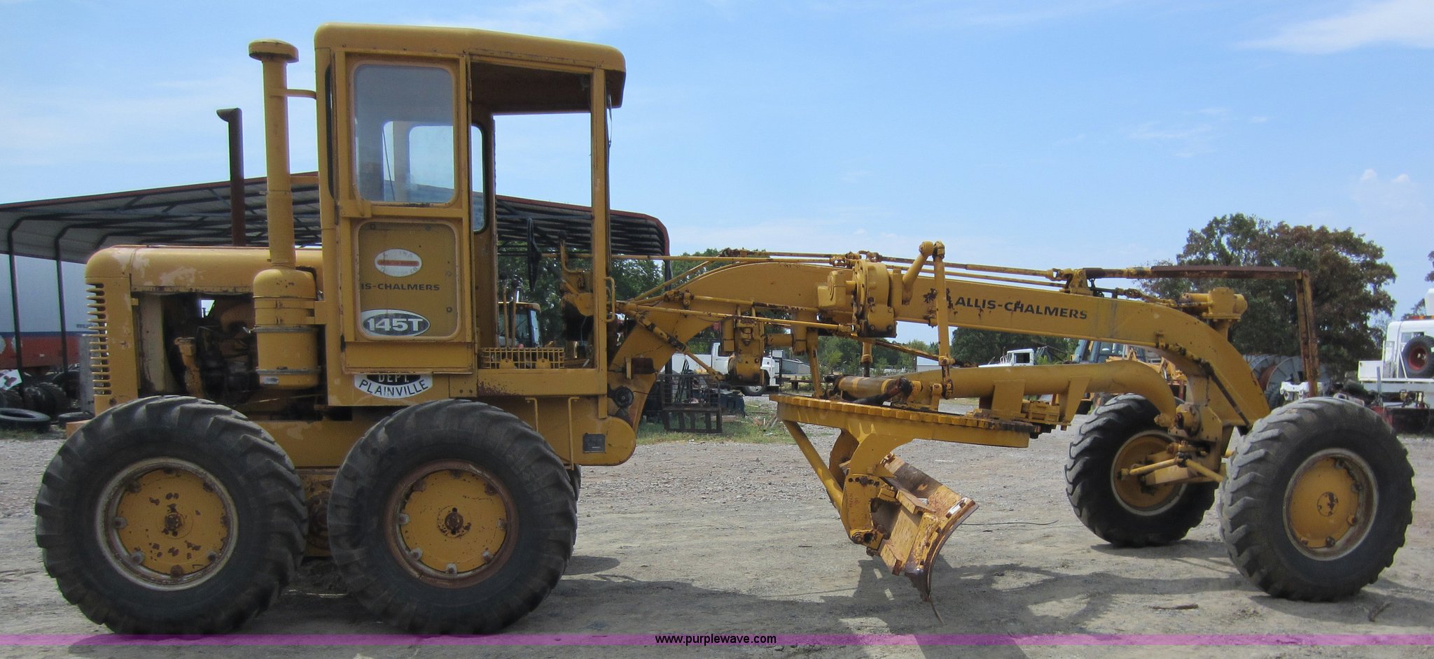 Purple Wave is selling a used Motor Grader in Oklahoma. This item is a 1962 Allis-Chalmers 145T motor grader with the following: 6,871 hours on meter, Allis-Chalmers 7000 four cylinder diesel engine, 105 HP, Direct-drive transmission, 6F-3R gears, Four wheel drive, Heat, Rigid frame, 14'L moldboard, Tip control, Side shift, 13.00-24 front tires, 13.00-24TG rear tires, 21,640 lbs. base operating weight, Serial 145T-403