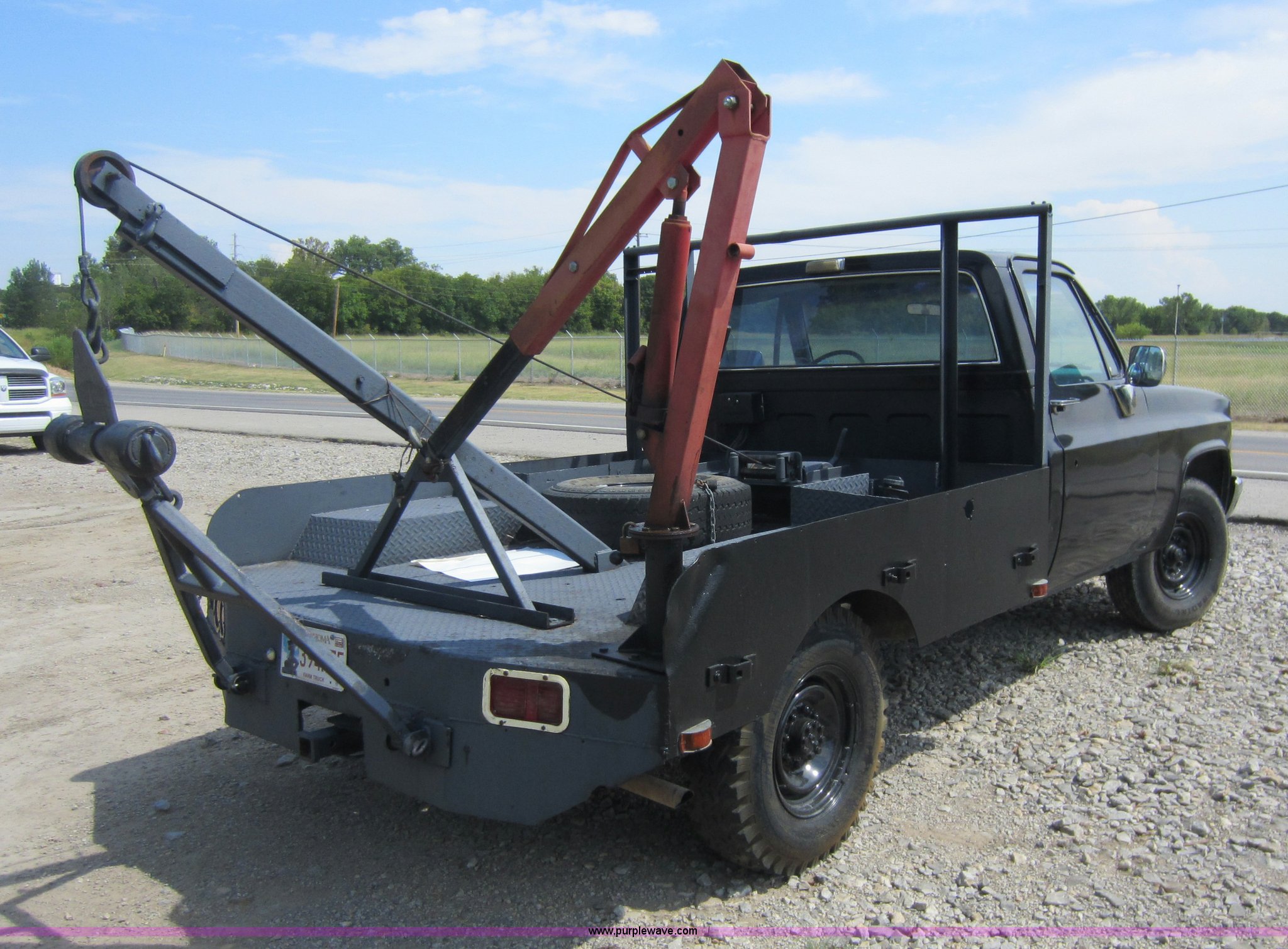 Purple Wave is selling a used Passenger Vehicle in Oklahoma. This item is a 1986 Chevrolet C20 pickup truck with the following: 18,937 miles on odometer, 5.7L V8 4BBL gas engine, Automatic transmission, AC and heat, Tilt, Cruise, AM/FM/cassette, Power windows and locks, Cloth interior, Steel bed, Winch, Tow bar, Side mounted crane, Receiver hitch, 7.50-16LT tires