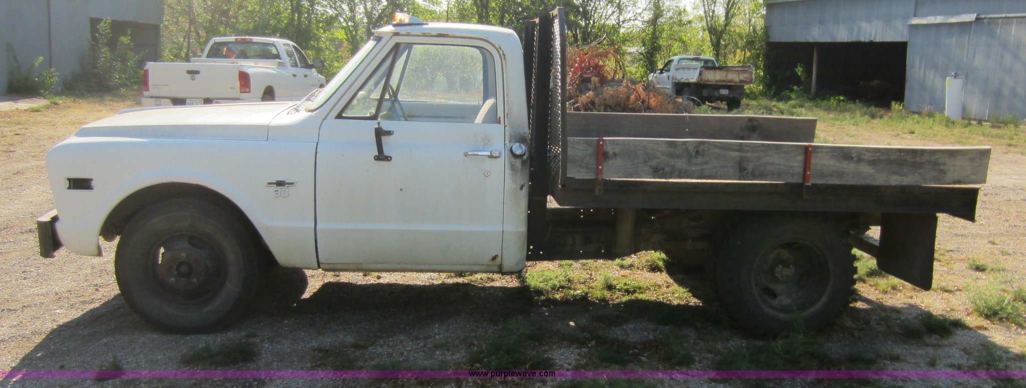 Purple Wave is selling a used Passenger Vehicle in Kansas. This item is a 1968 Chevrolet 30 flatbed pickup truck with the following: 37,603 miles on odometer, 327 CID gas engine, Four speed manual transmission, Heat, Manual windows and locks, Cloth interior, 7.50-16LT tires, Brake booster inoperable, Cracked windshield
