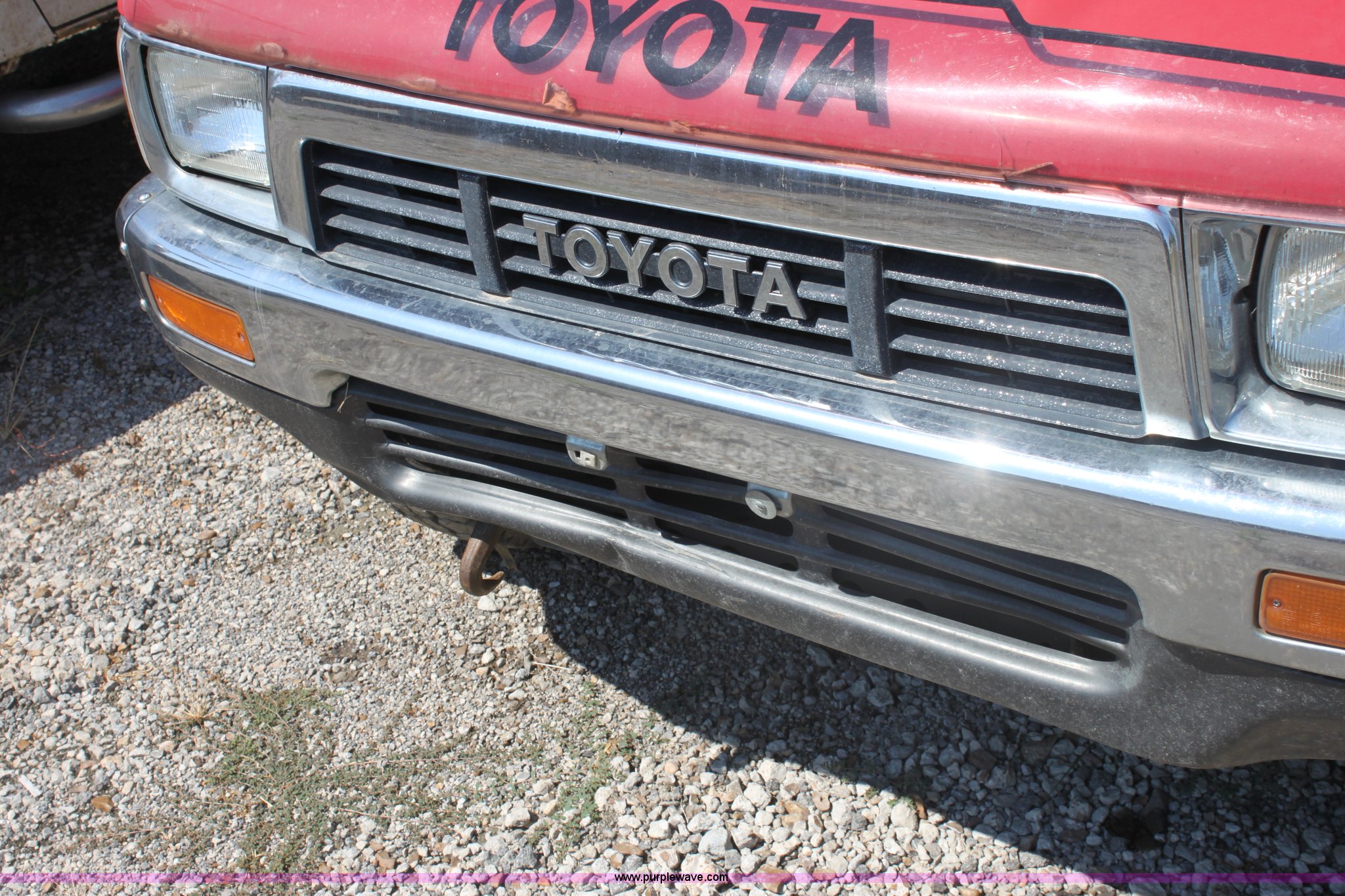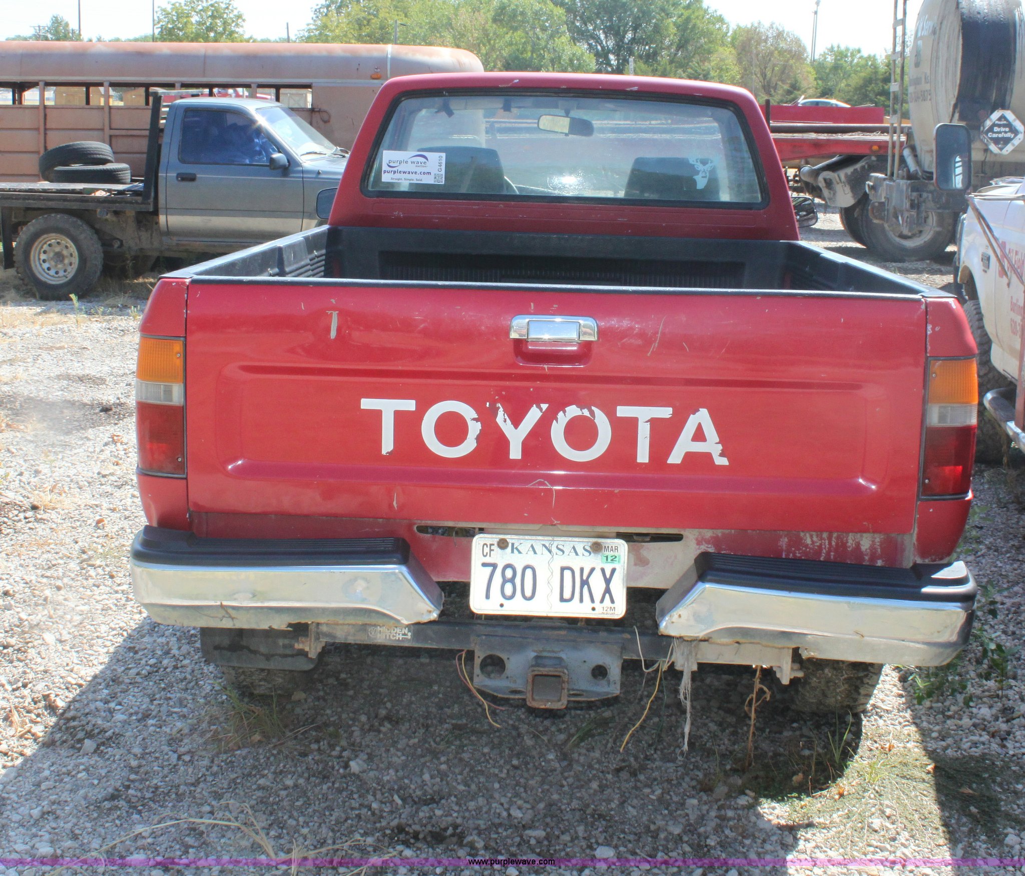 Purple Wave is selling a used Passenger Vehicle in Kansas. This item is a 1990 Toyota Tacoma pickup truck with the following: 315,572 miles on odometer, 2.4L I4 FI gas engine, Five speed manual transmission, Four wheel drive, AC and heat, Tilt, AM/FM/CD, Manual windows and locks, Cloth interior, Long bed, Bed liner, Front tow hooks, Receiver hitch, 295/75R15 tires, Rear bumper has been cut