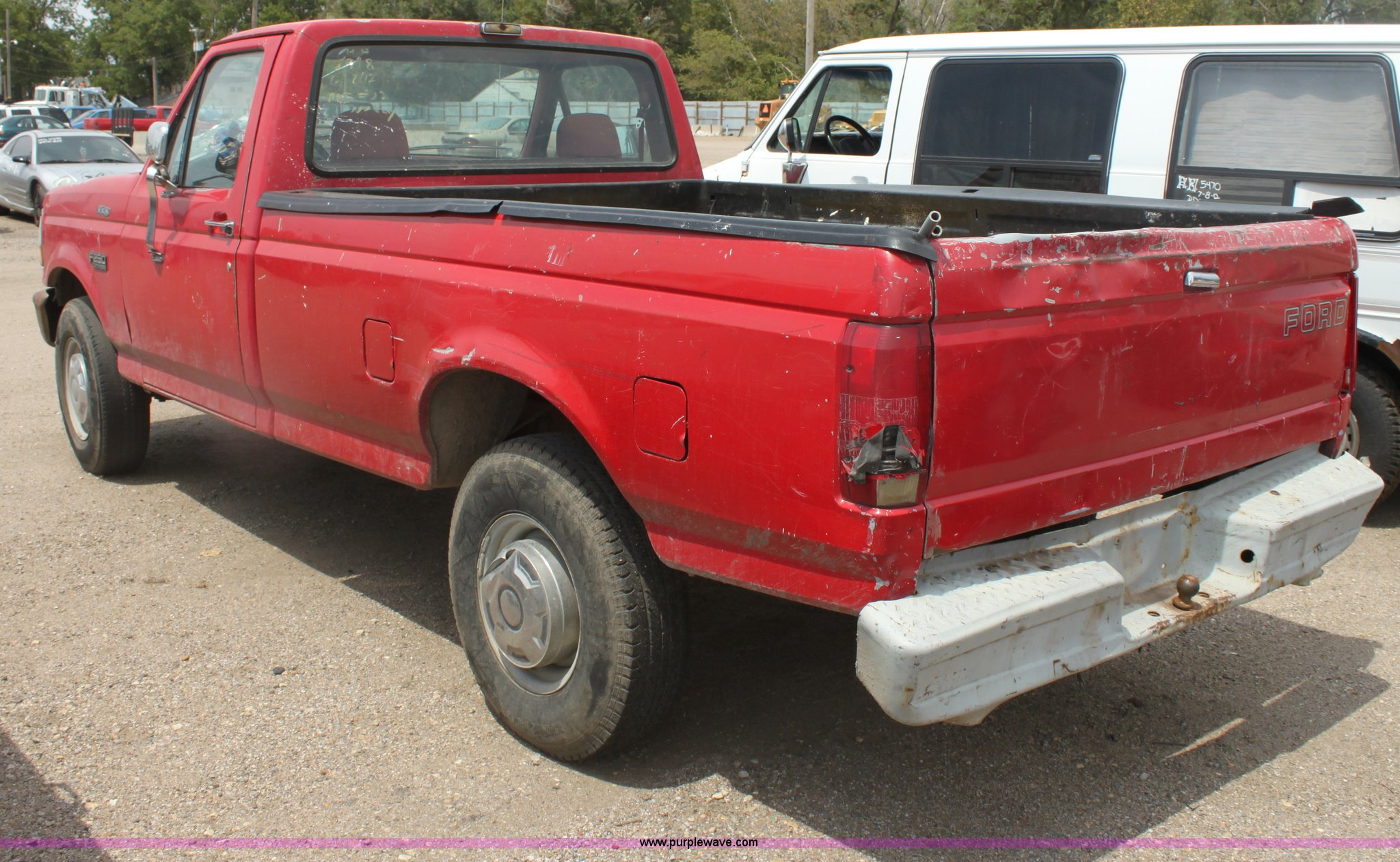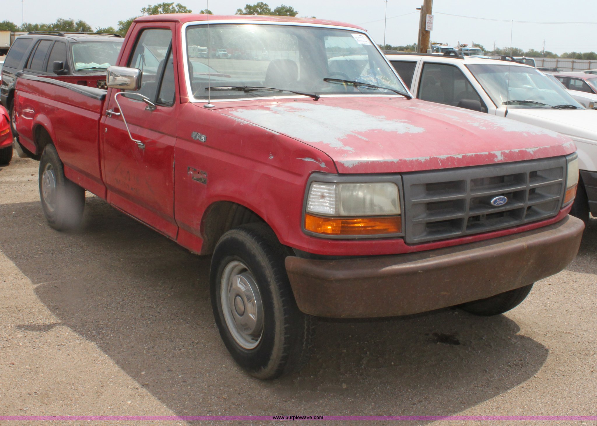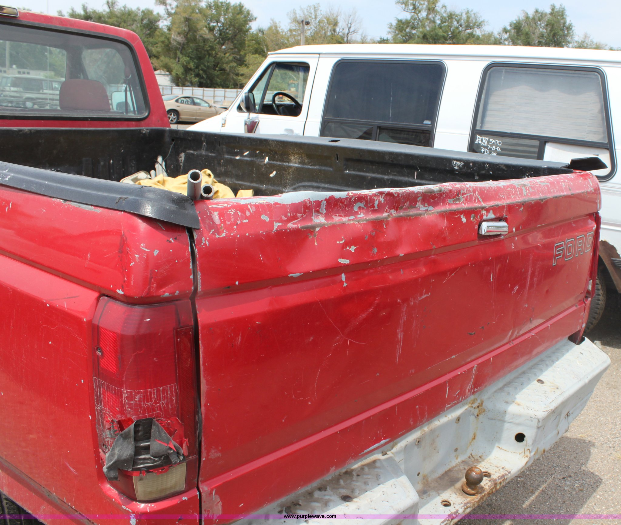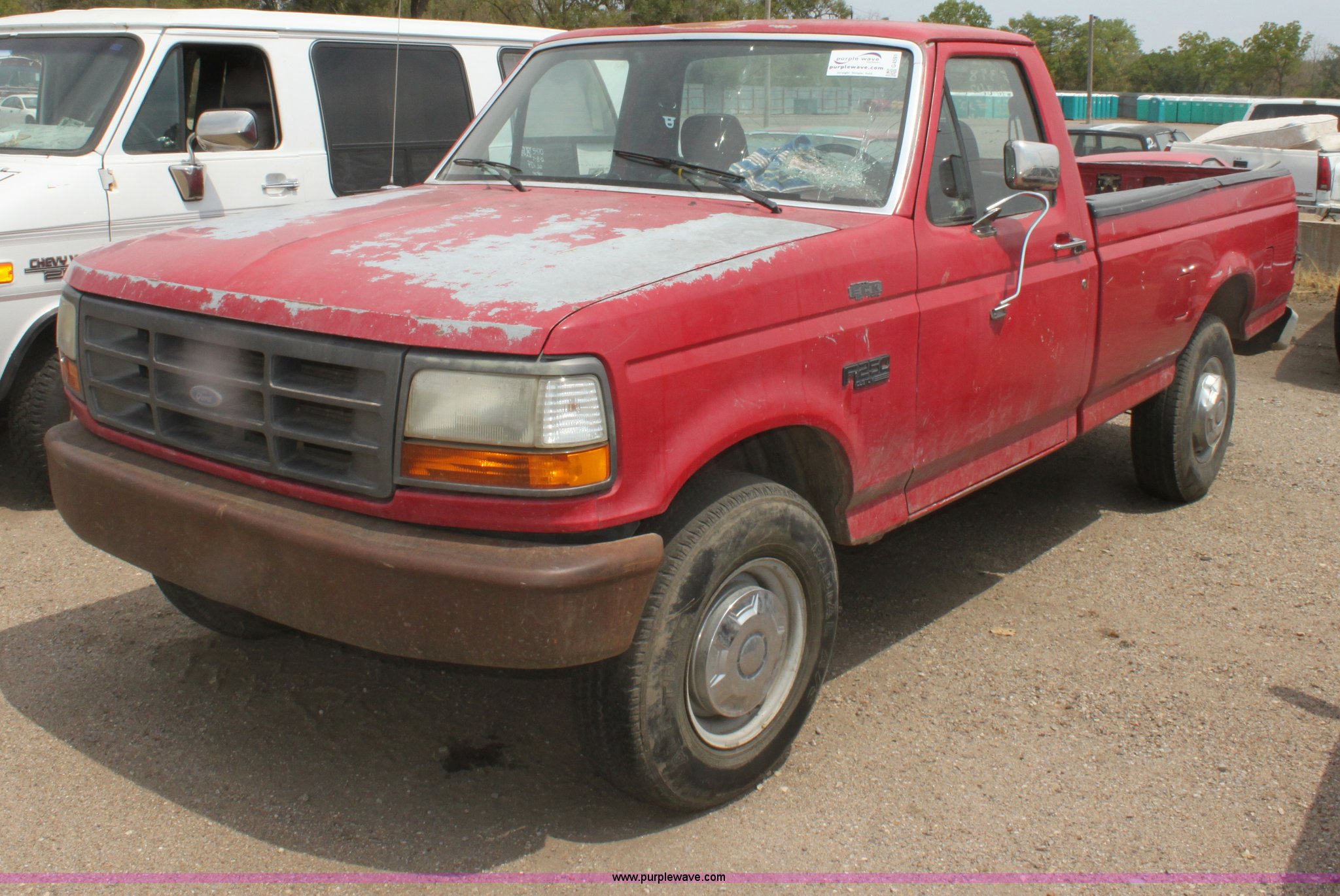 Purple Wave is selling a used Passenger Vehicle in Kansas. This item is a 1992 Ford F250 Custom pickup truck with the following: Mileage unknown, 4.9L I6 EFI gas engine, Five speed manual transmission, AC and heat, AM/FM/cassette, Manual windows and locks, Vinyl interior, Bed liner, 235/85R16 tires, Interior/exterior cosmetic damage, Drivers interior door handle broken, Cracked windshield, Paint peeling, Damage to tailgate, rear quarter panels, front bumper, and passenger front fender, Case# 12C41948