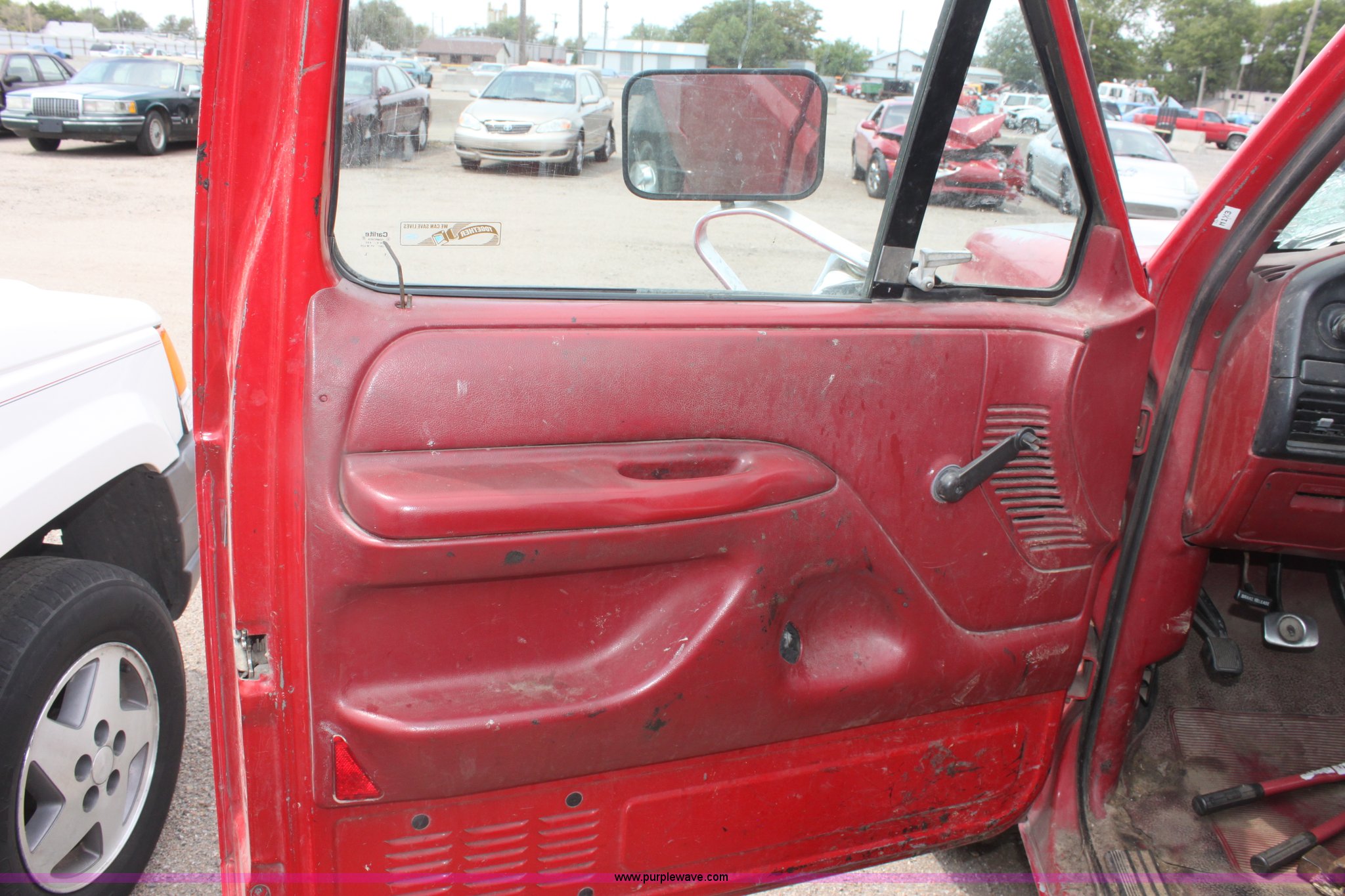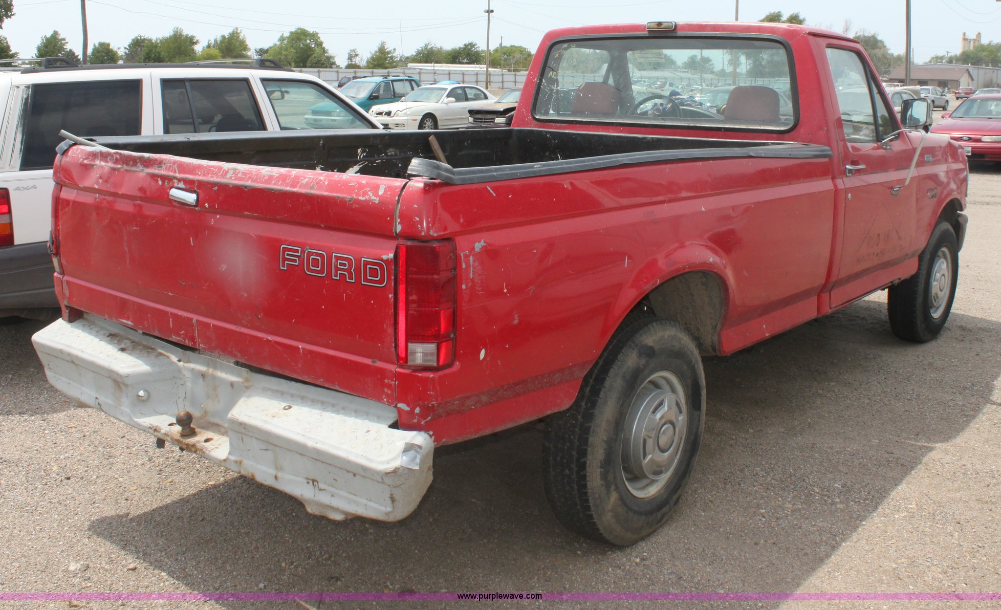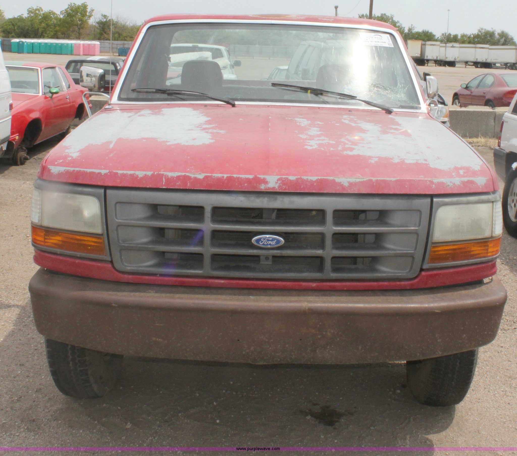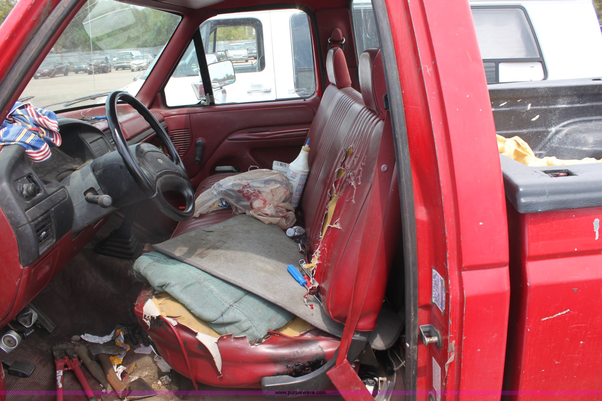 Purple Wave is selling a used Passenger Vehicle in Kansas. This item is a 1992 Ford F250 Custom pickup truck with the following: Mileage unknown, 4.9L I6 EFI gas engine, Five speed manual transmission, AC and heat, AM/FM/cassette, Manual windows and locks, Vinyl interior, Bed liner, 235/85R16 tires, Interior/exterior cosmetic damage, Drivers interior door handle broken, Cracked windshield, Paint peeling, Damage to tailgate, rear quarter panels, front bumper, and passenger front fender, Case# 12C41948