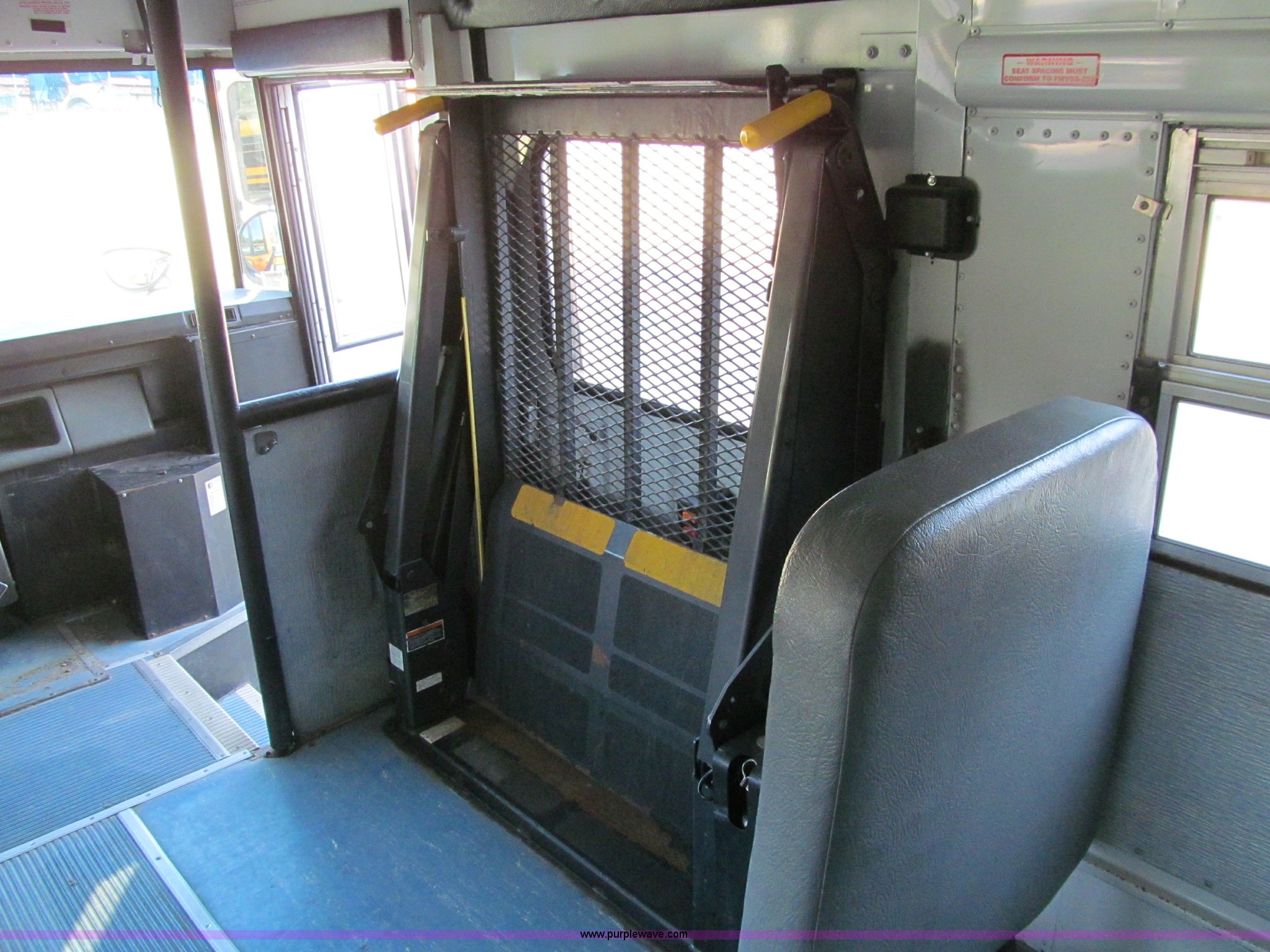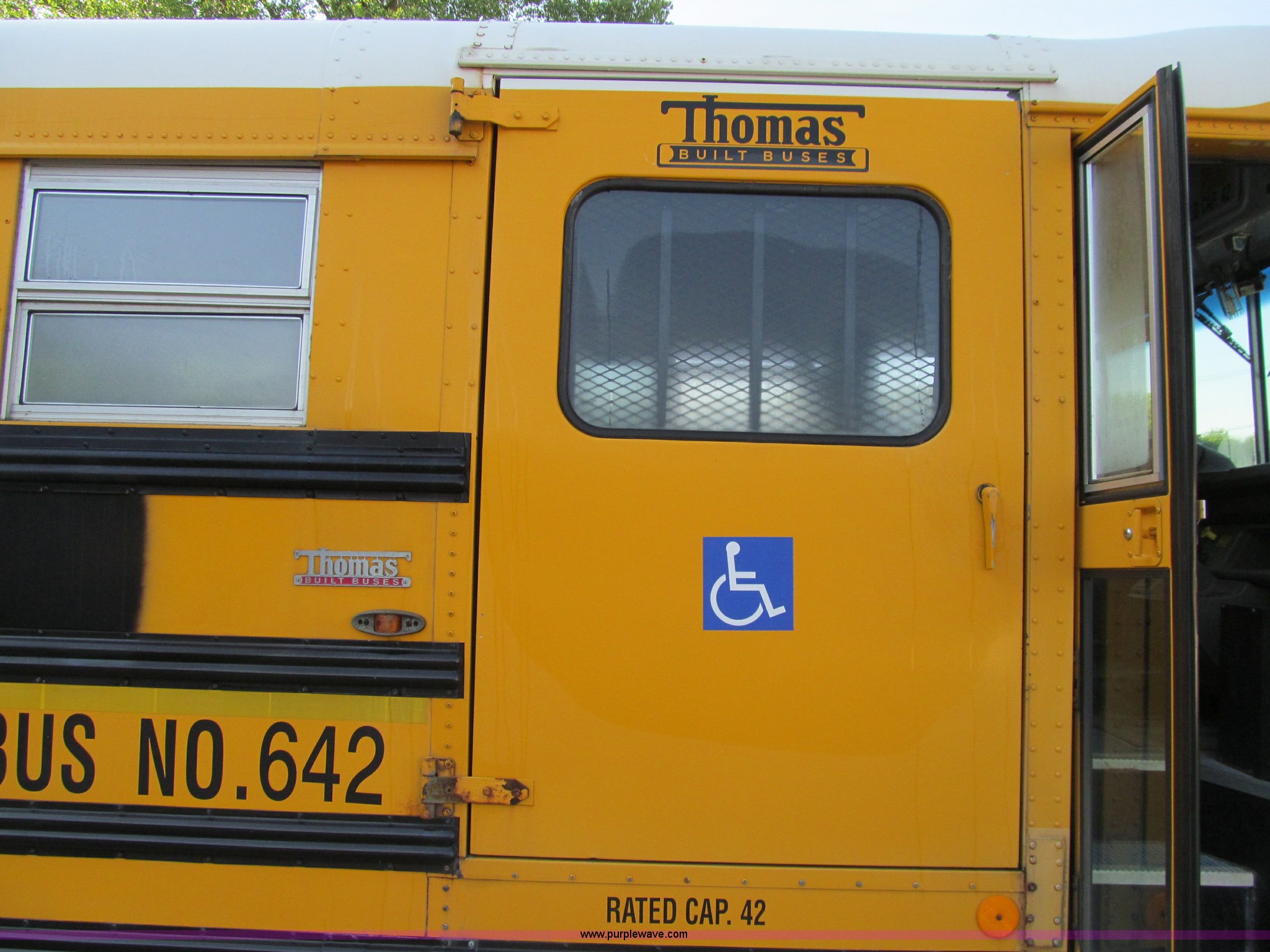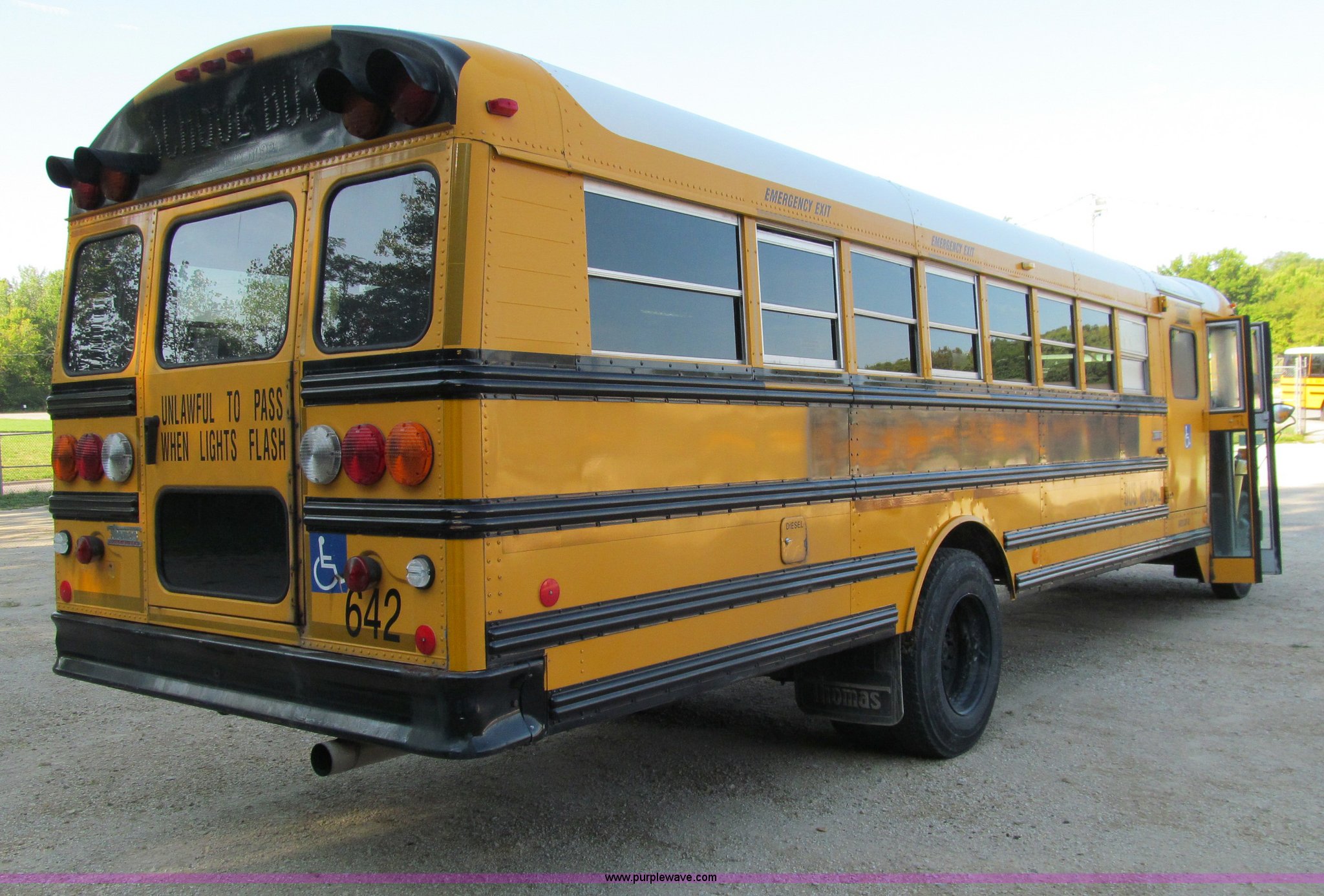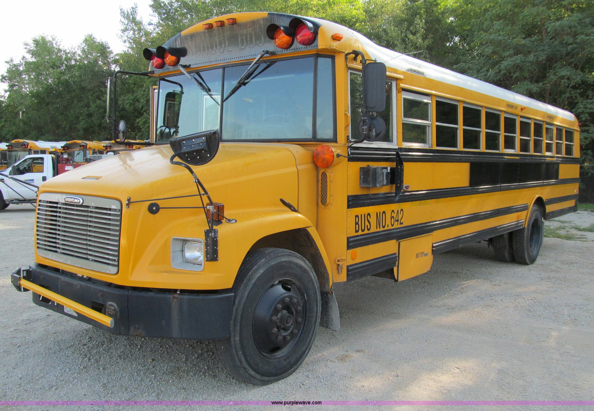 Purple Wave is selling a used Bus in Iowa. This item is a 2001 Freightliner FS65 school bus with the following: 127,621 actual miles, Thomas Built, 42 passenger, Cummins 5.9L six cylinder 24 valve diesel engine, Heater, Tilt, Cruise, AM/FM/cassette, Manual windows, Vinyl interior, Cush-N-Aire drivers seat, Braun Corporation L917 wheelchair lift, (7) emergency egresses, Freightliner chassis, Air suspension, Air brakes, 252" wheelbase, 10R22.5 tires, GVWR 28,960 lbs, FAWR 10,000 lbs, RAWR 18,960 lbs, V30 camera/monitor not included, ID# 642