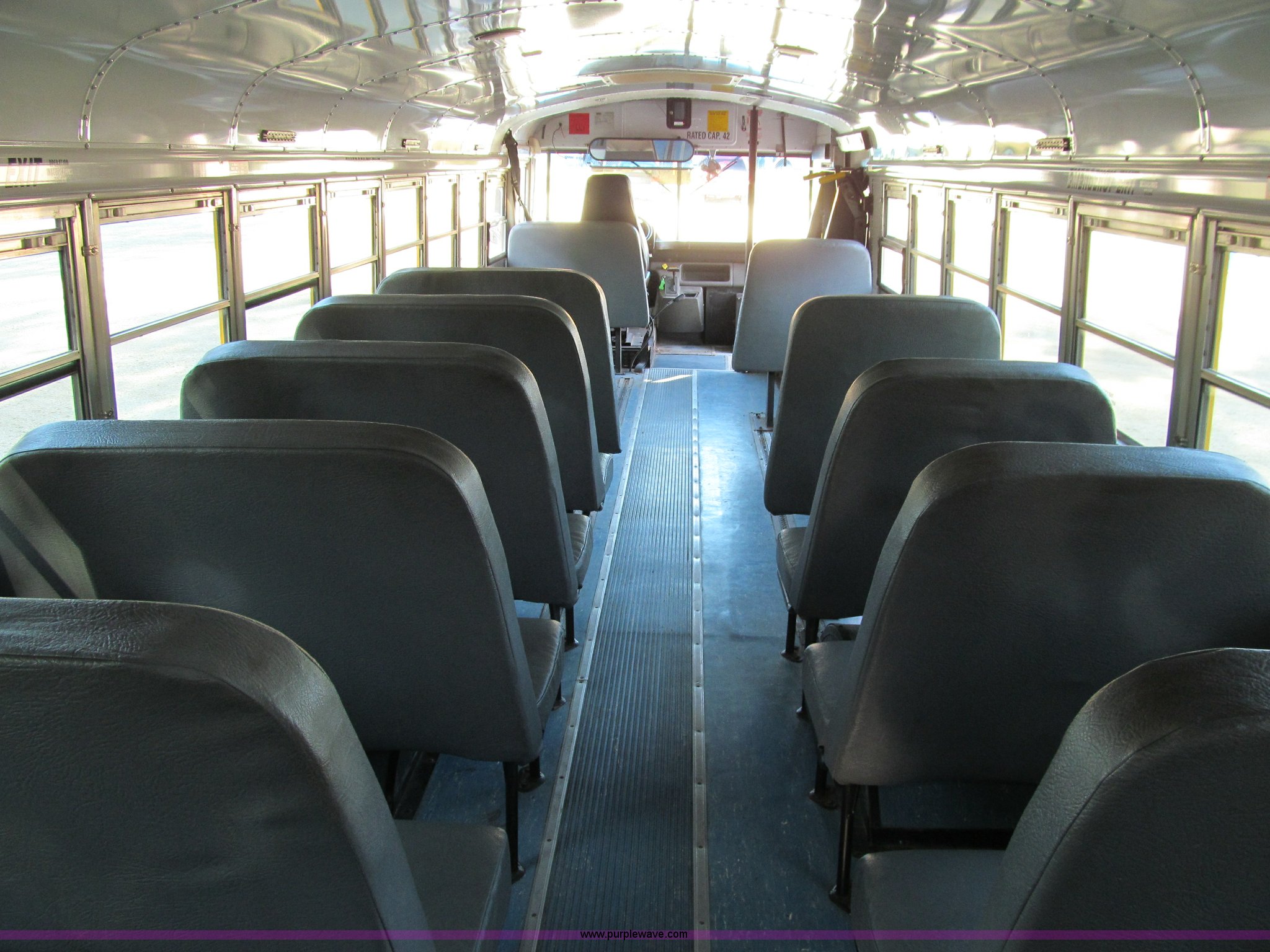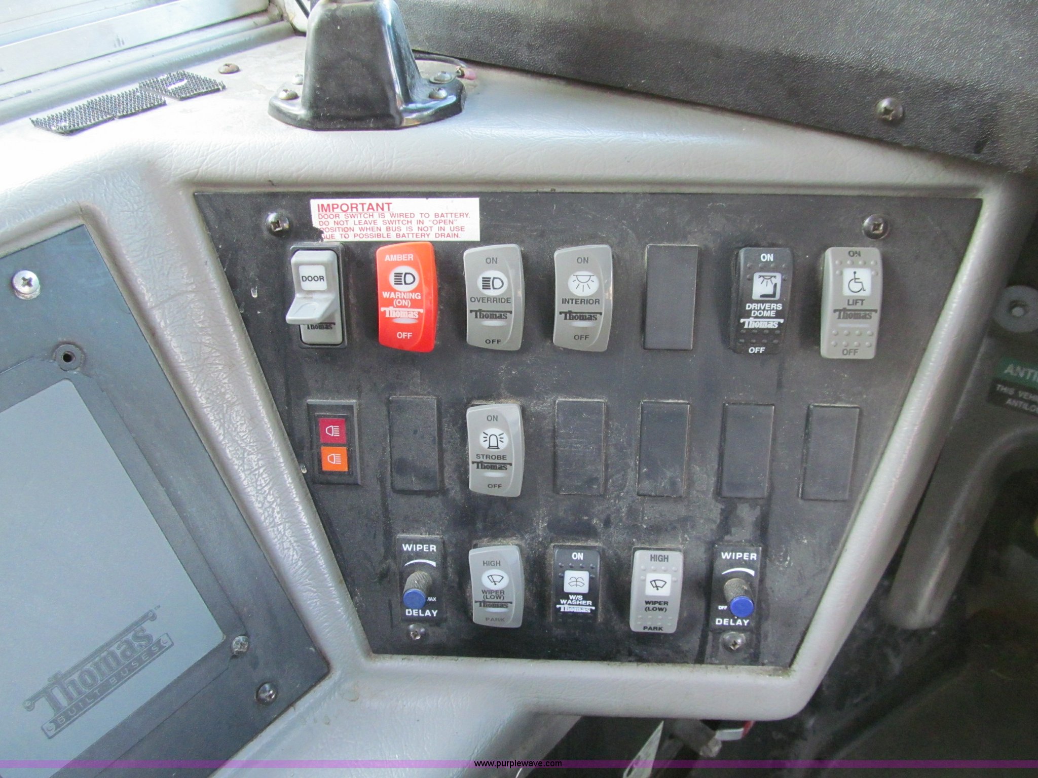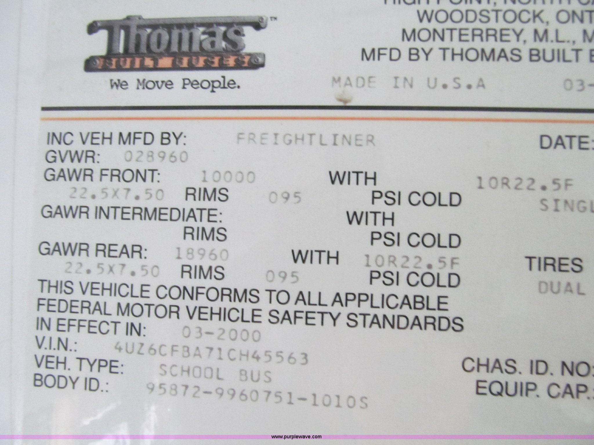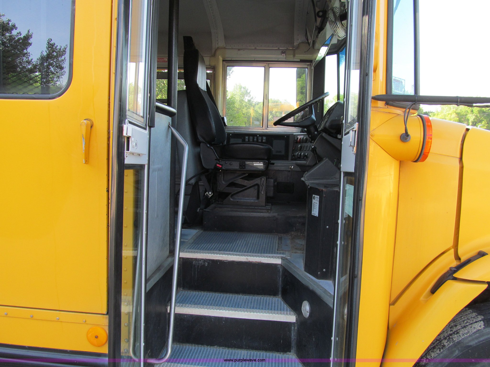 Purple Wave is selling a used Bus in Iowa. This item is a 2001 Freightliner FS65 school bus with the following: 127,621 actual miles, Thomas Built, 42 passenger, Cummins 5.9L six cylinder 24 valve diesel engine, Heater, Tilt, Cruise, AM/FM/cassette, Manual windows, Vinyl interior, Cush-N-Aire drivers seat, Braun Corporation L917 wheelchair lift, (7) emergency egresses, Freightliner chassis, Air suspension, Air brakes, 252" wheelbase, 10R22.5 tires, GVWR 28,960 lbs, FAWR 10,000 lbs, RAWR 18,960 lbs, V30 camera/monitor not included, ID# 642
