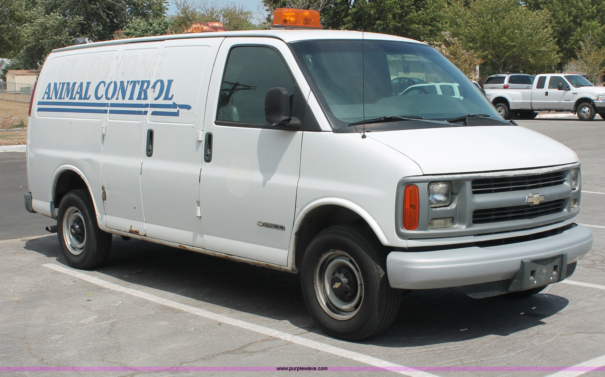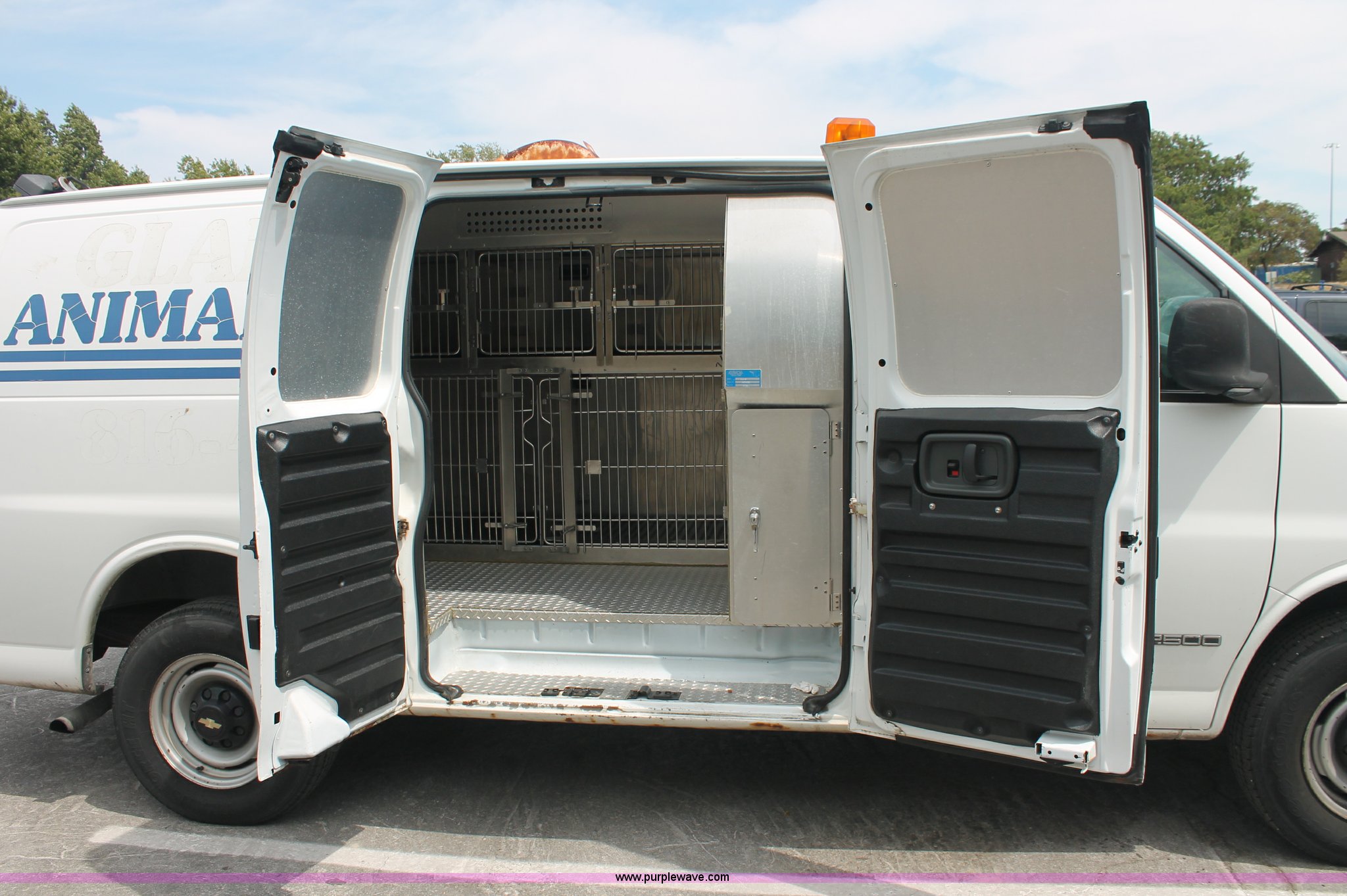Purple Wave is selling a used Passenger Vehicle in Missouri. This item is a 2002 Chevrolet G2500 Express cargo van with the following: 129,124 actual miles, 5.7L V8 CPI gas engine, Automatic transmission, AC and heat, Tilt, Cruise, AM/FM, Manual windows and locks, Vinyl interior, Amber warning beacon, Rear AC and heat control, Mauron AVL-9 steel animal kennel, (9) cage sections, Serial 0419021, Firestone Transforce 225/75R16 tires, Exterior graphic residue