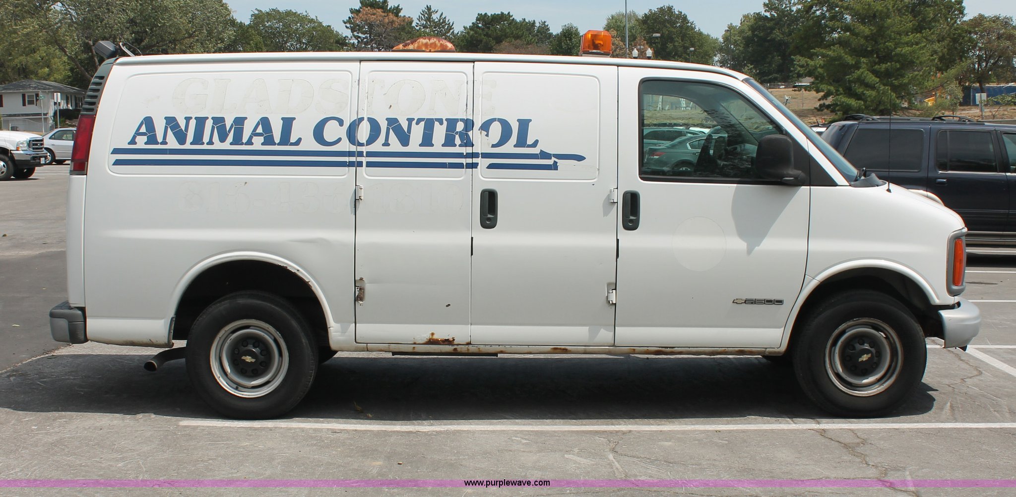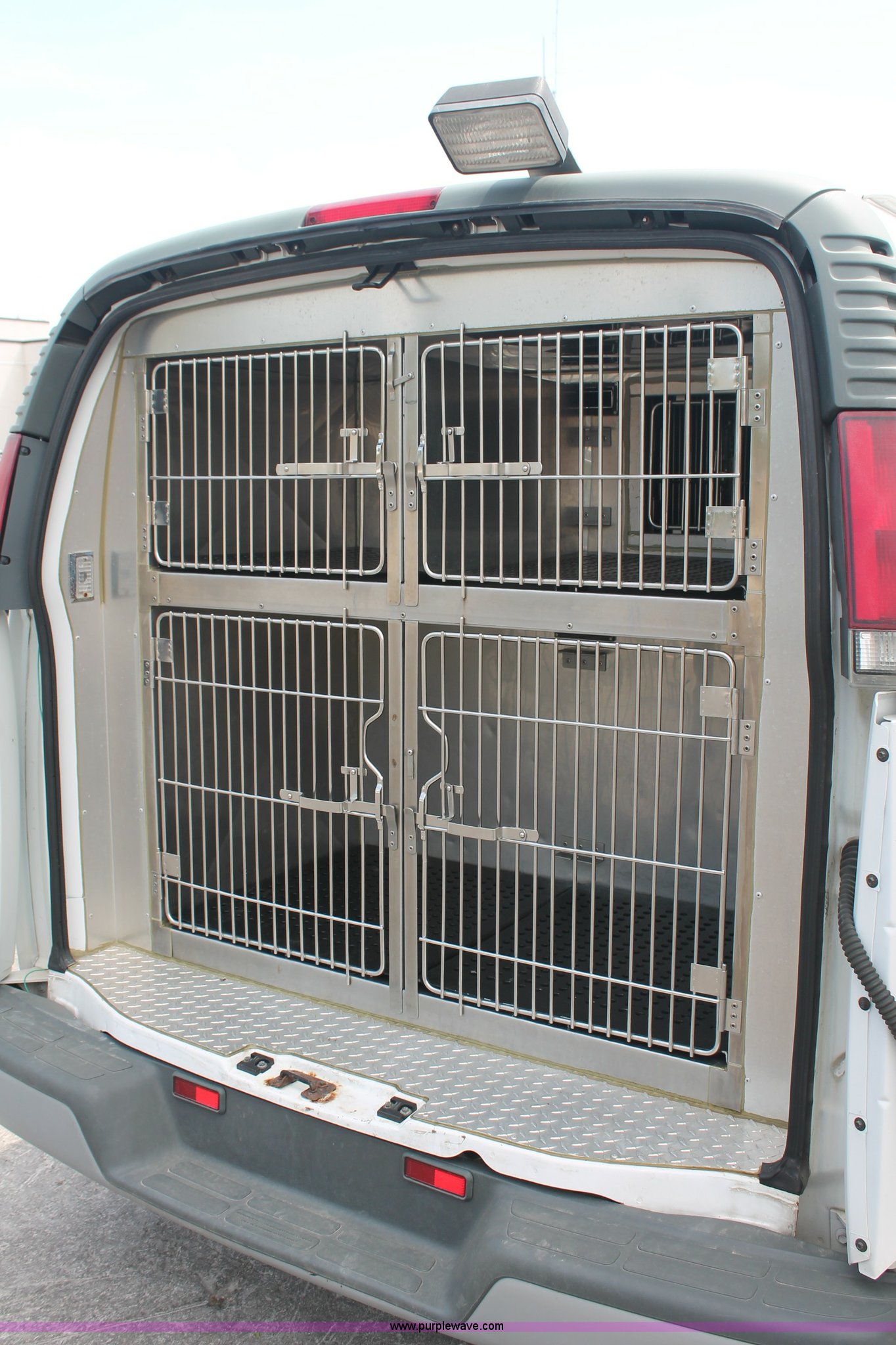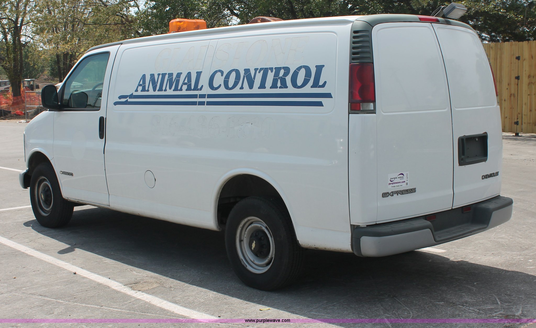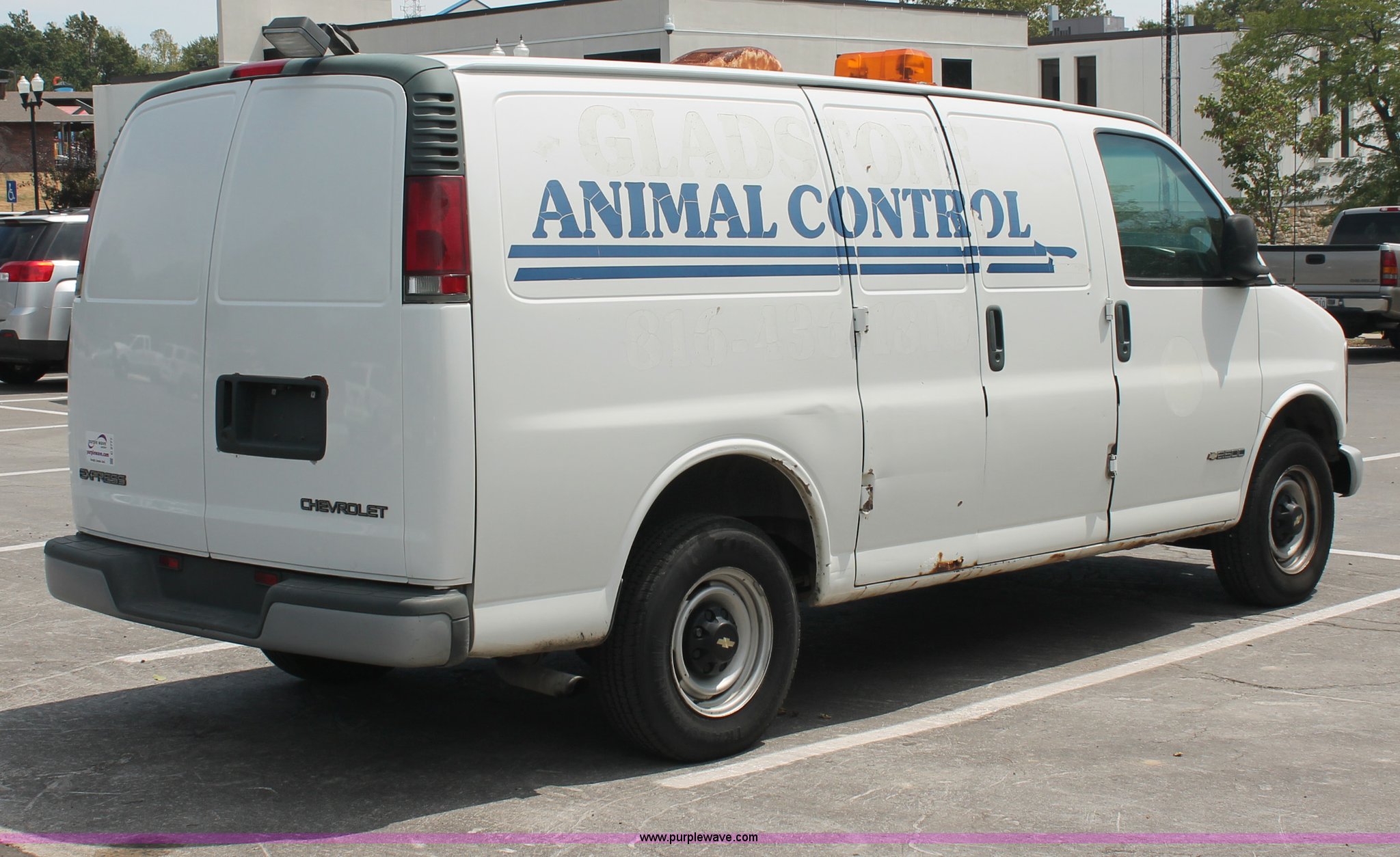2002 Chevrolet G2500 Express cargo van. 129,124 actual miles, 5.7L V8 CPI gas engine, Automatic transmission, AC and heat, Tilt, Cruise, AM/FM, Manual windows and locks, Vinyl interior, Amber warning beacon, Rear AC and heat control, Mauron AVL-9 steel animal kennel (9) cage sections, Serial 0419021, Firestone Transforce 225/75R16 tires, Exterior graphic residue. Title distribution may be delayed up to 14 days from verification of funds. 1GCGG25R621194401. Shipping quotes available. City of Gladstone - Public Safety. 7010 N Holmes. Gladstone, MO 64119