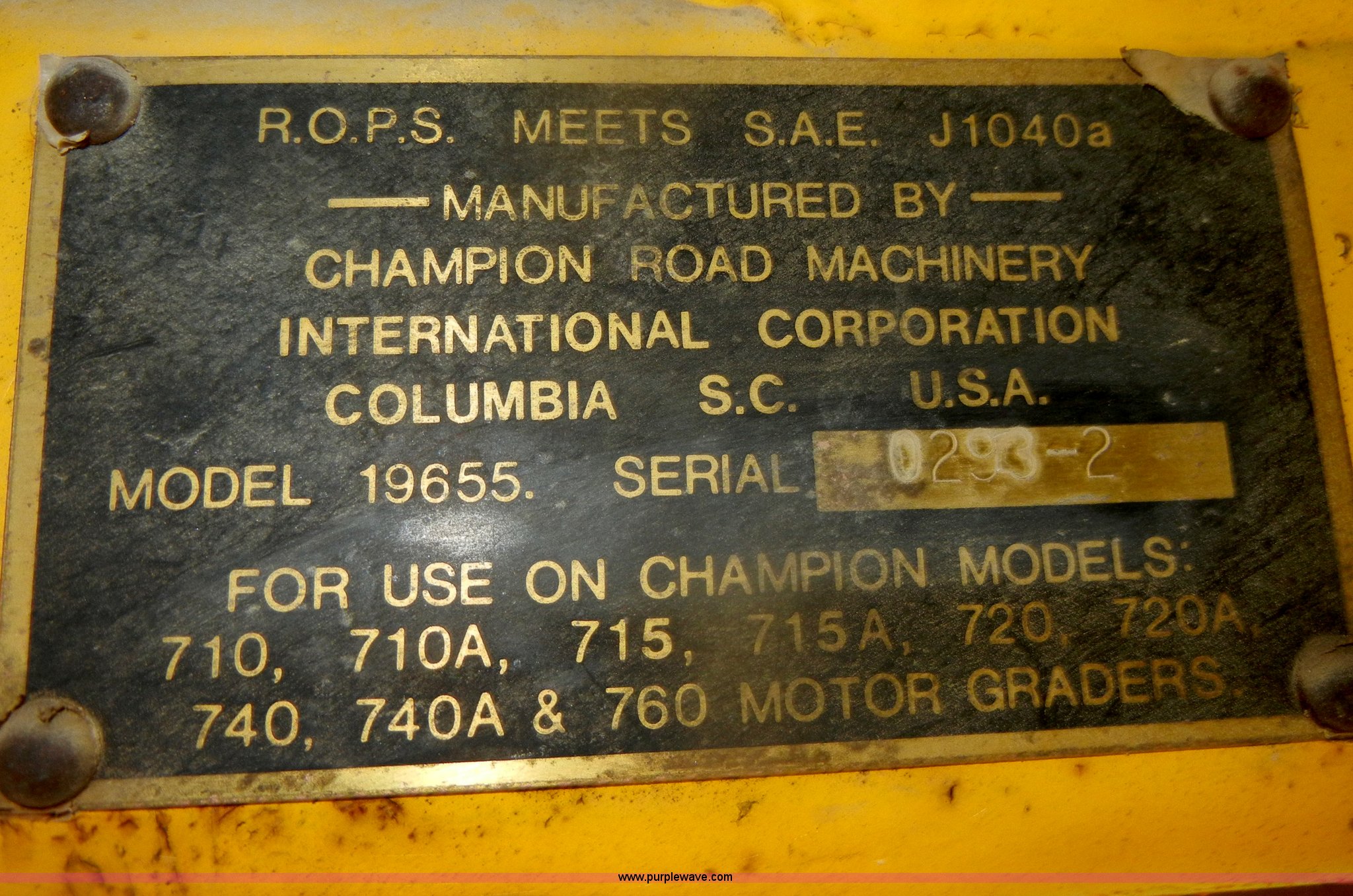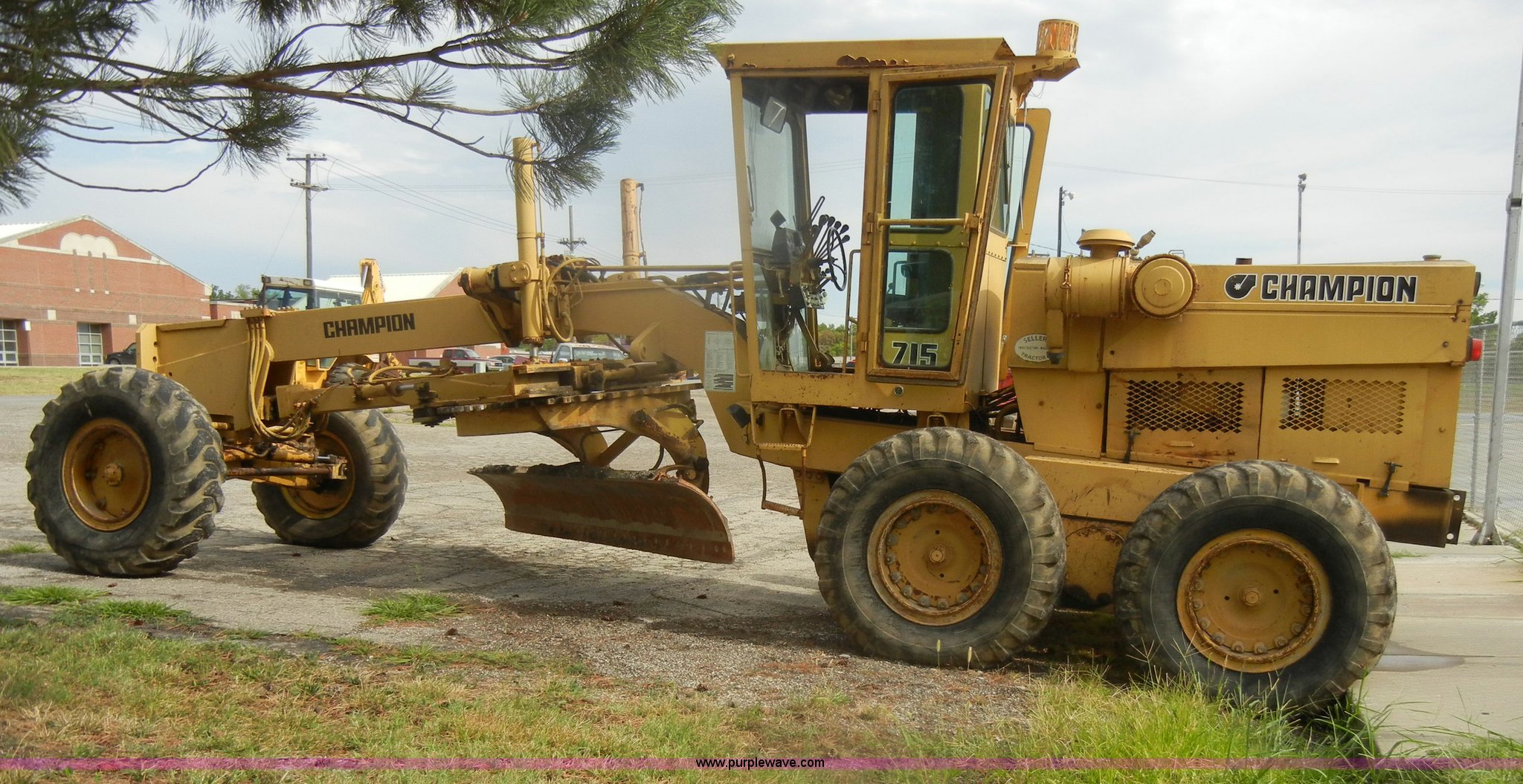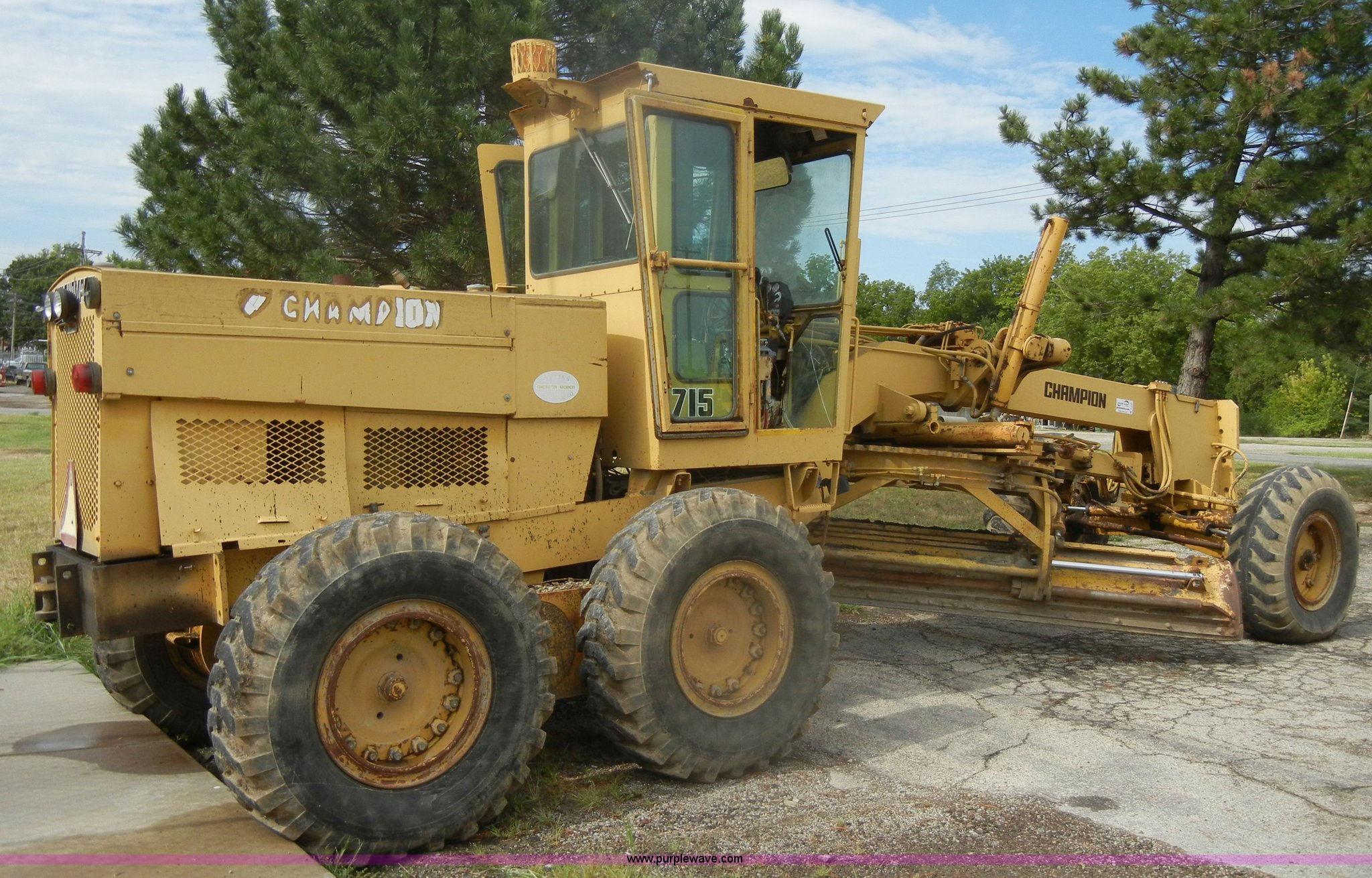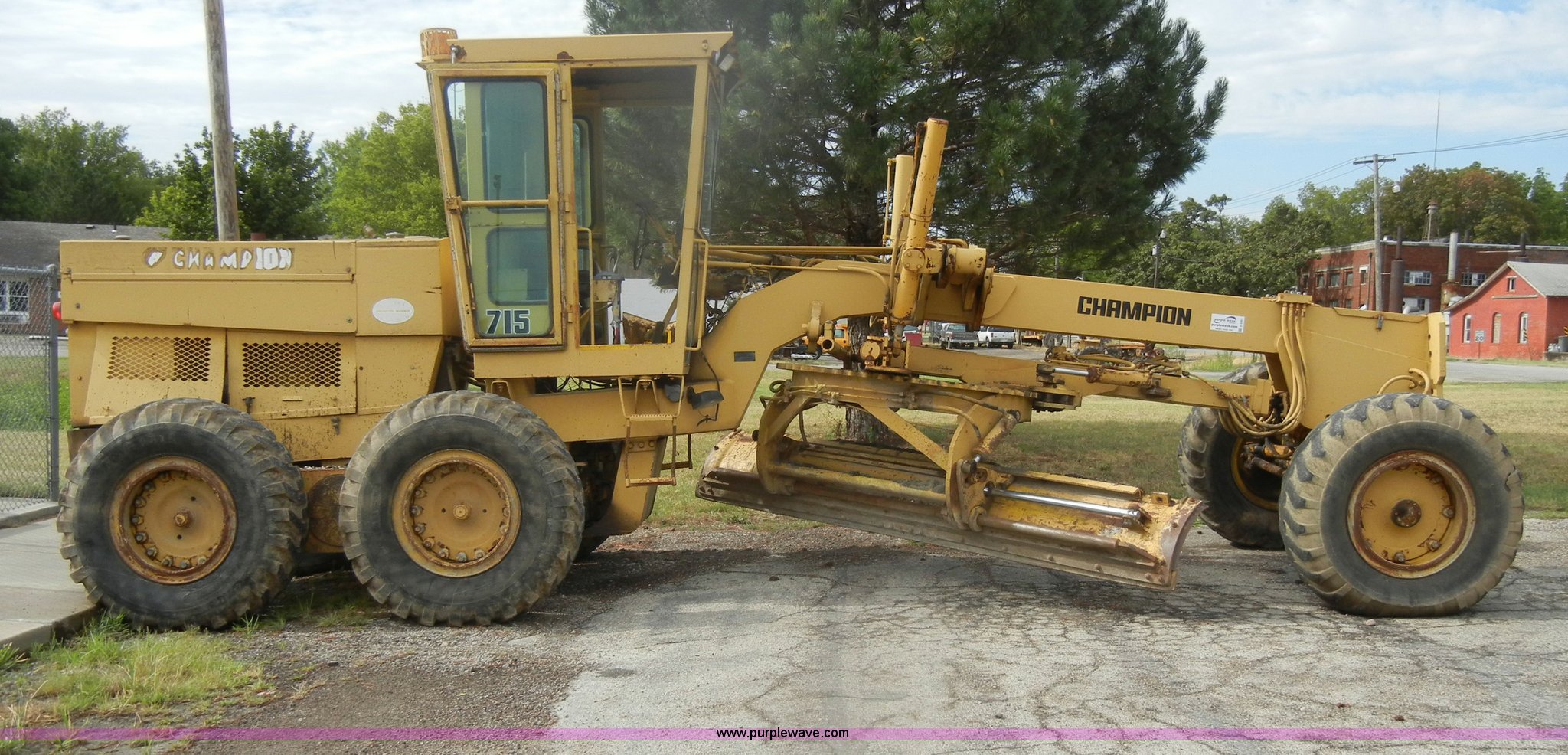Purple Wave is selling a used Motor Grader in Kansas. This item is a 1979 Champion 715 motor grader with the following: 2,820 hours on meter, Diesel engine, Manual transmission with Hi-Lo, 3F-2R gears, Hi-Lo,, Block heater, ROPS, Model 19655, Serial 0293-2, AM/FM, Suspension seat, Front and rear work lights, 12' blade, Control for scarifier, Scarifier not included, (6) blade control valves, 14.00-24 tires, Cracked lower glass, Serial 7151414303022