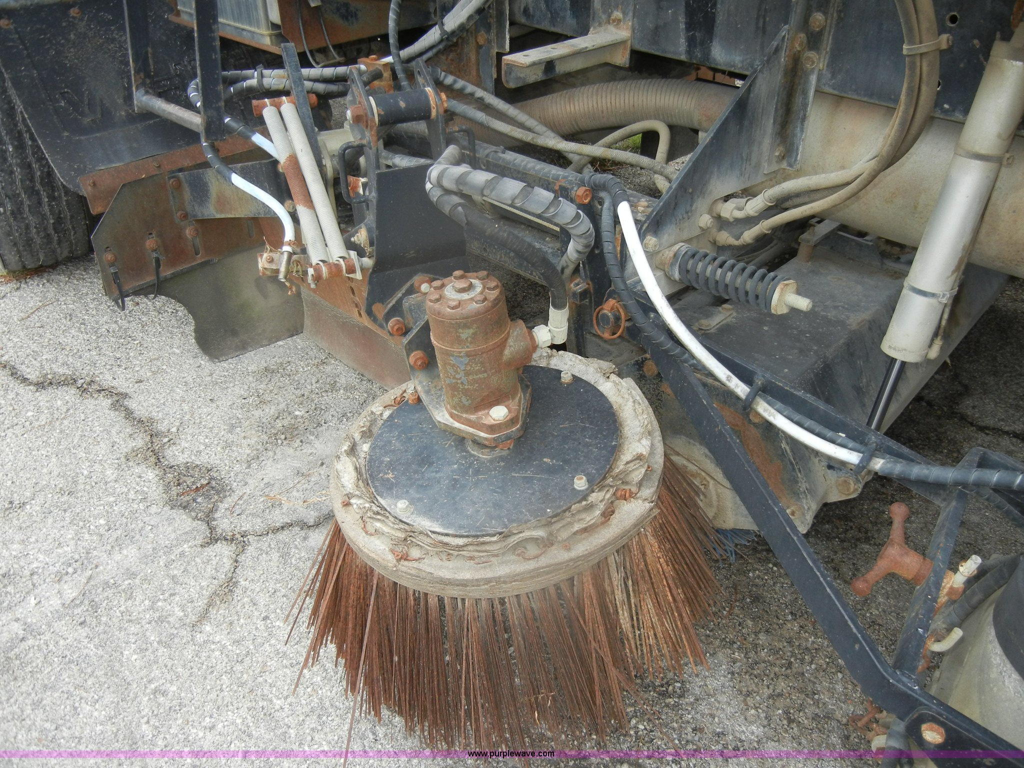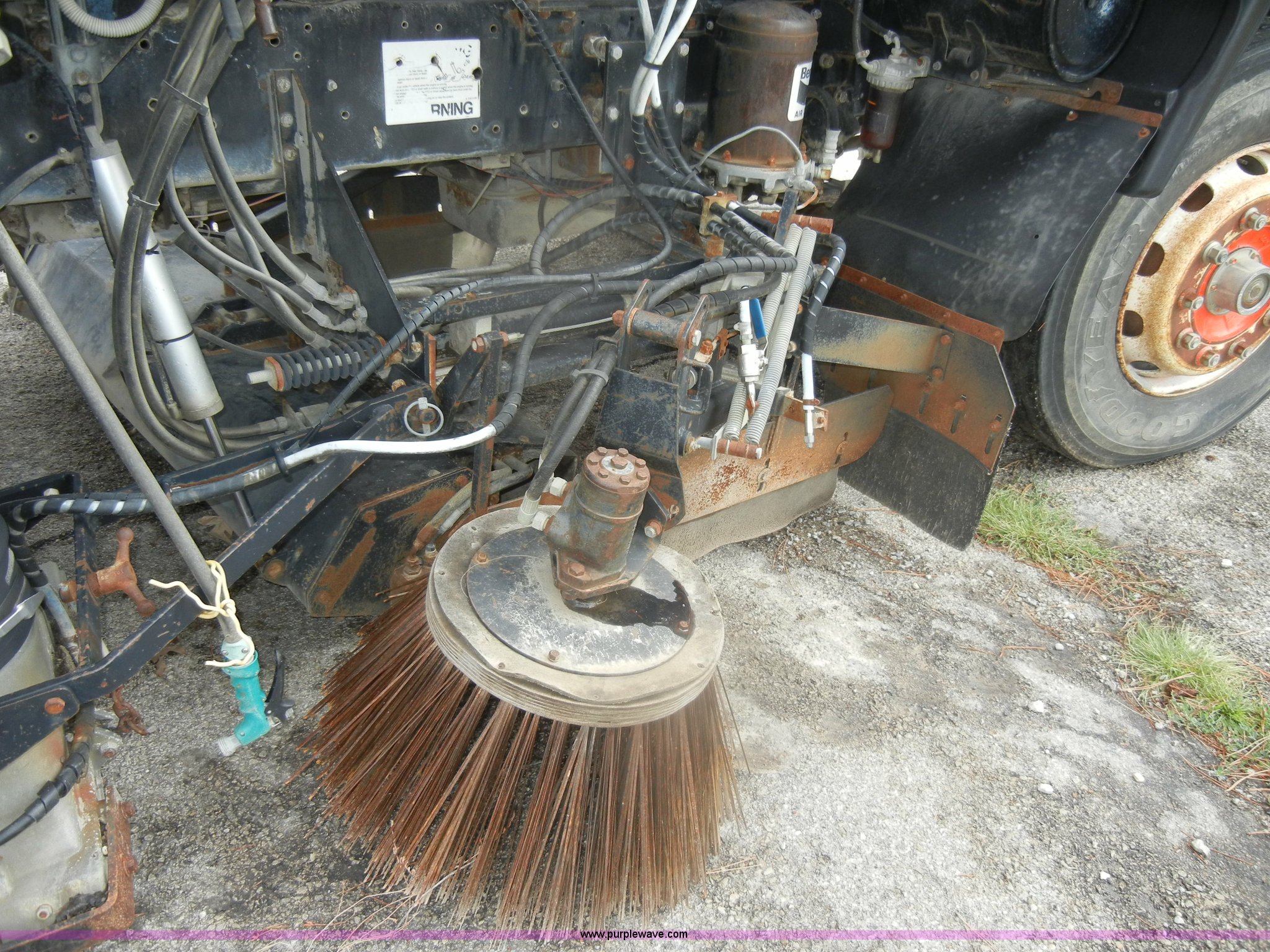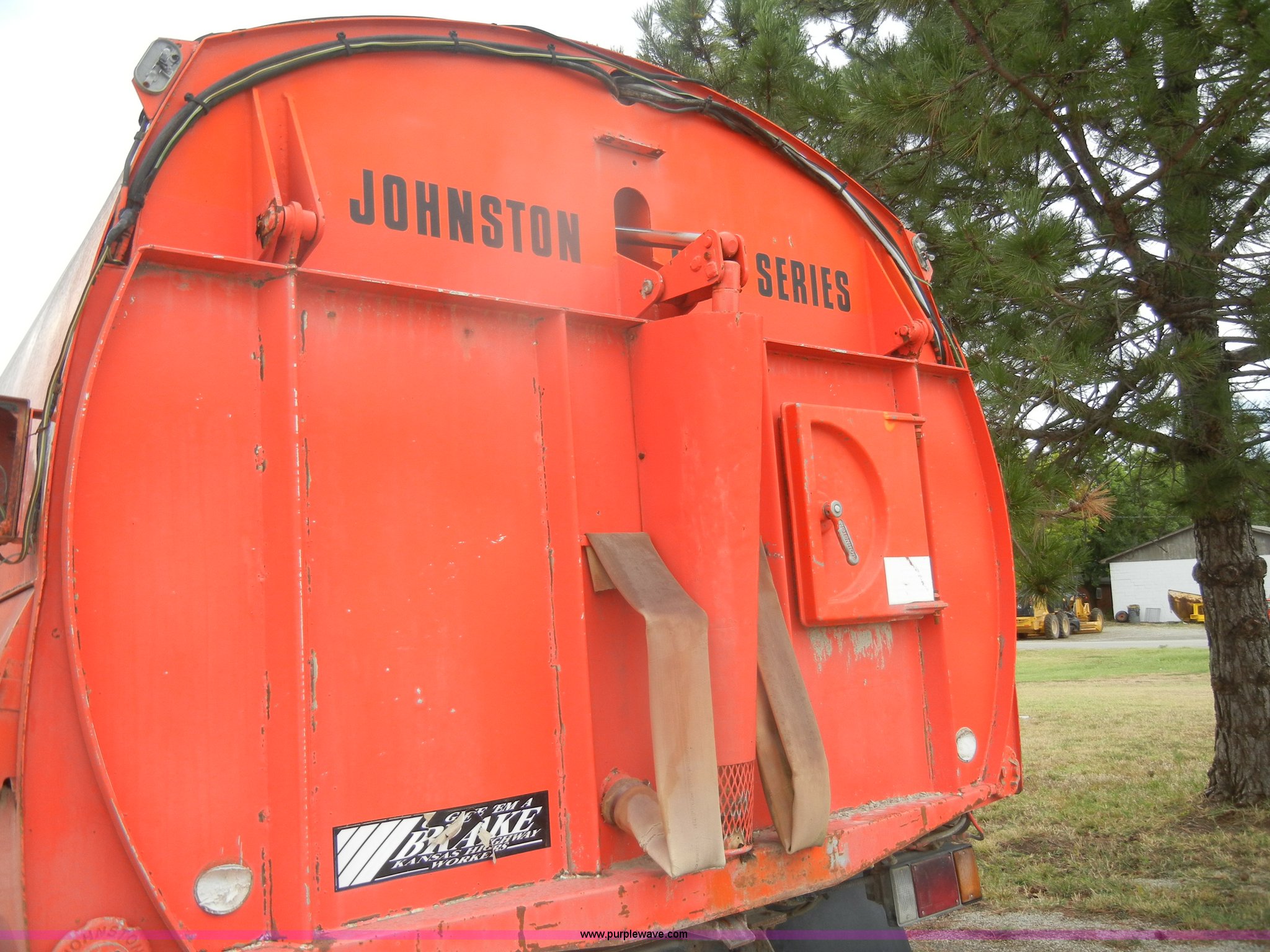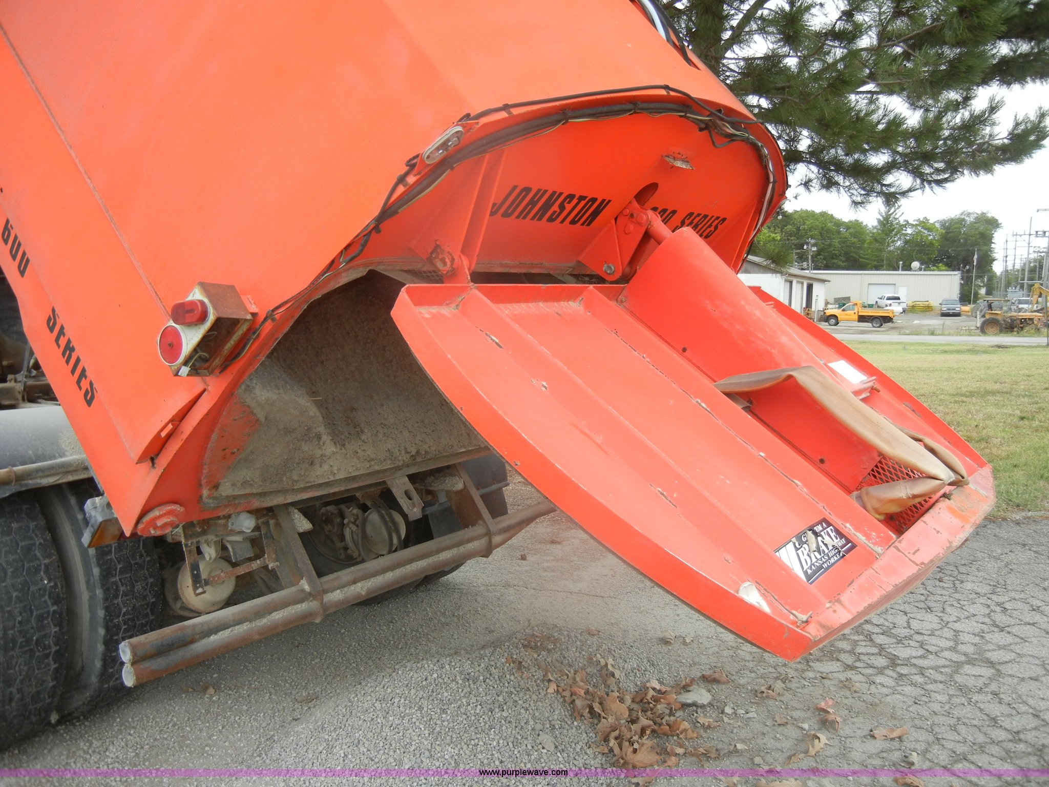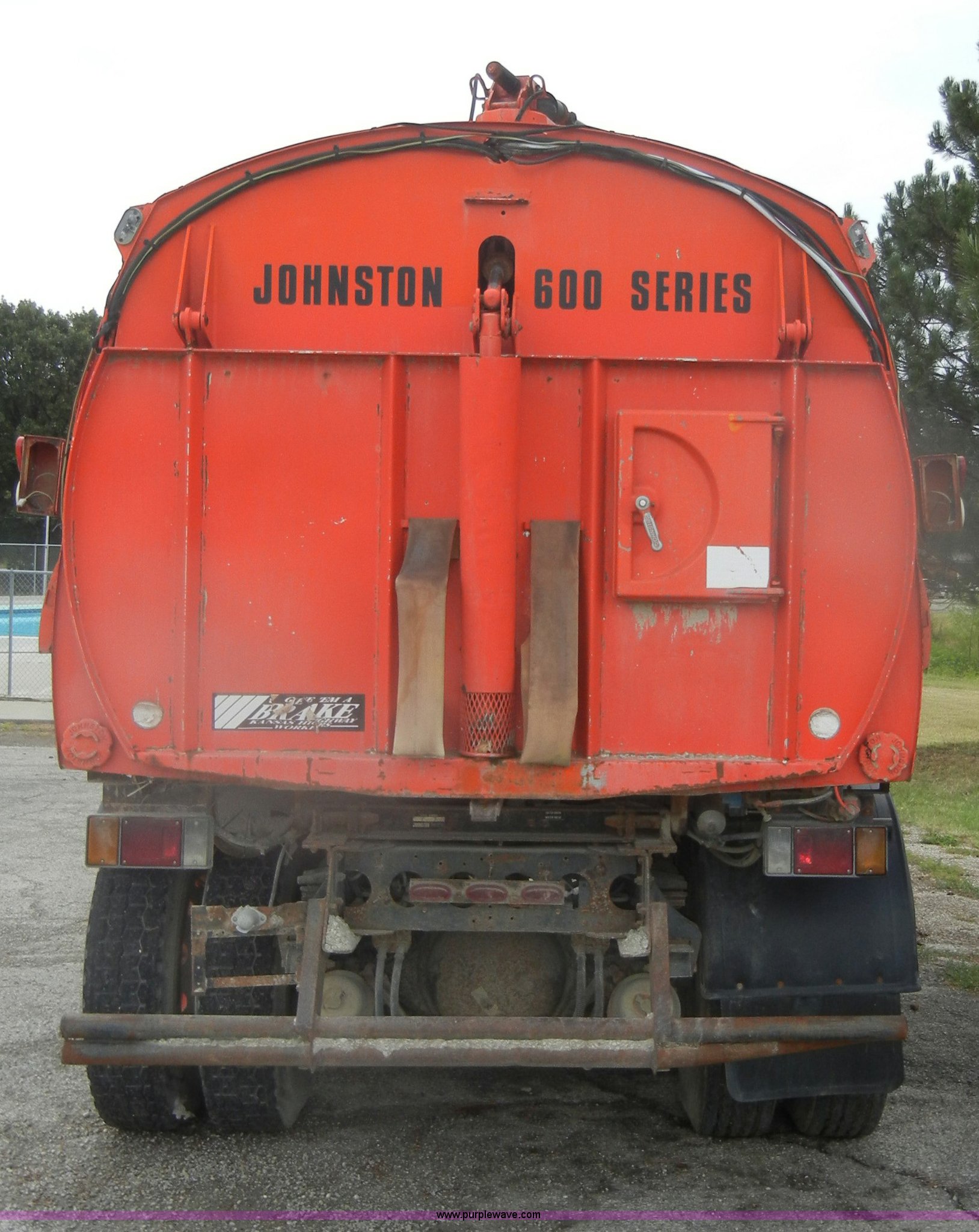 Purple Wave is selling a used Street Sweeper Truck in Kansas. This item is a 1992 GMC Johnston 600 street sweeper with the following: 9,092 hours on meter, 165,254 miles on odometer, Auxiliary diesel engine, Perkins 1004-4, 5,246 hours on meter, Inter-cooled, Automatic transmission, Heat, AM/FM, Power steering, Heated mirrors, Manual windows and locks, Cloth interior, 55" center broom, (2) 18" outer brooms, 2,000 gallon water tank, Air brakes, Spring suspension, Front tow hooks, Chelsea PTO, Backup alarm, 11R22.5 tires, GVWR 31,080 lbs, FAWR 10,800 lbs, RAWR 20,720 lbs, Manual included, Wiper blades need replaced, Interior/exterior cosmetic damage, Side suction hose missing on one unit, Needs ignition switch for rear unit, Must be hot wired to operate