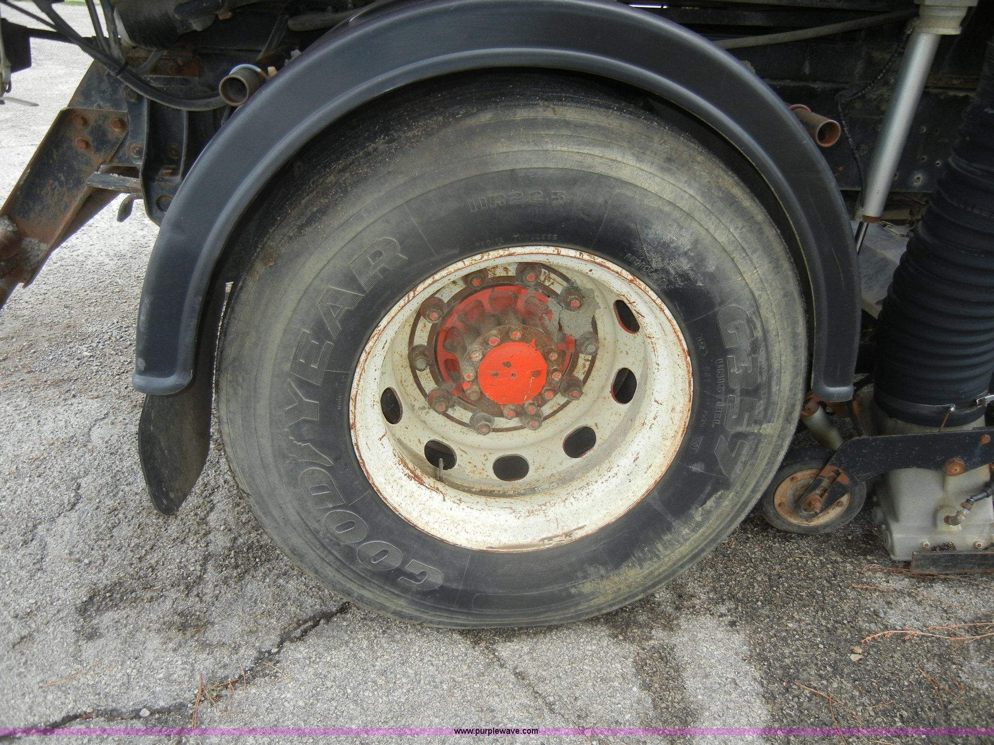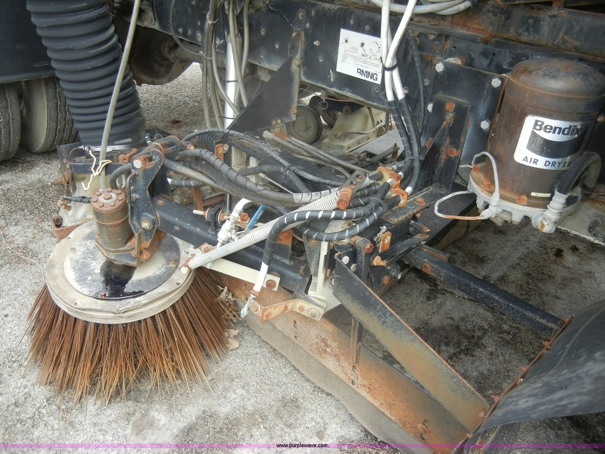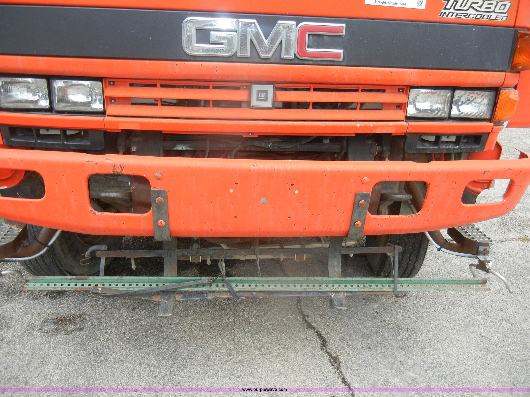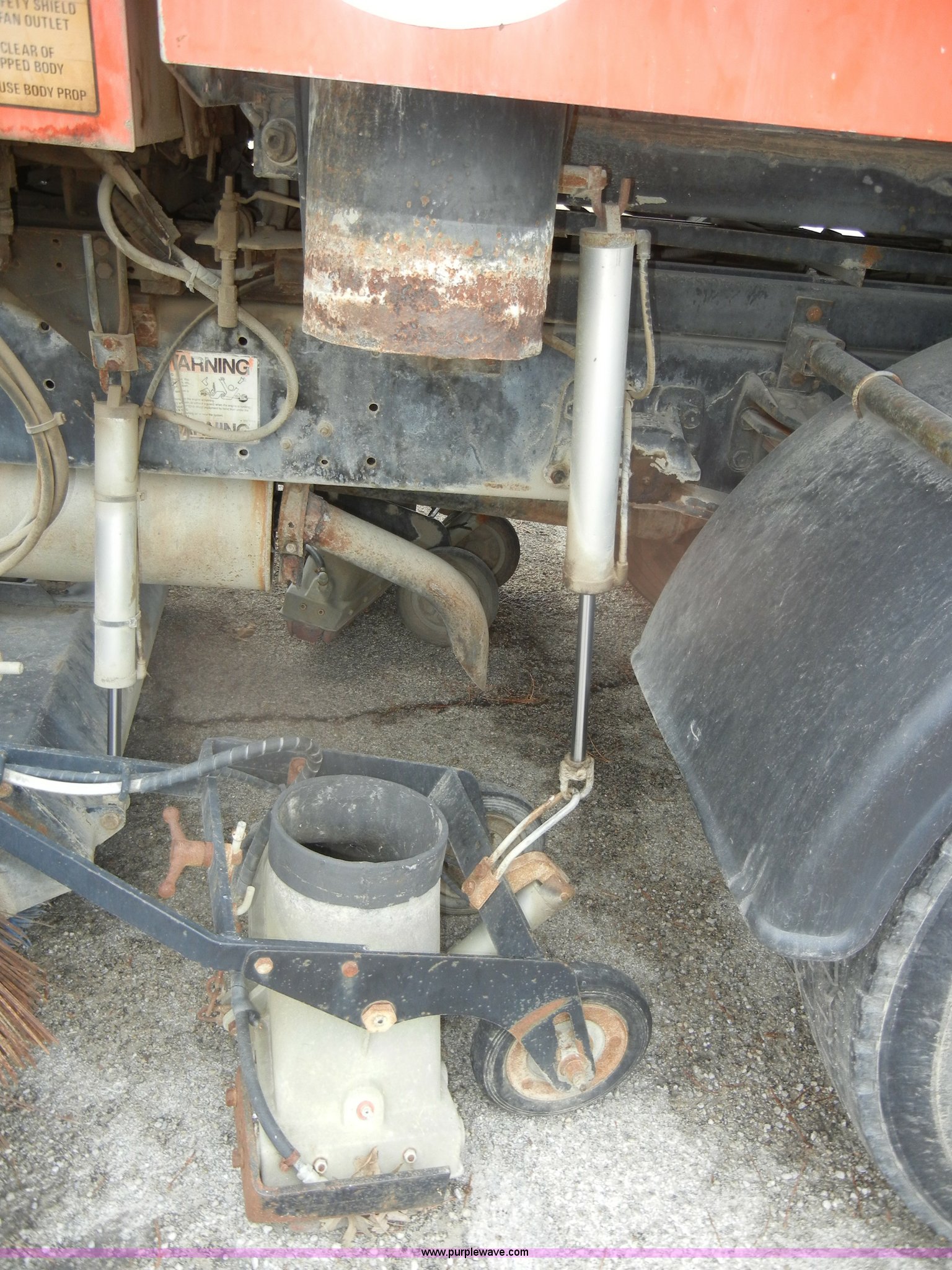 Purple Wave is selling a used Street Sweeper Truck in Kansas. This item is a 1992 GMC Johnston 600 street sweeper with the following: 9,092 hours on meter, 165,254 miles on odometer, Auxiliary diesel engine, Perkins 1004-4, 5,246 hours on meter, Inter-cooled, Automatic transmission, Heat, AM/FM, Power steering, Heated mirrors, Manual windows and locks, Cloth interior, 55" center broom, (2) 18" outer brooms, 2,000 gallon water tank, Air brakes, Spring suspension, Front tow hooks, Chelsea PTO, Backup alarm, 11R22.5 tires, GVWR 31,080 lbs, FAWR 10,800 lbs, RAWR 20,720 lbs, Manual included, Wiper blades need replaced, Interior/exterior cosmetic damage, Side suction hose missing on one unit, Needs ignition switch for rear unit, Must be hot wired to operate