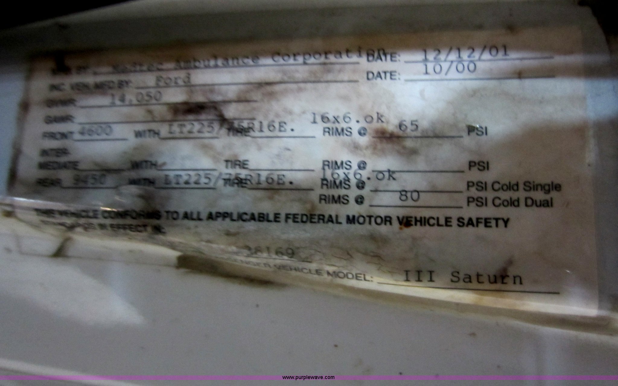 Take a look at this used 2001 Ford E350 ambulance being sold on September 11th, 2012 in the SOLD! Tuesday September 11 Government Auction made by Ford. Take a look at all of the item information below or take a look at similar auctions for Passenger Vehicles.