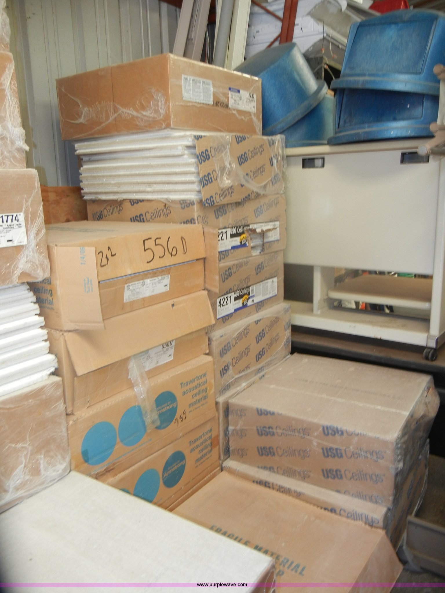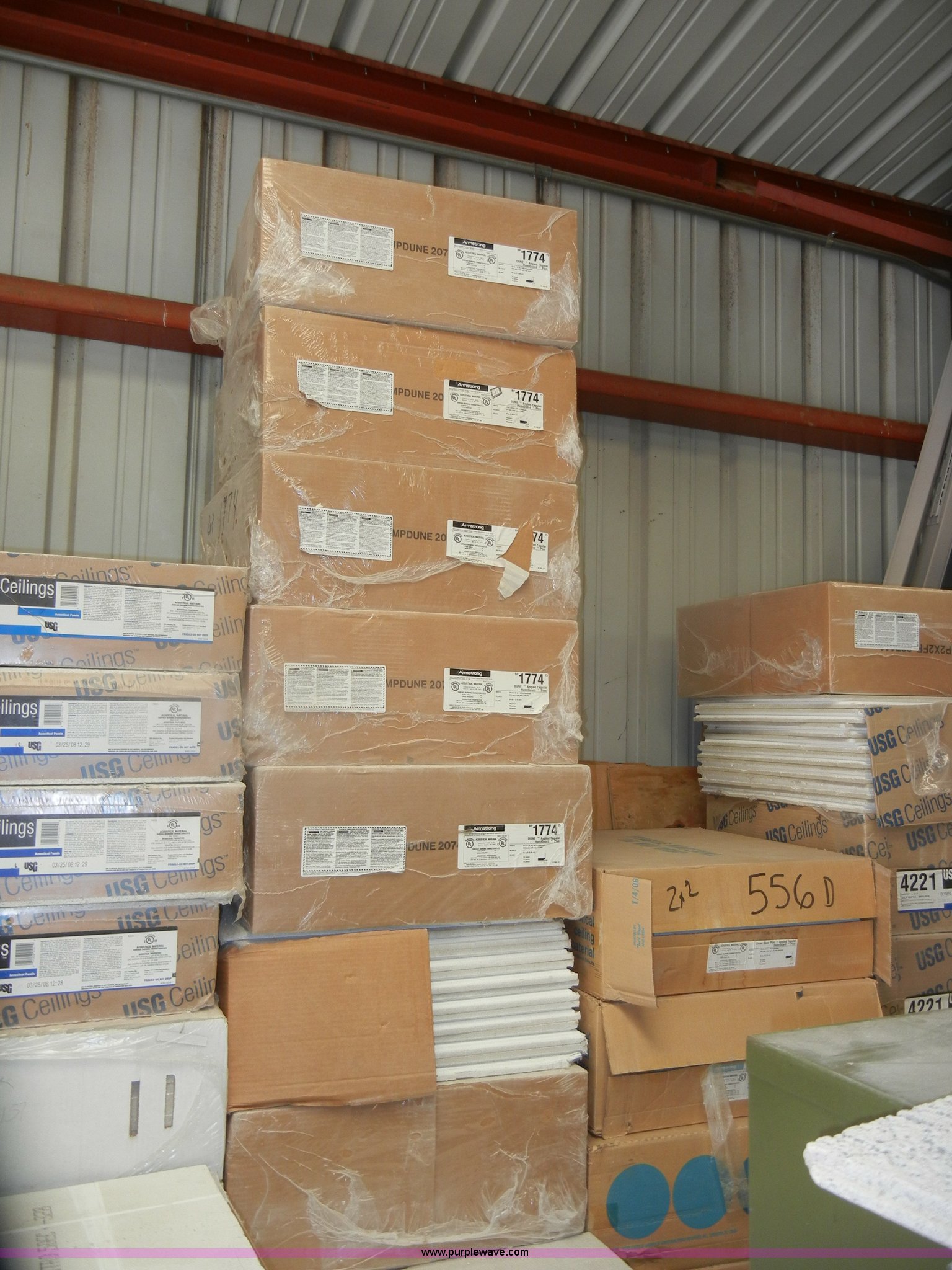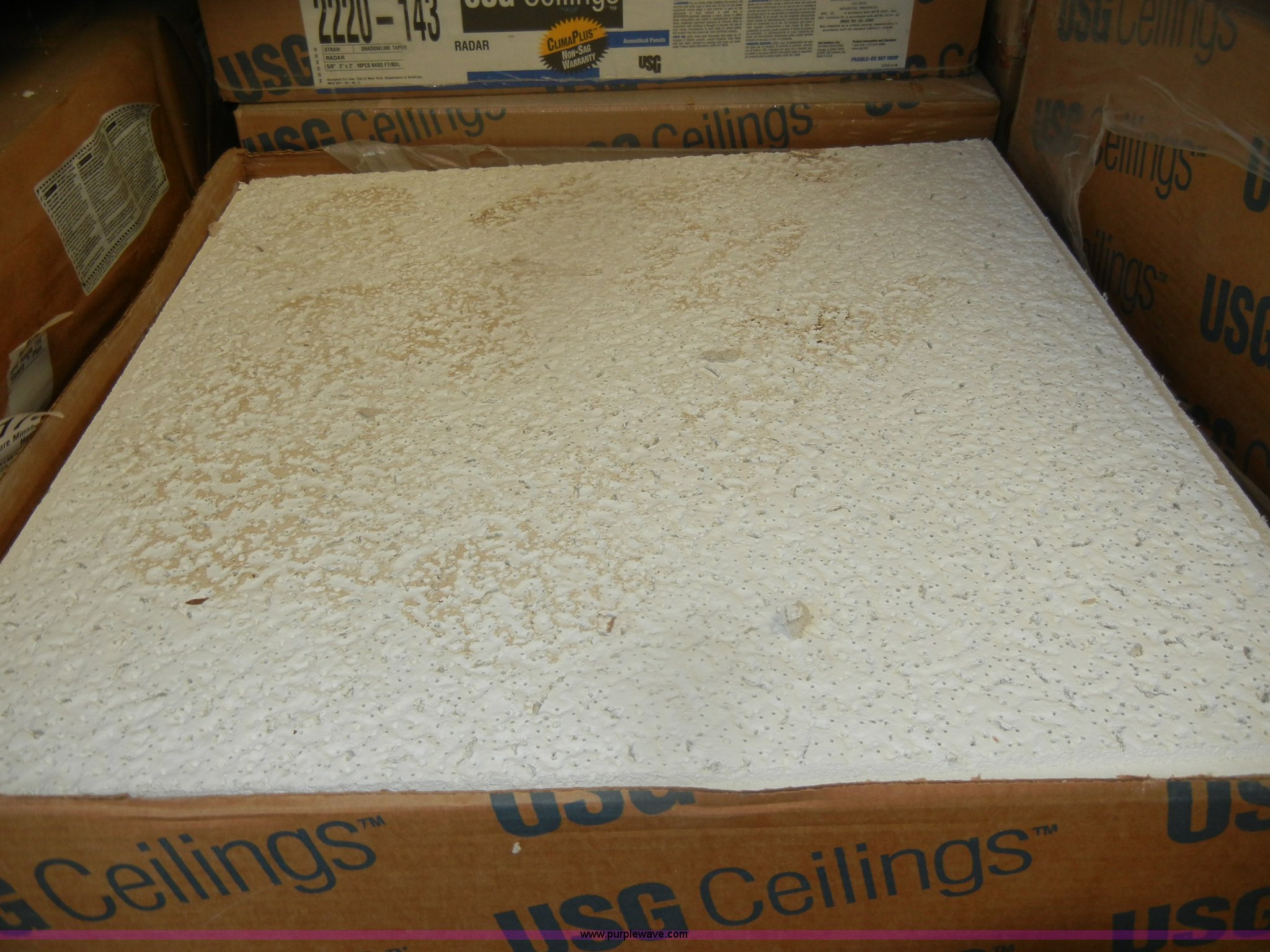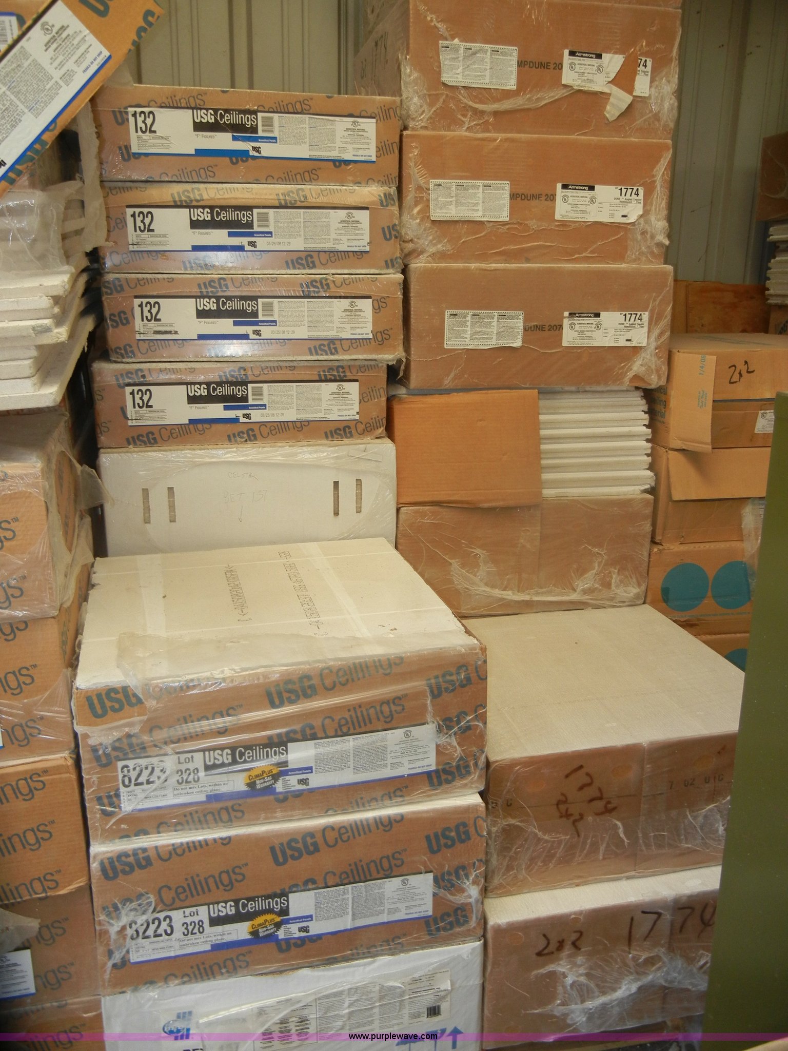 Purple Wave is selling a used Home Improvement in Kansas. This item is a Assorted boxes of ceiling tile with the following: USG, 2' x 2' x 5/8", (15) cases, 16/case, 2' x 2' x 3/4", (17) cases, 12/case,, Celotex, 2' x 2' x 5/8", (5) cases, 16/case,, Armstrong, 2' x 2' x 5/8", (11) cases, 16/case, 2' x 2' x 7/8", (6) cases, 10/case,