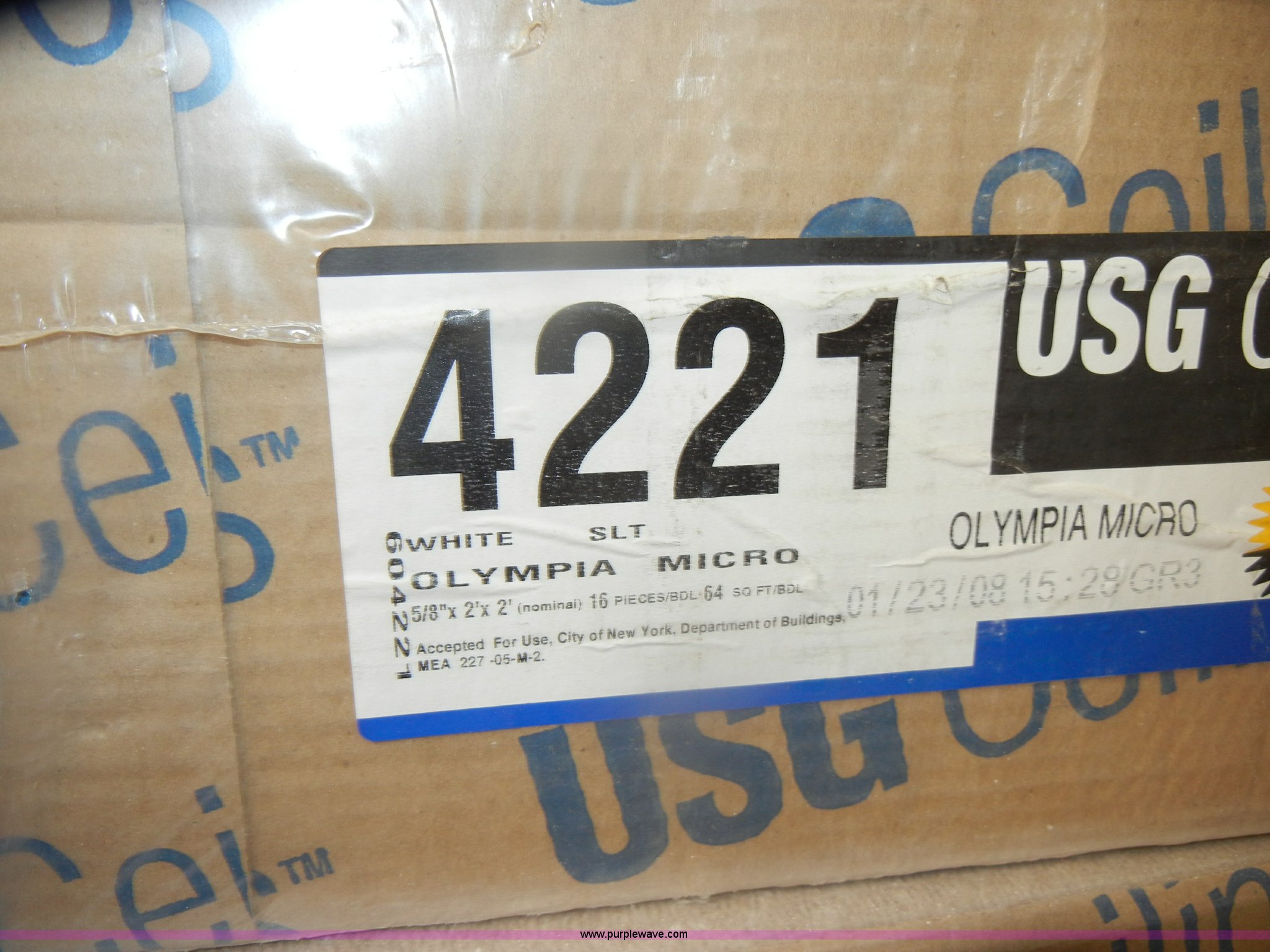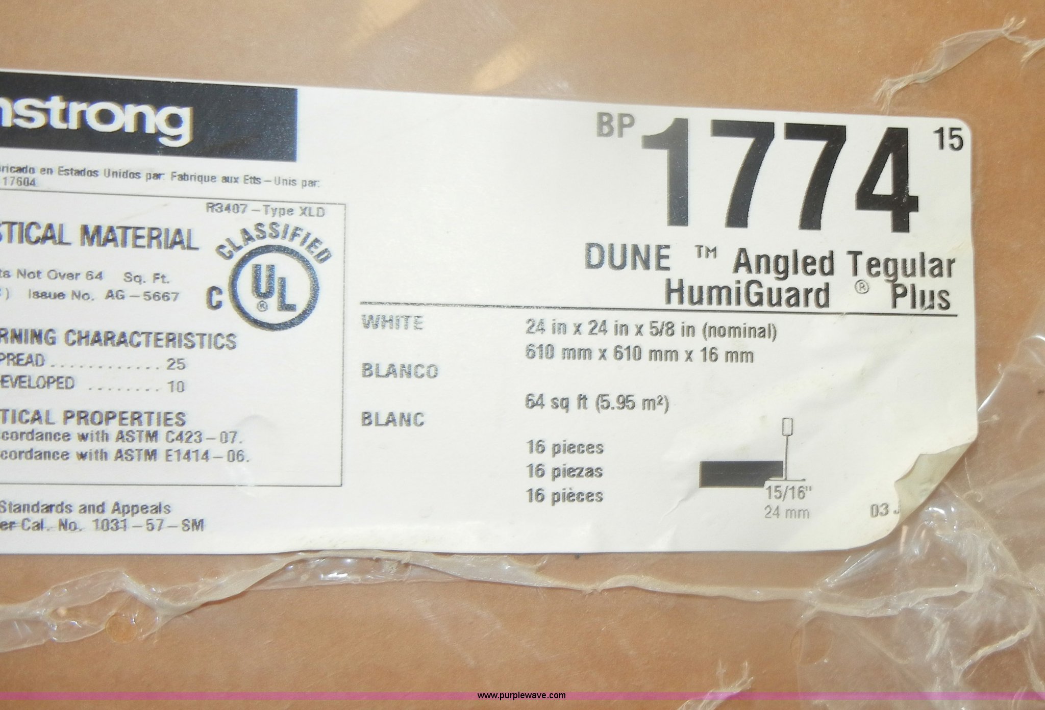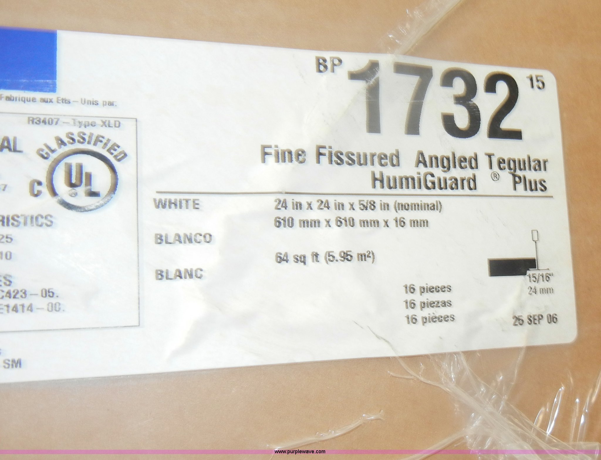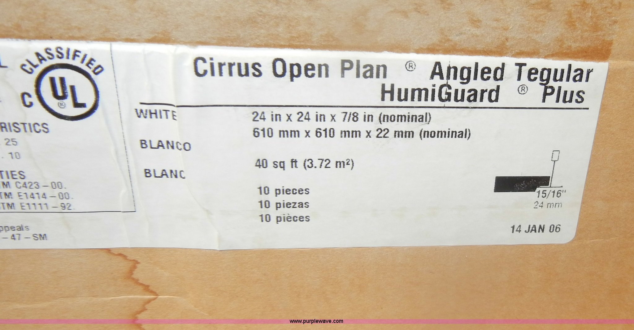 Purple Wave is selling a used Home Improvement in Kansas. This item is a Assorted boxes of ceiling tile with the following: USG, 2' x 2' x 5/8", (15) cases, 16/case, 2' x 2' x 3/4", (17) cases, 12/case,, Celotex, 2' x 2' x 5/8", (5) cases, 16/case,, Armstrong, 2' x 2' x 5/8", (11) cases, 16/case, 2' x 2' x 7/8", (6) cases, 10/case,