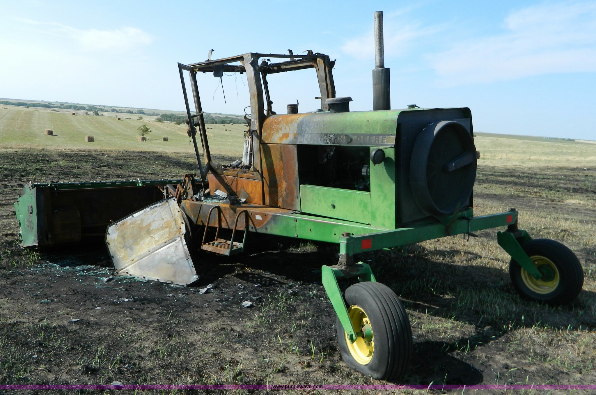 Purple Wave is selling a used Windrower Self Propelled in Kansas. This item is a John Deere 3830 swather with the following: Diesel engine, Serial T04C39T400218, 300A twin knife header, Salvage only, Substantial fire damage, Serial E03830X954429