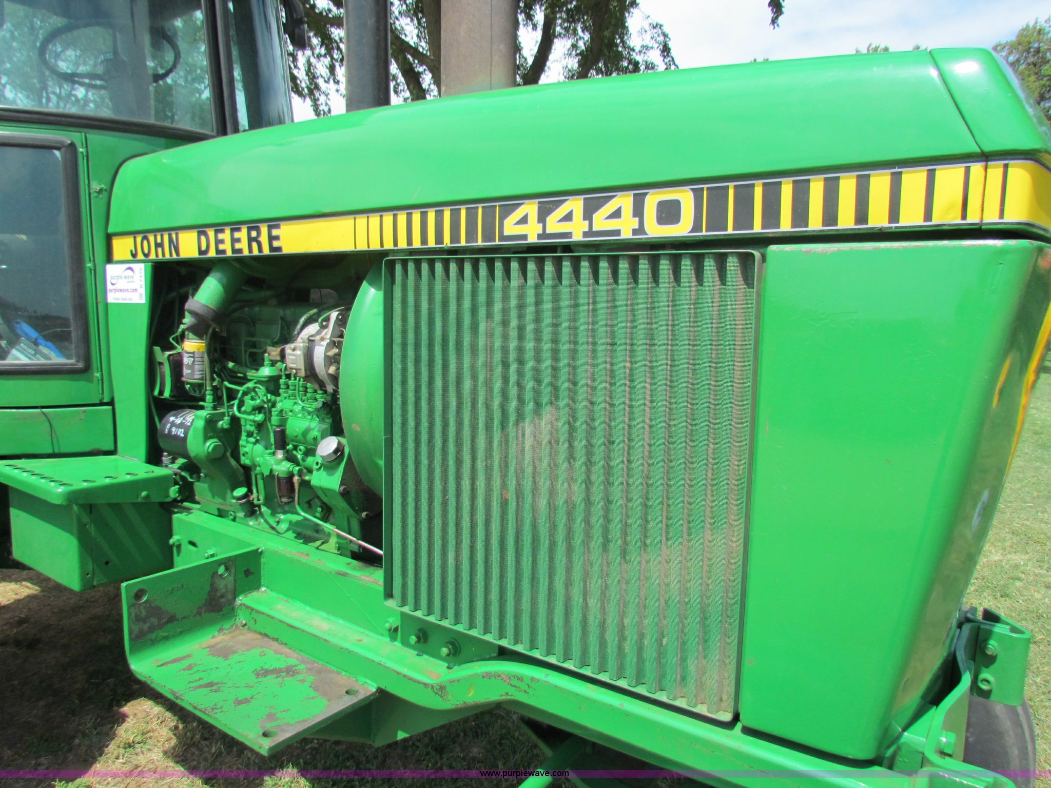 Purple Wave is selling a used Tractor in Kansas. This item is a 1980 John Deere 4440 tractor with the following: 9,359 hours on meter, John Deere six cylinder diesel engine, Serial 6466TR04129678AA, Eight speed powershift transmission, AC and heat, Three point, Three point quick attach, Draw bar, 540/1000 PTO, (3) rear hydraulic remote sets, Changed over to Pioneer ends, 11.00-16 front tires, 18.4-38 rear tires, Duals included, Alternator, radiator, wheel seals, batteries, and rear brakes replaced less than one year ago, Recently replaced hydraulic steering lines in column, Recently replaced cab interior and paint/decals, Approx. $6,500 in parts/repairs in the last year, Contents in cab not included, Monitors not included, Mounts for loader not included, will be removed, Serial 4440P038232R