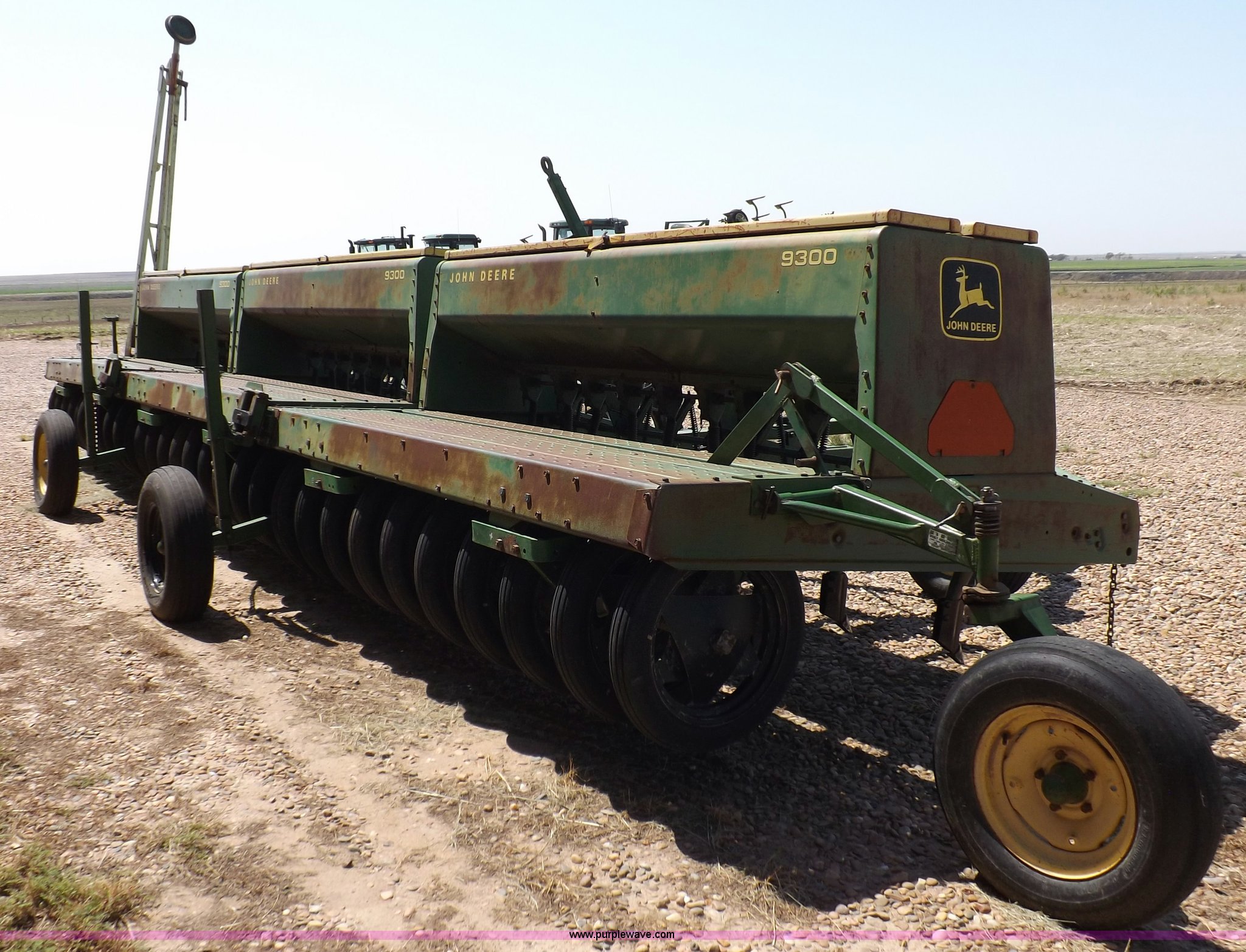 Purple Wave is selling a used Grain Drill or Seeder in Kansas. This item is a John Deere 9300 split row drill with the following: (30) rows, 30'L toolbar, 12" spacing, Bulk fill, Mechanical seed delivery, Mechanical row meters, Ground driven meter system, Hydraulic markers, M&M transports, Serial 013812N, 013796N, 013808N