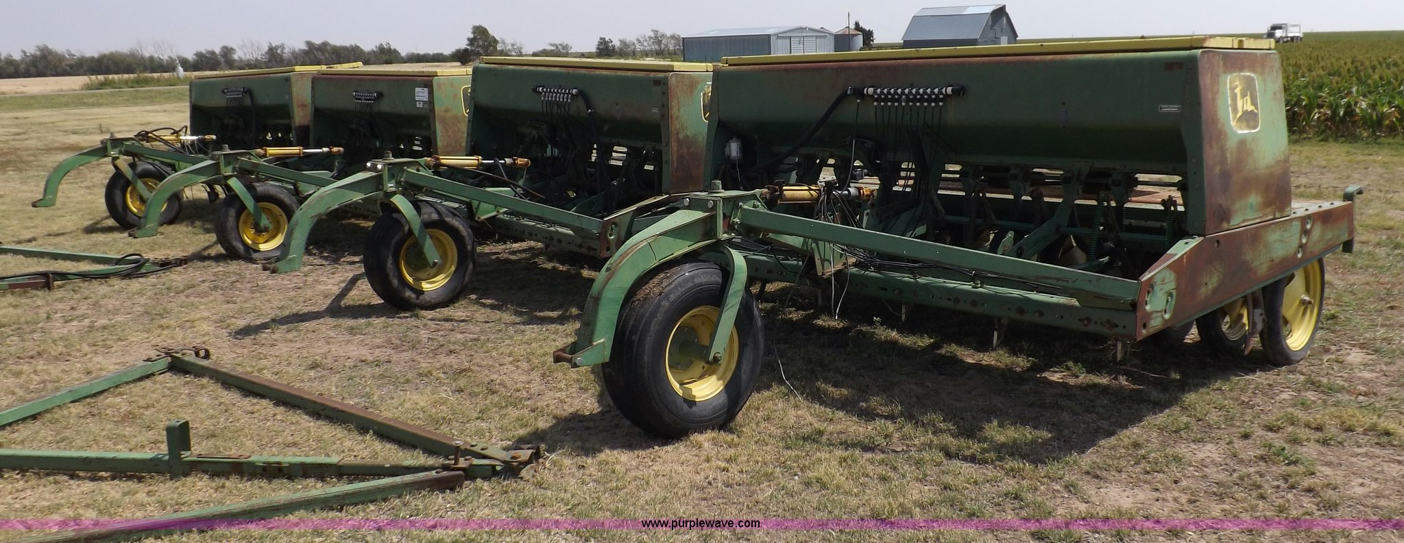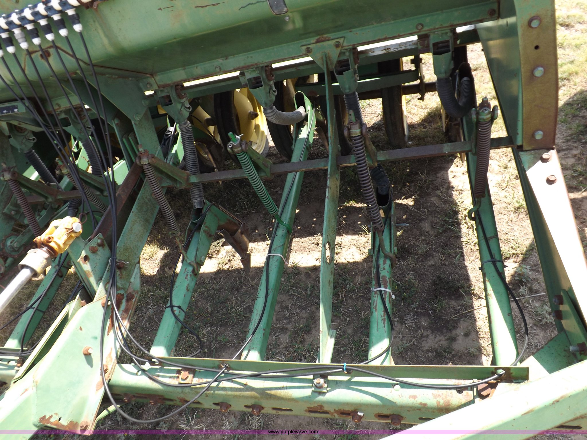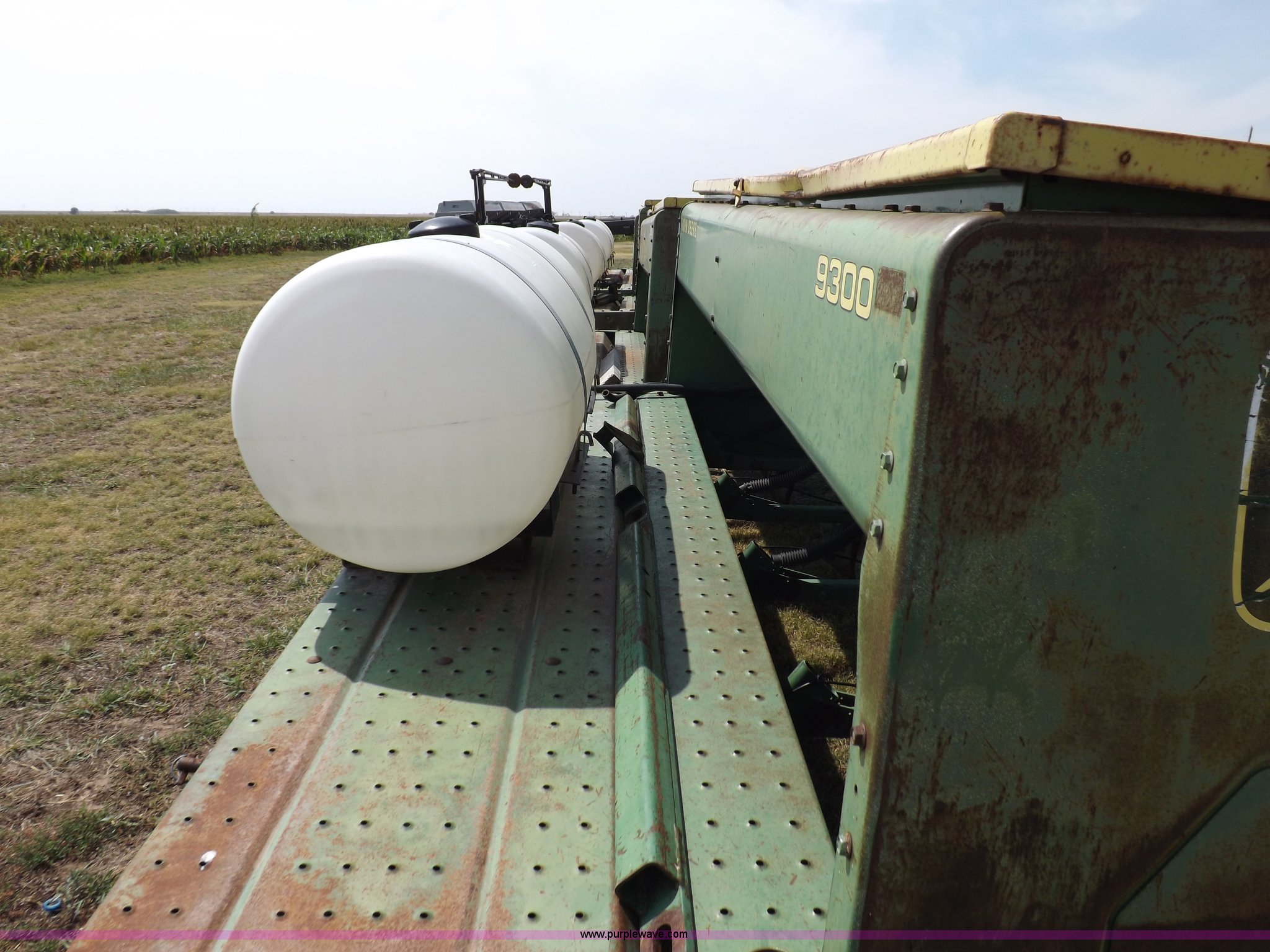 Purple Wave is selling a used Grain Drill or Seeder in Kansas. This item is a John Deere 9300 32' drill with the following: 12" spacing, (36) openers, Liquid fertilizer tubes, (4) 85 gallon fertilizer tanks, (2) liquid fertilizer pumps, Spear point openers, (2) 8' units, (2) 10' units, Single rib rubber press wheels, Some parts missing, Serial 001916N, 000927N, 00944N, 001541N