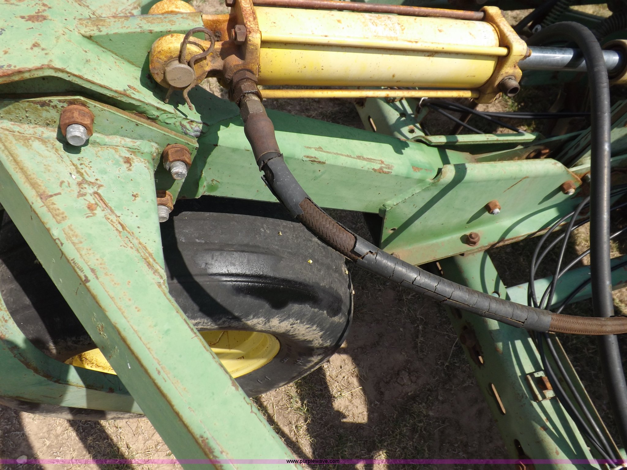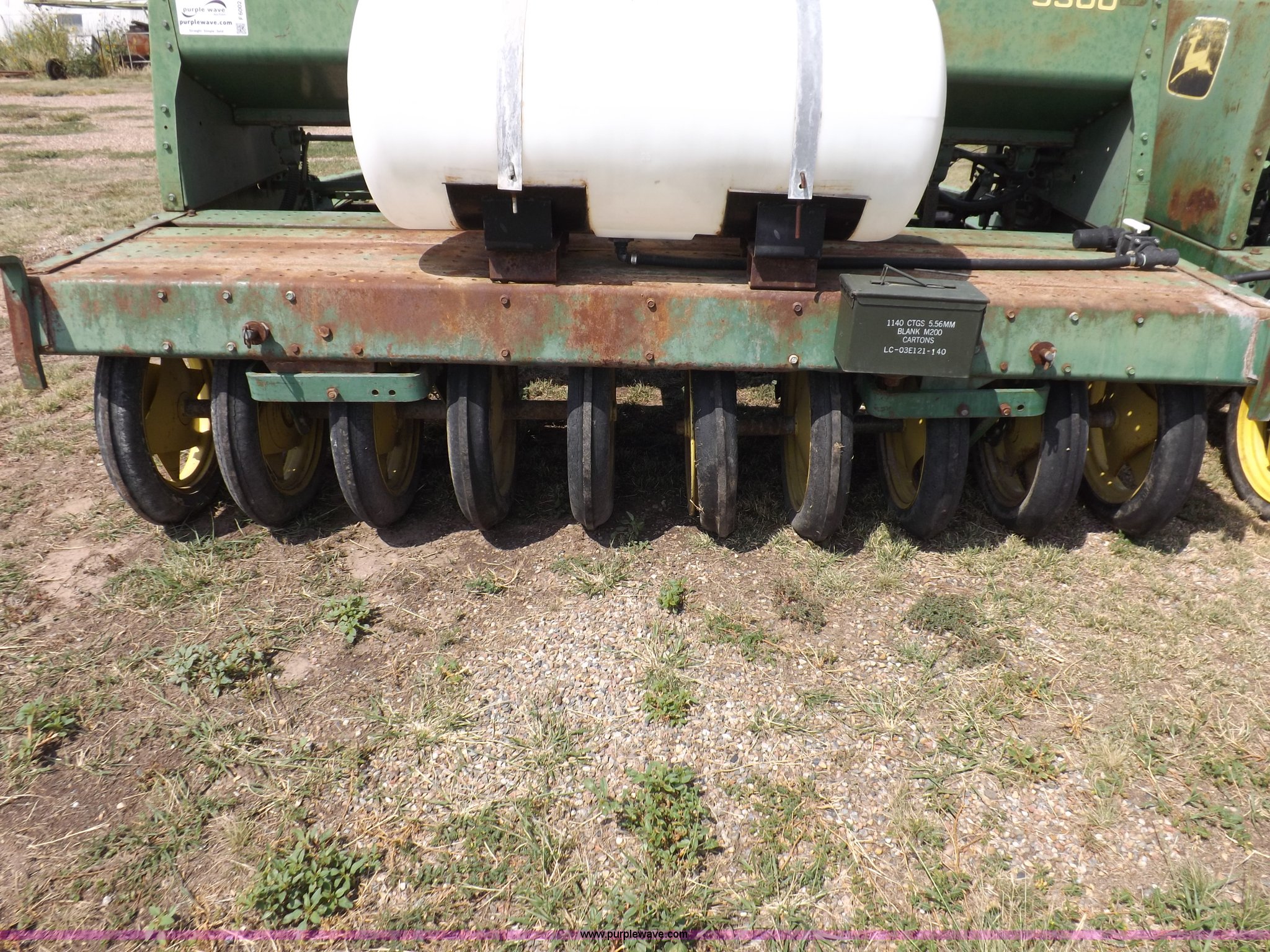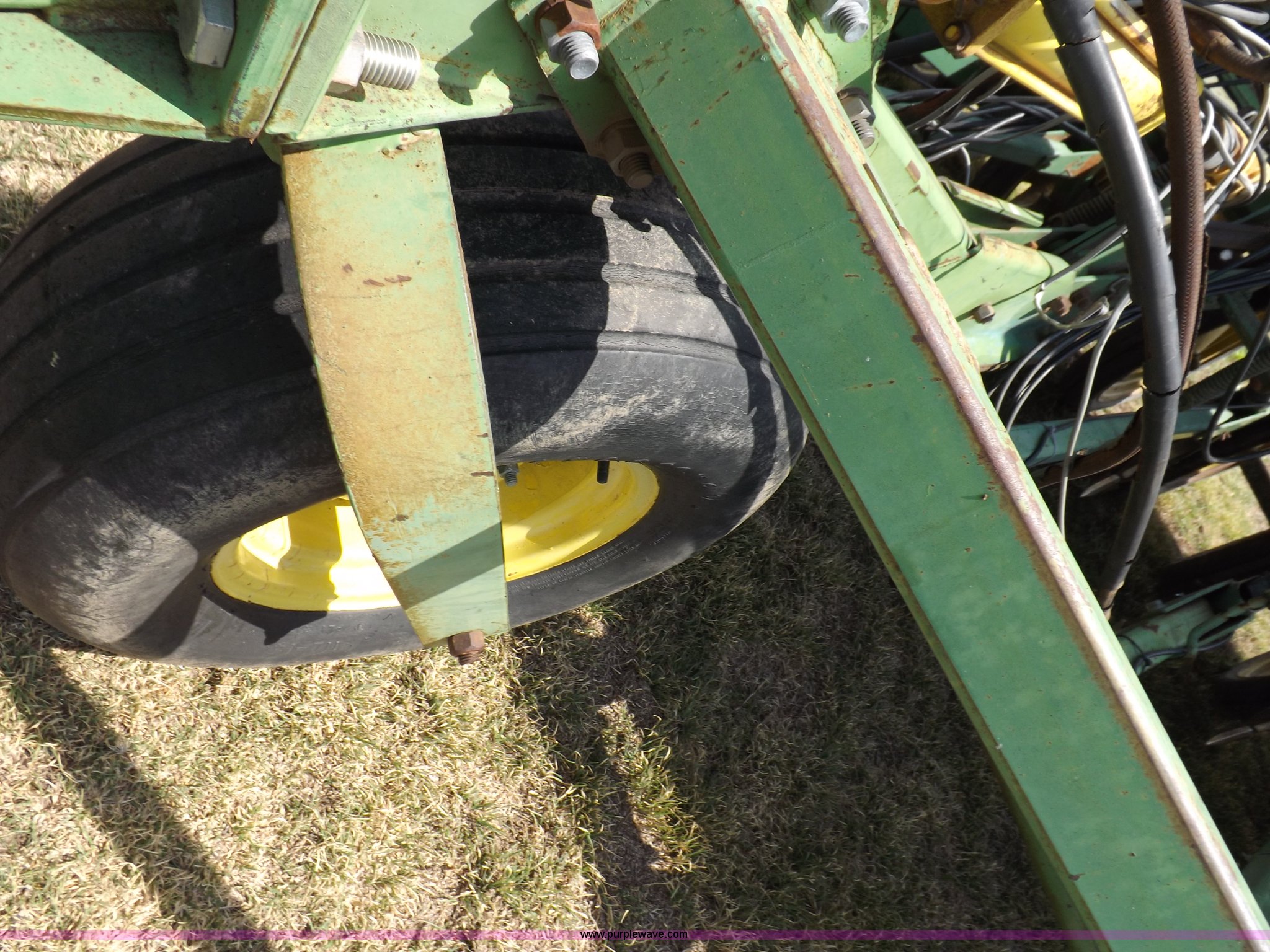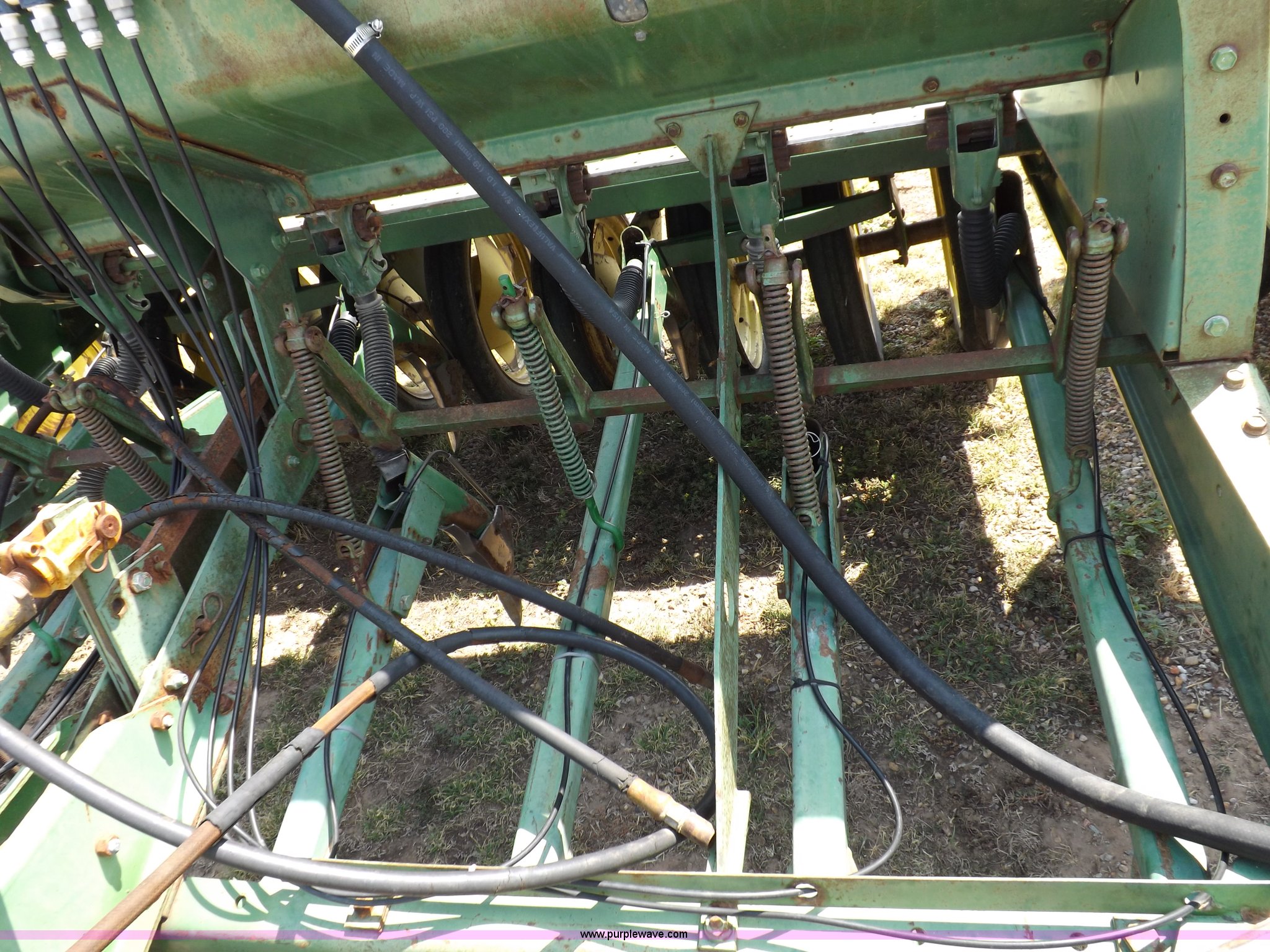 Purple Wave is selling a used Grain Drill or Seeder in Kansas. This item is a John Deere 9300 32' drill with the following: 12" spacing, (36) openers, Liquid fertilizer tubes, (4) 85 gallon fertilizer tanks, (2) liquid fertilizer pumps, Spear point openers, (2) 8' units, (2) 10' units, Single rib rubber press wheels, Some parts missing, Serial 001916N, 000927N, 00944N, 001541N