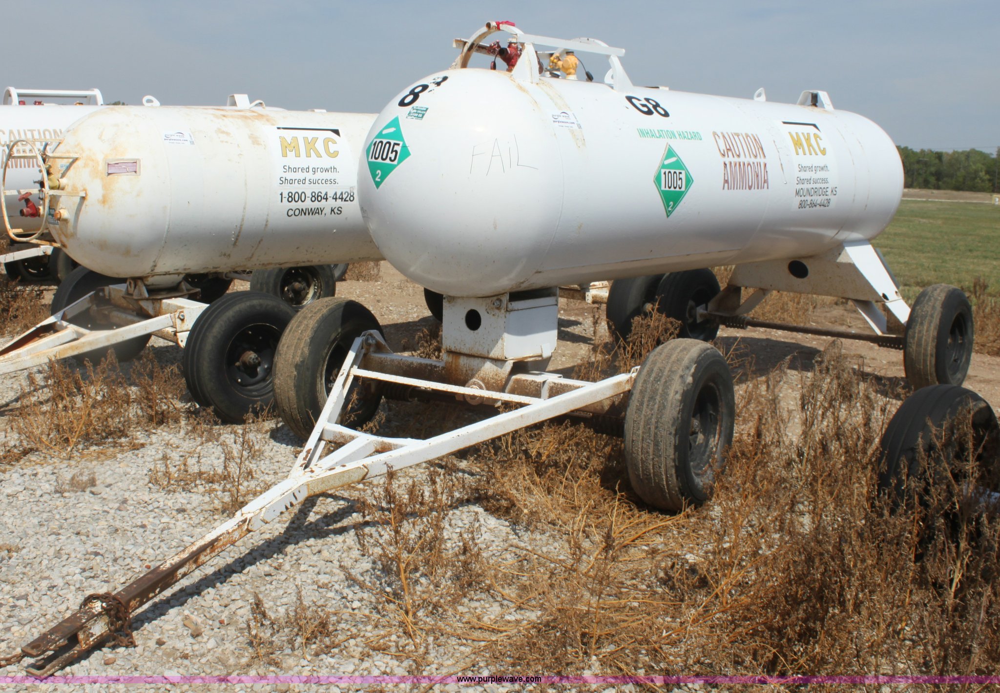 1,000 gallon anhydrous ammonia tank. Top mount valves, Pin hitch, 11L-15 tires, Unit did not pass DOT inspection. Shipping quotes available. Mid Kansas Coop. 1361 Conway Trail. Conway, KS 67460