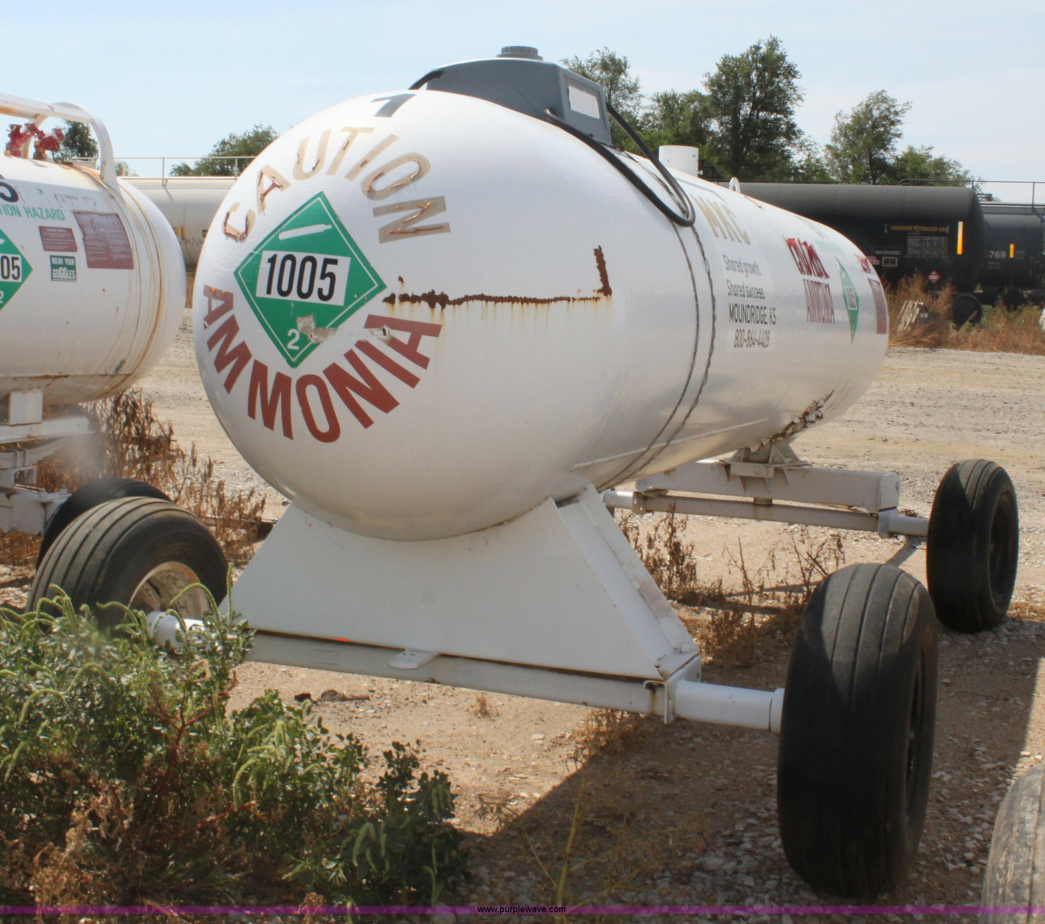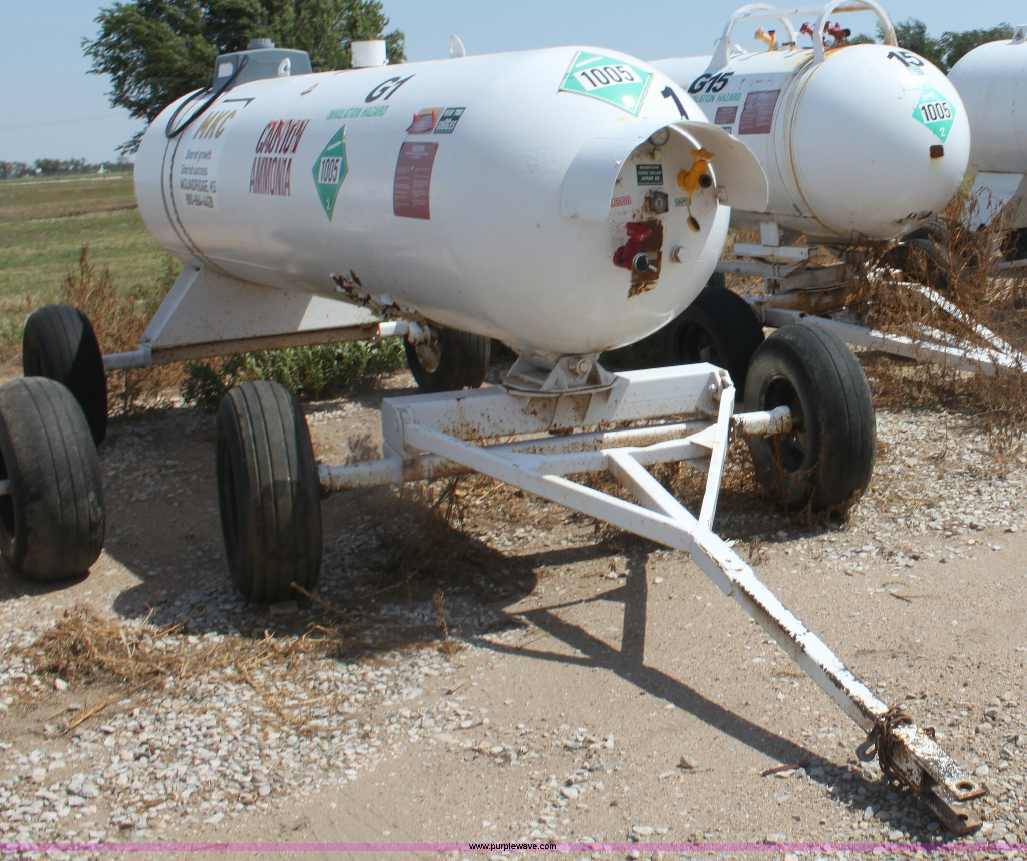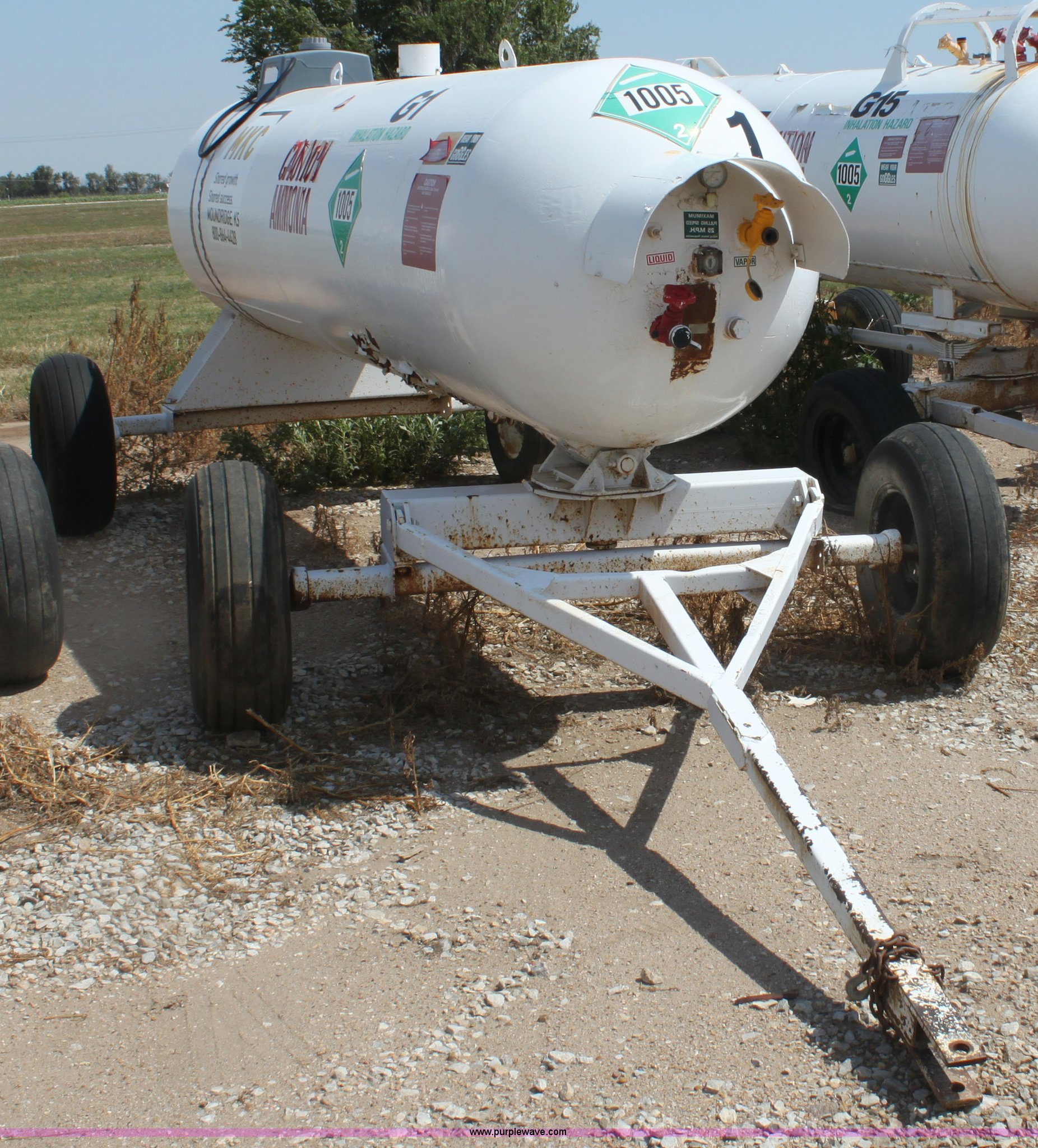 Purple Wave is selling a used Applicator Attach. in Kansas. This item is a 1,000 gallon anhydrous ammonia tank with the following: Front mount valves, Pin hitch, 11L-15 tires, Unit did not pass DOT inspection