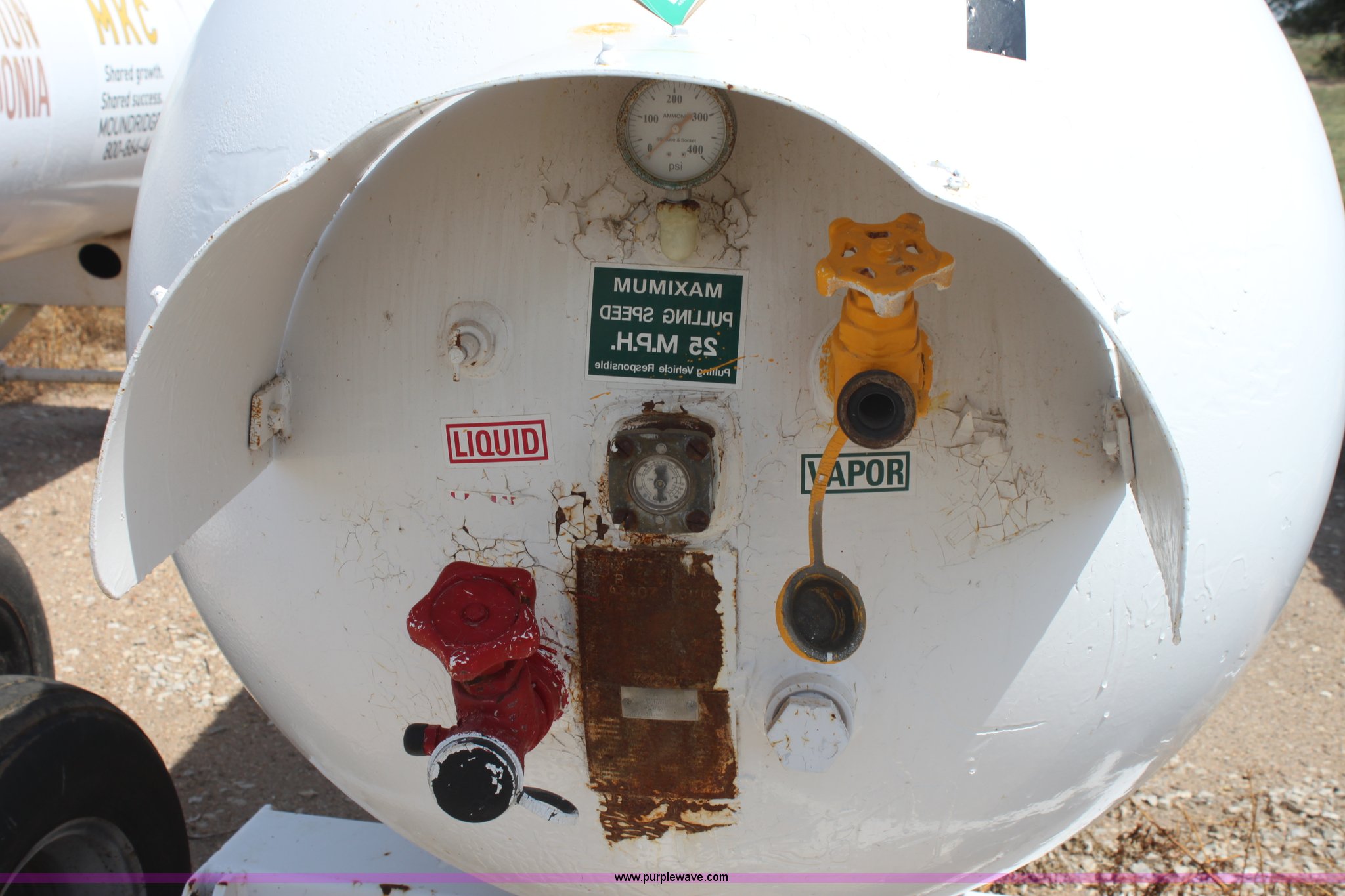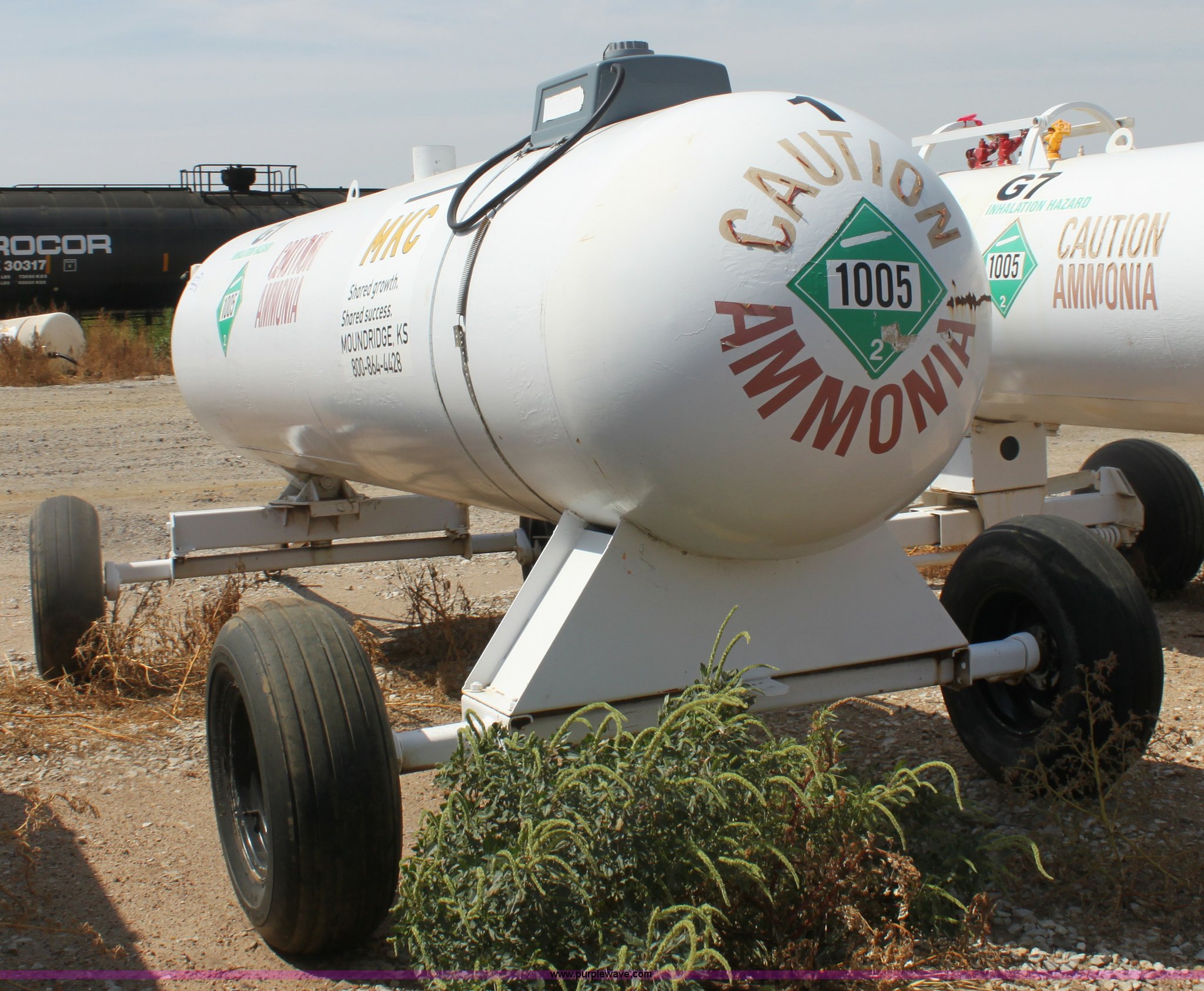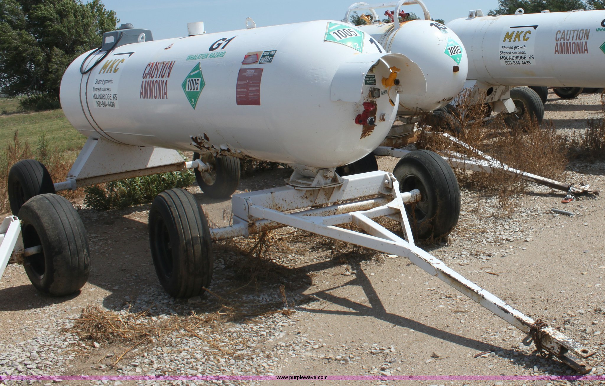 Purple Wave is selling a used Applicator Attach. in Kansas. This item is a 1,000 gallon anhydrous ammonia tank with the following: Front mount valves, Pin hitch, 11L-15 tires, Unit did not pass DOT inspection