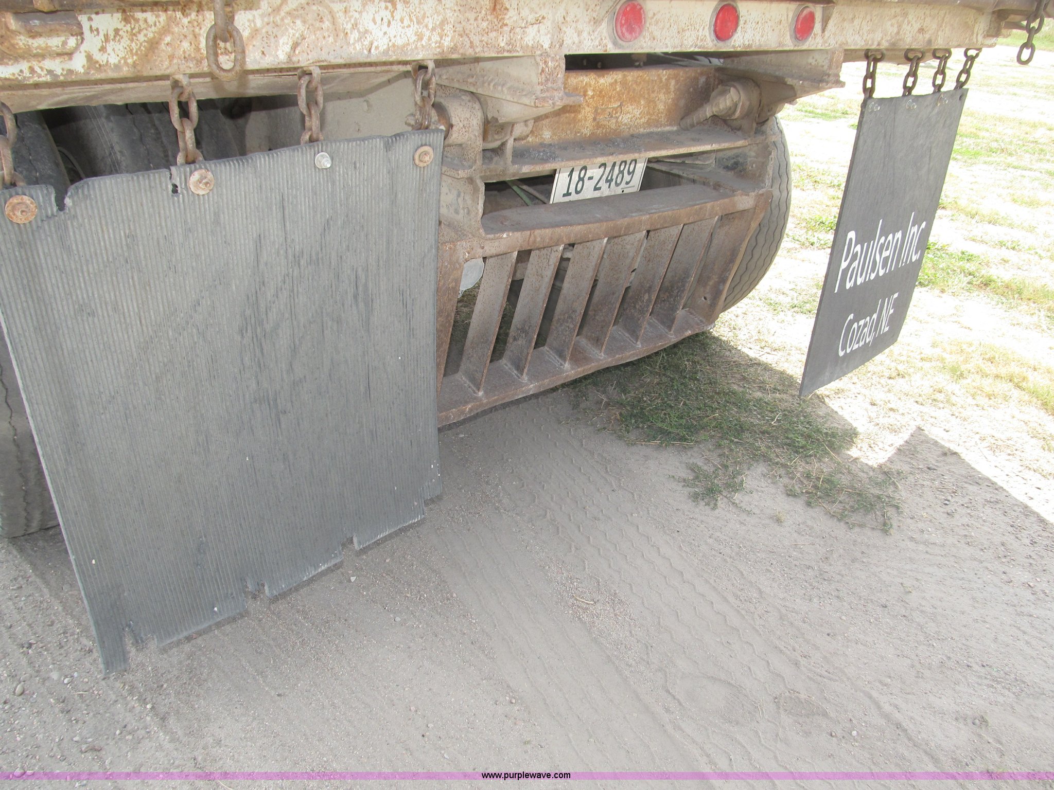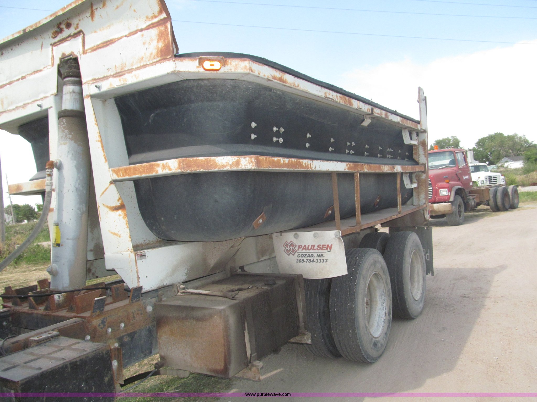 1989 Ford L9000 tandem axle dump truck. 60,549 miles on odometer, 2,559 hours on meter, Cummins LTA10 10.0L L6 diesel engine 270 HP, Road Ranger nine speed transmission Model RT0-11707LL, Differential lock, National air ride seat, Push button start, 50 gallon fuel tank, Reiter Industries barrel dump bed Model 1512DH, Serial 4884, Approx. 15'4"L, Custom hoist Model 74-401-156, Single three-stage cylinder, Serial 493788, Plastic/rubber box with bolt-in liner, Air controlled Chelsea PTO, Approx. 36.5" x 20.75" x 15.25" hydraulic tank, Clearance lights, Rear exhaust stack, Air brakes, Mixer truck chassis, 222" wheelbase, Yokohama 425/65R22.5 front tires, 11R22.5 rear tires, GVWR 56,500 lbs, Interior/exterior cosmetic damage, Cracks and patches in box, Crack in box front cross-member, Front grille guard damage, EIN 2435. 1FDZU90LXKVA13138. View equipment video. Shipping quotes available. Paulsen, Inc.. 1116 East Hwy 30. Cozad, NE 69130