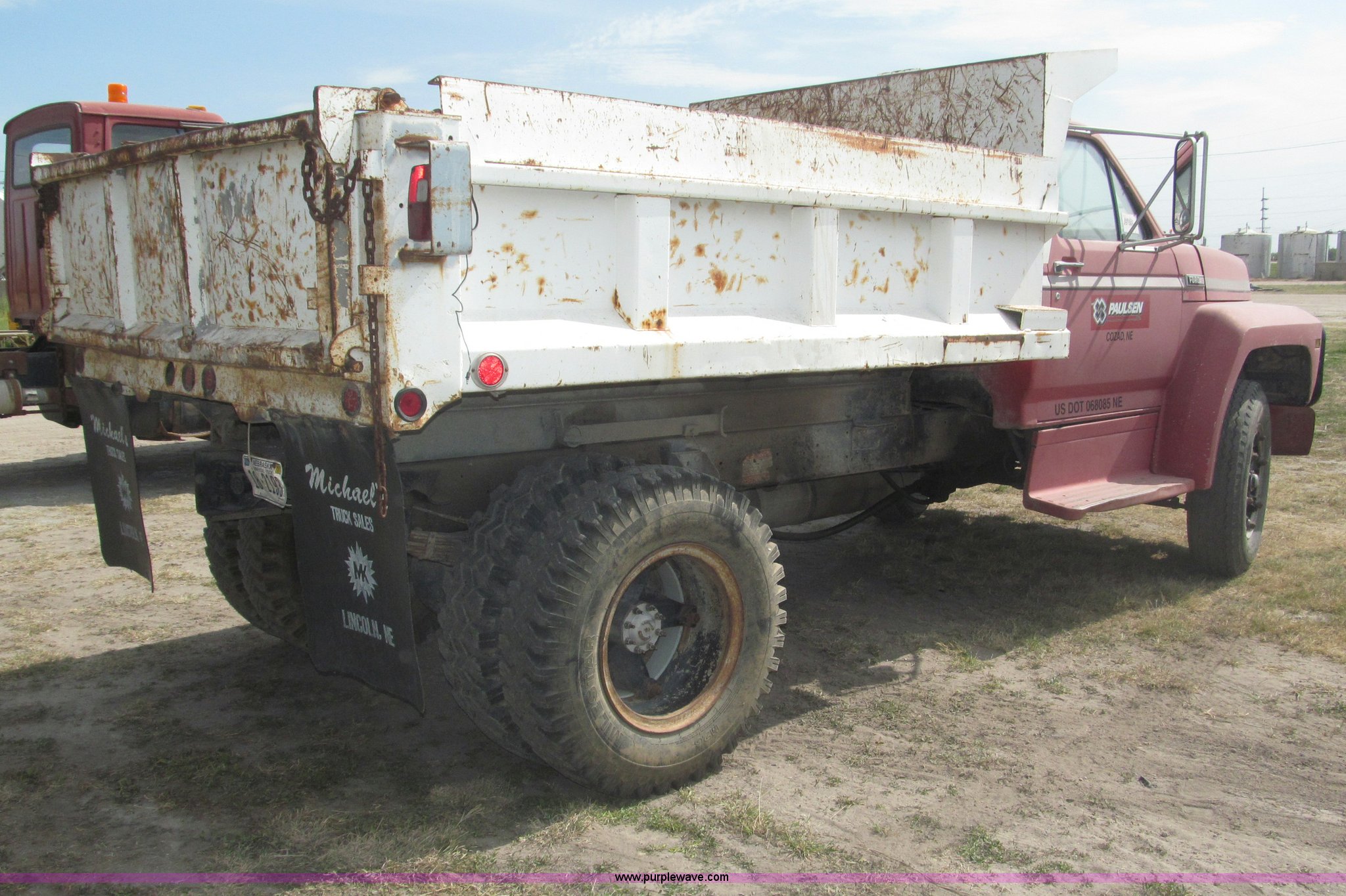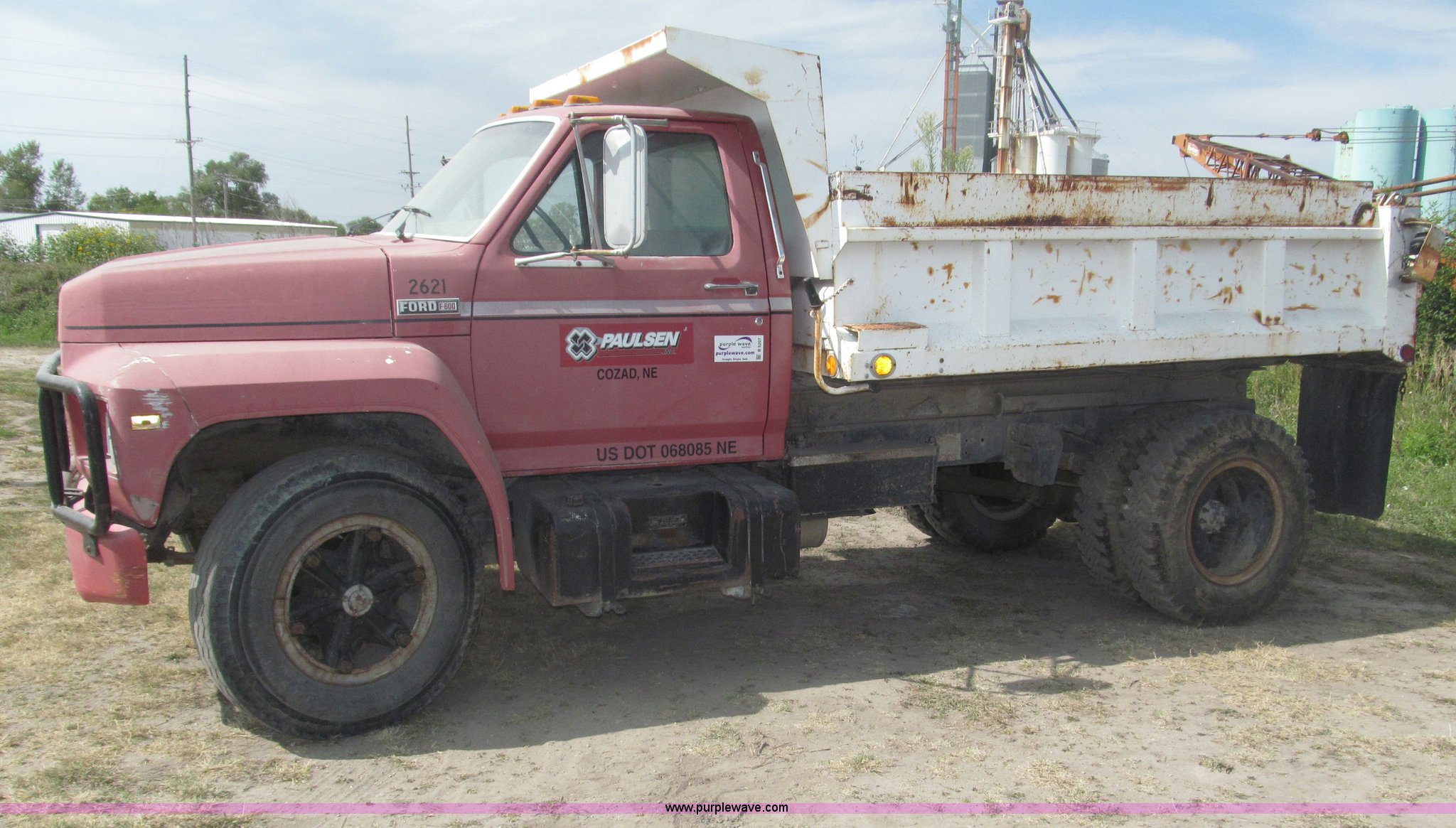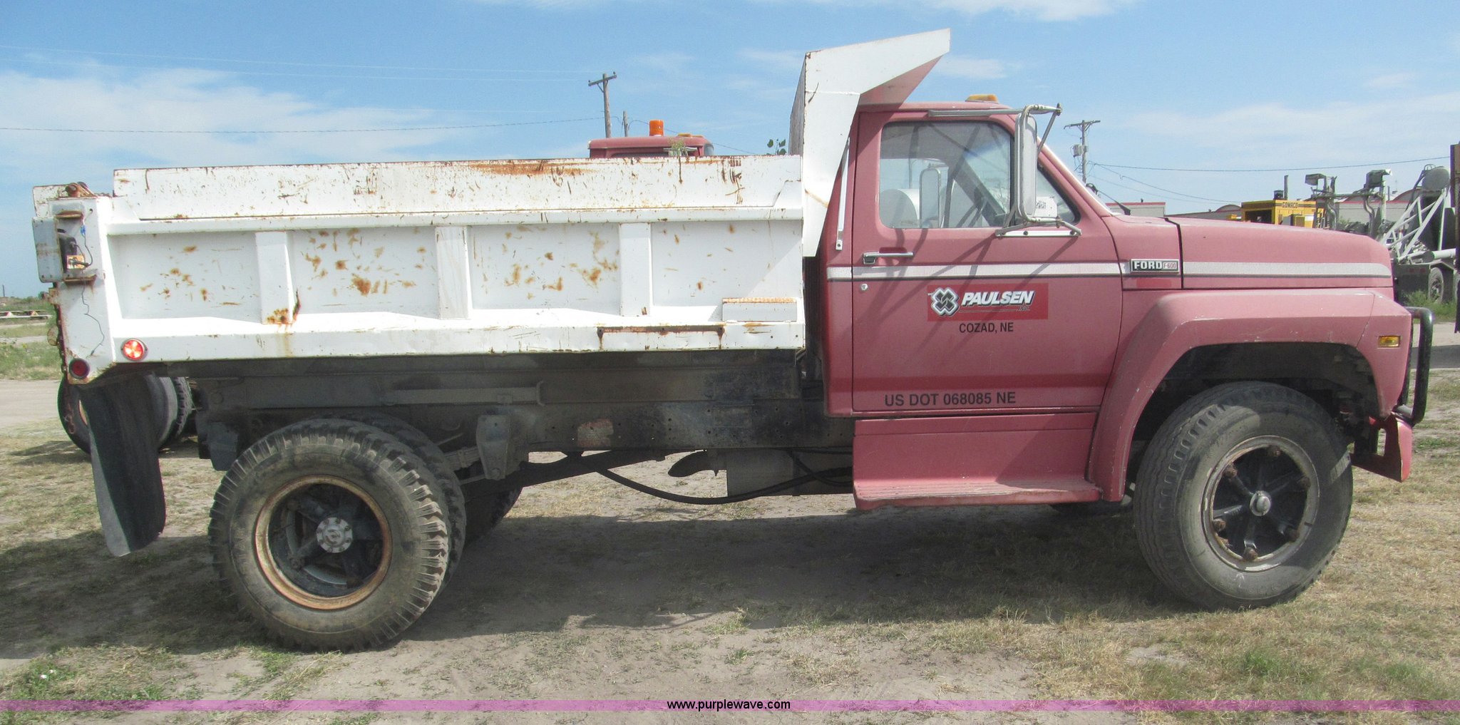 Purple Wave is selling a used Construction Dump Truck in Nebraska. This item is a 1986 Ford F600 dump truck with the following: 125,033 miles on odometer, 8.2L V8 diesel engine, Automatic transmission, Heat, Manual windows, seat, and mirrors, Vinyl interior, Backup alarm, 10' dump box, 5 cu. yd. capacity, PTO, Clearance lights, 50 gallon fuel tank, Rockwell F rear axle, 3.29 gear ratio, Serial 106BNX41, 207" wheelbase, 9.00-20 tires, EIN 2621