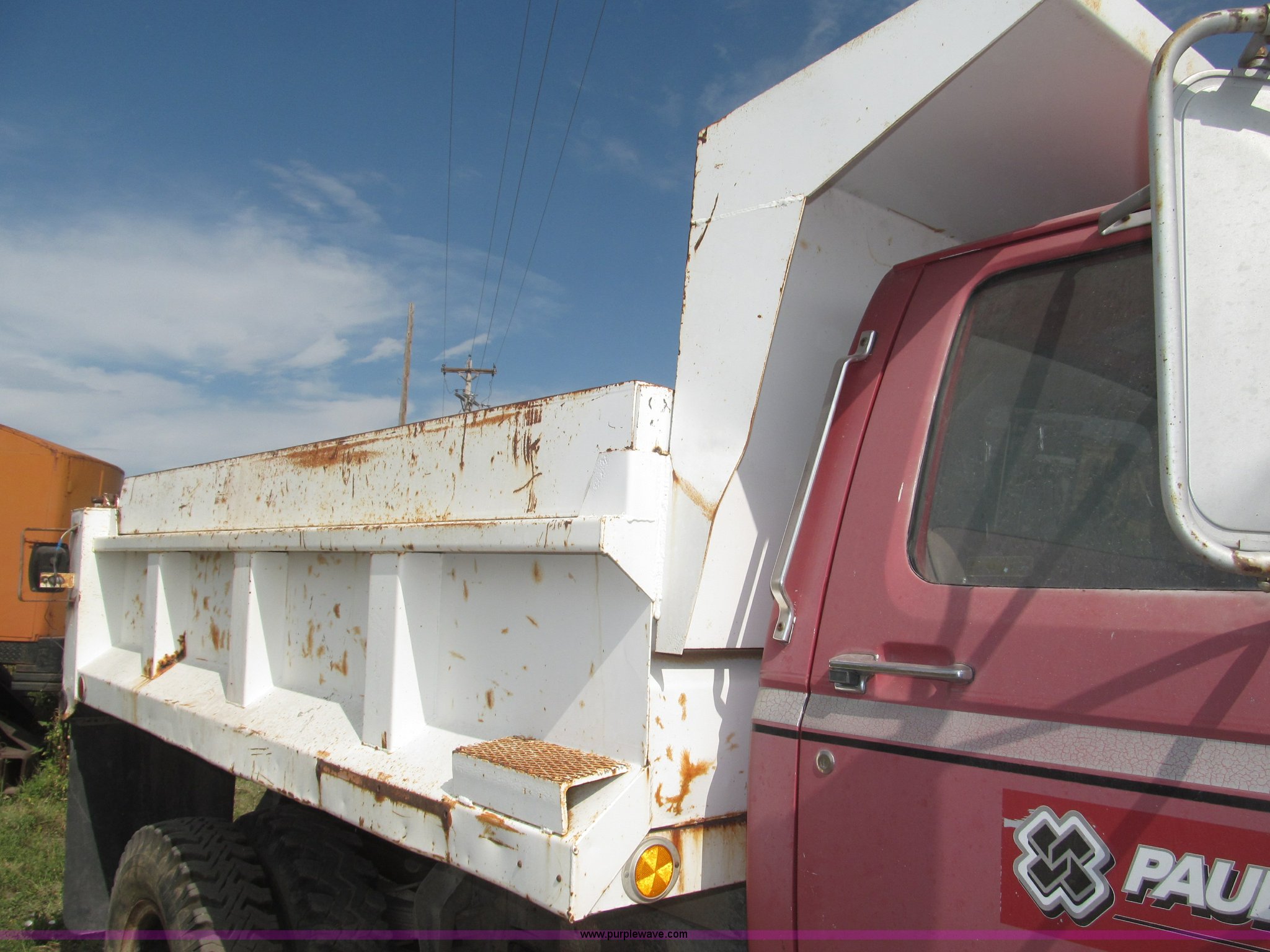 1986 Ford F600 dump truck. 125,033 miles on odometer, 8.2L V8 diesel engine, Automatic transmission, Heat, Manual windows, seat, and mirrors, Vinyl interior, Backup alarm, 10' dump box 5 cu. yd. capacity, PTO, Clearance lights, 50 gallon fuel tank, Rockwell F rear axle 3.29 gear ratio, Serial 106BNX41, 207" wheelbase, 9.00-20 tires, EIN 2621. 1FDNK64N4GVA24965. View equipment video. Shipping quotes available. Paulsen, Inc.. 1116 East Hwy 30. Cozad, NE 69130