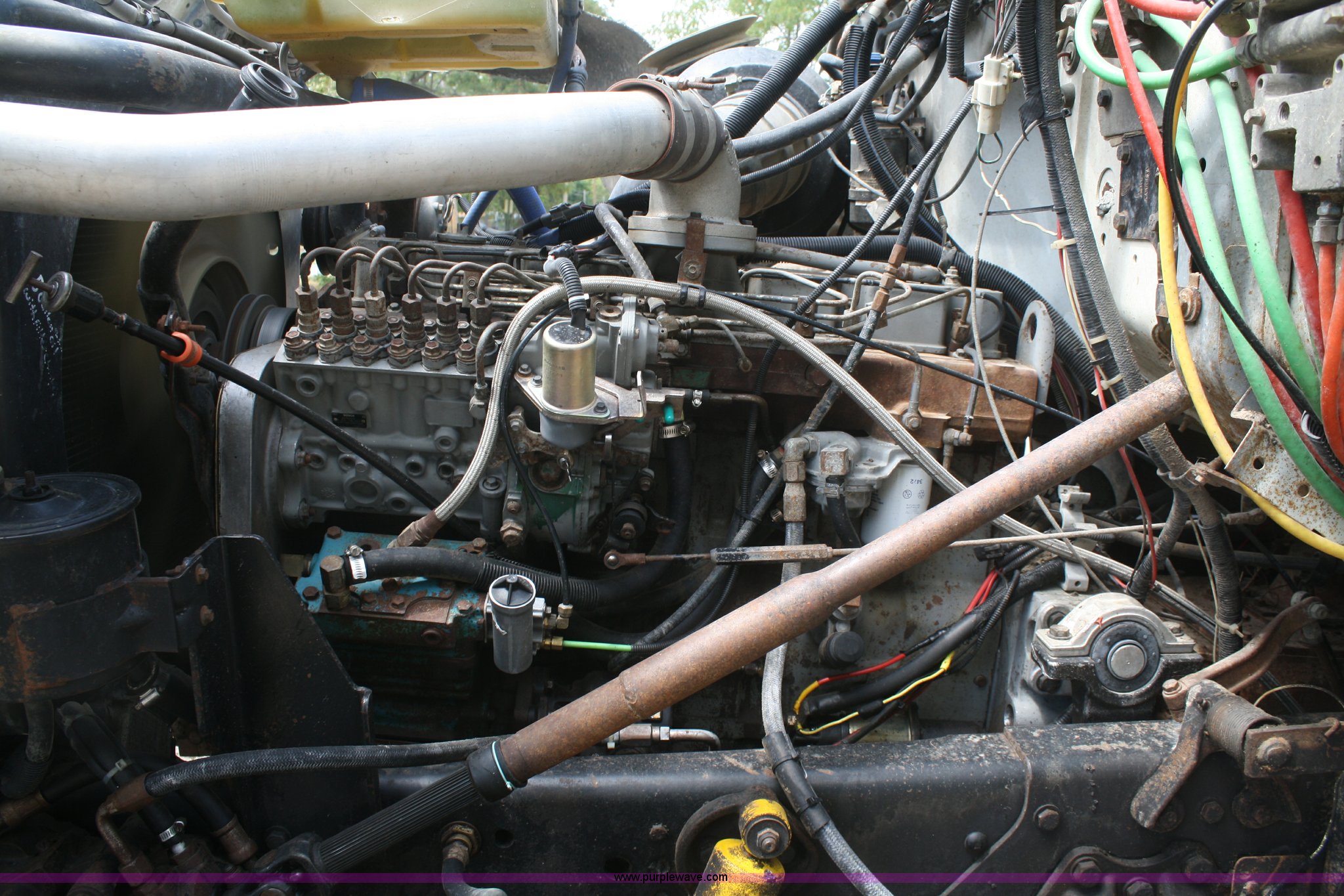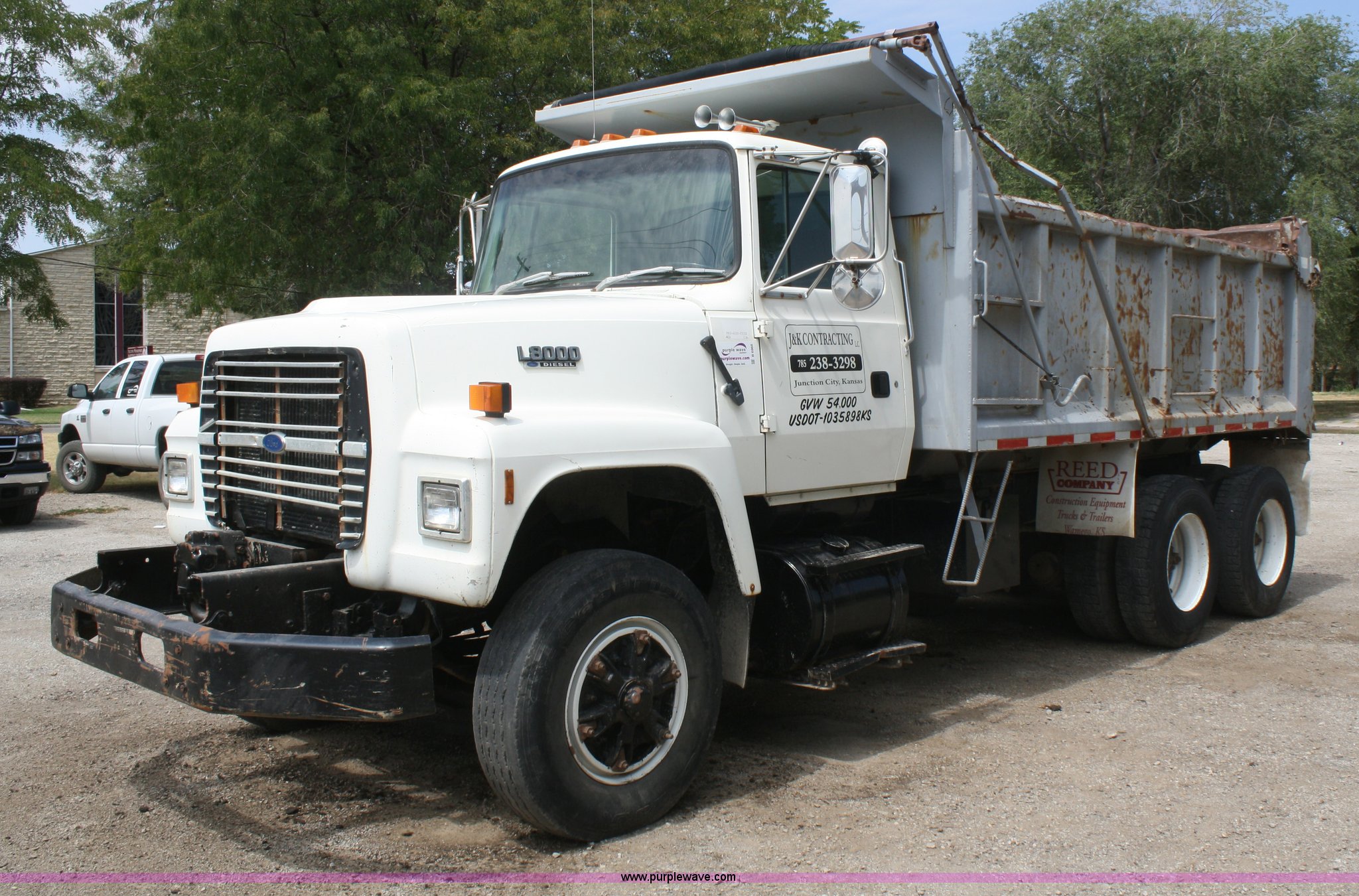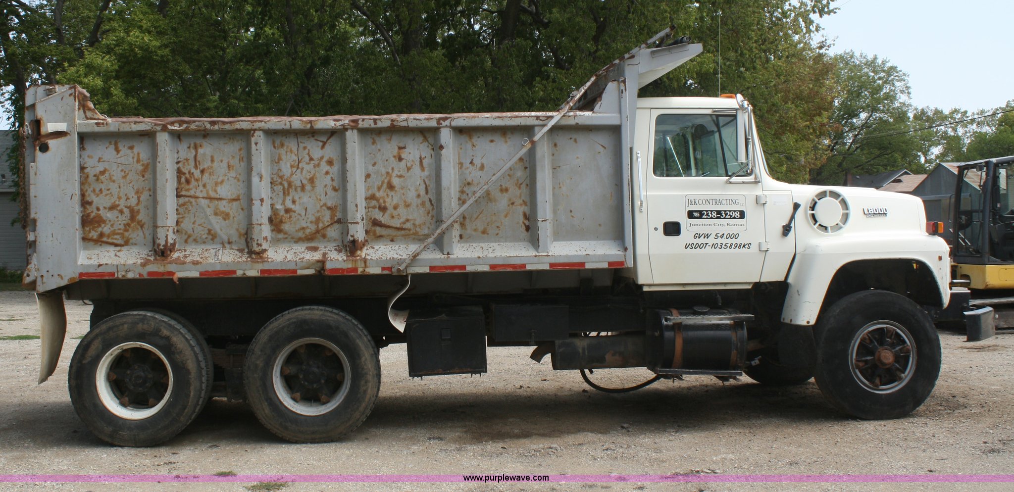 Purple Wave is selling a used Construction Dump Truck in Kansas. This item is a 1994 Ford LT8000 dump truck with the following: 287,174 miles on odometer, 6,277 hours on meter, Cummins ISC 8.3L diesel engine, Road Ranger eight speed manual transmission, Lo and Lo-Lo, Twin screw, AC and heat, AC non functional, Air suspension seat, 15' dump bed, Air end gate, Three stage single ram hoist, Lift cylinder replaced in April, Mesh tarp, Rear hydraulic hookup, Dual 50 gallon fuel tanks, Spring suspension, Front mount hydraulic pump, Air brakes, 11R22.5 tires, Minor engine oil leak, Intermittent fuel shutoff issues
