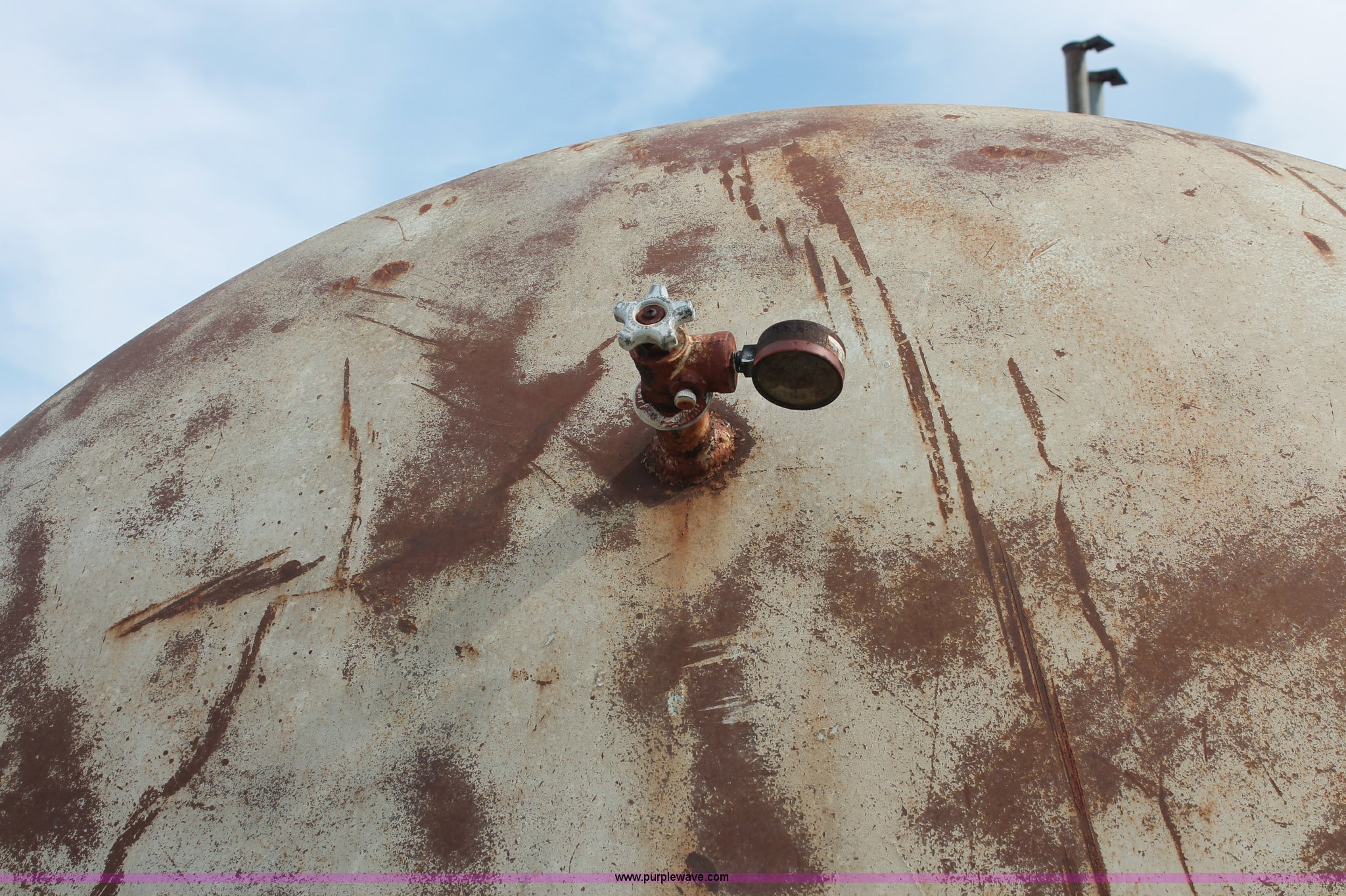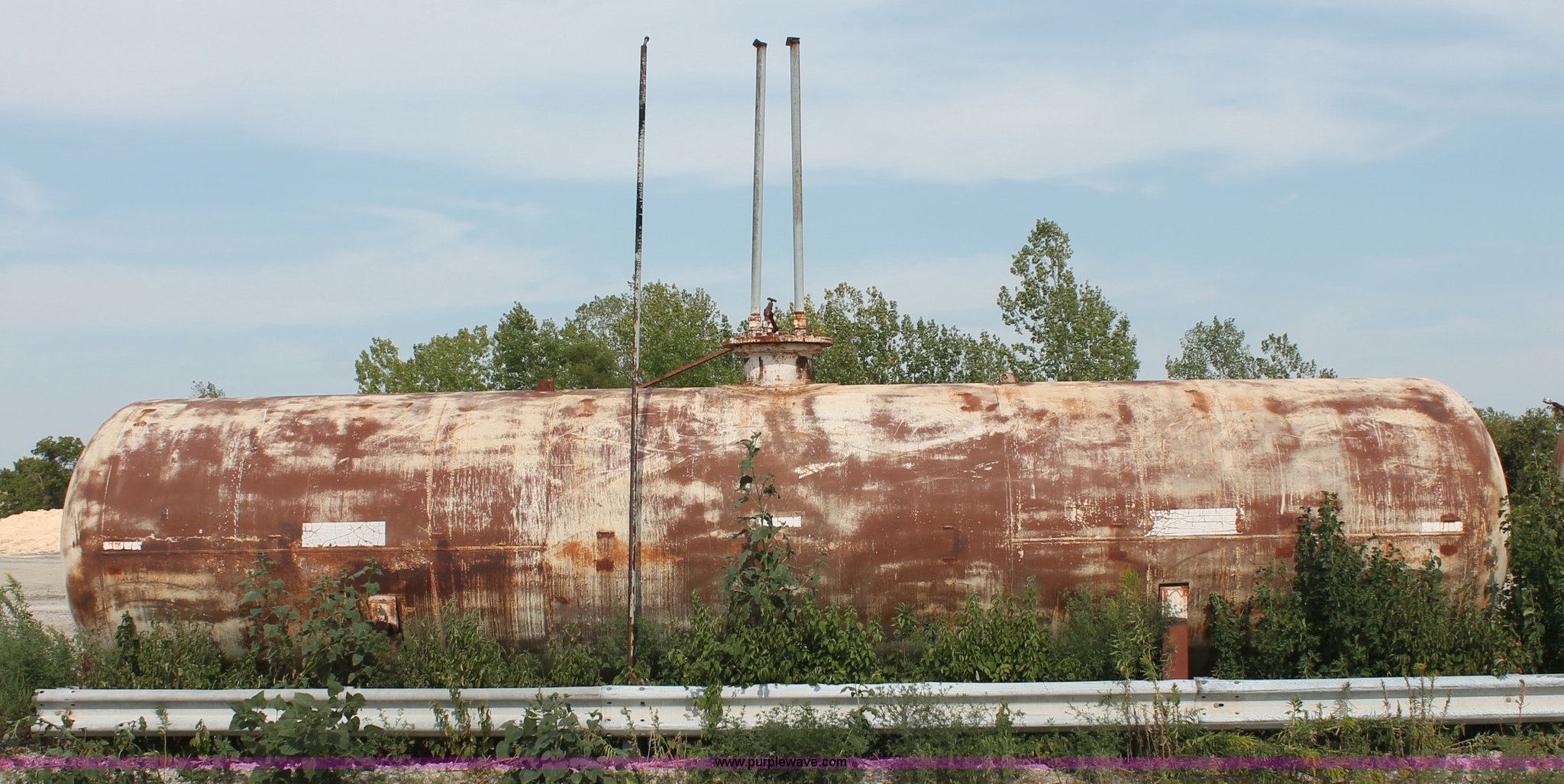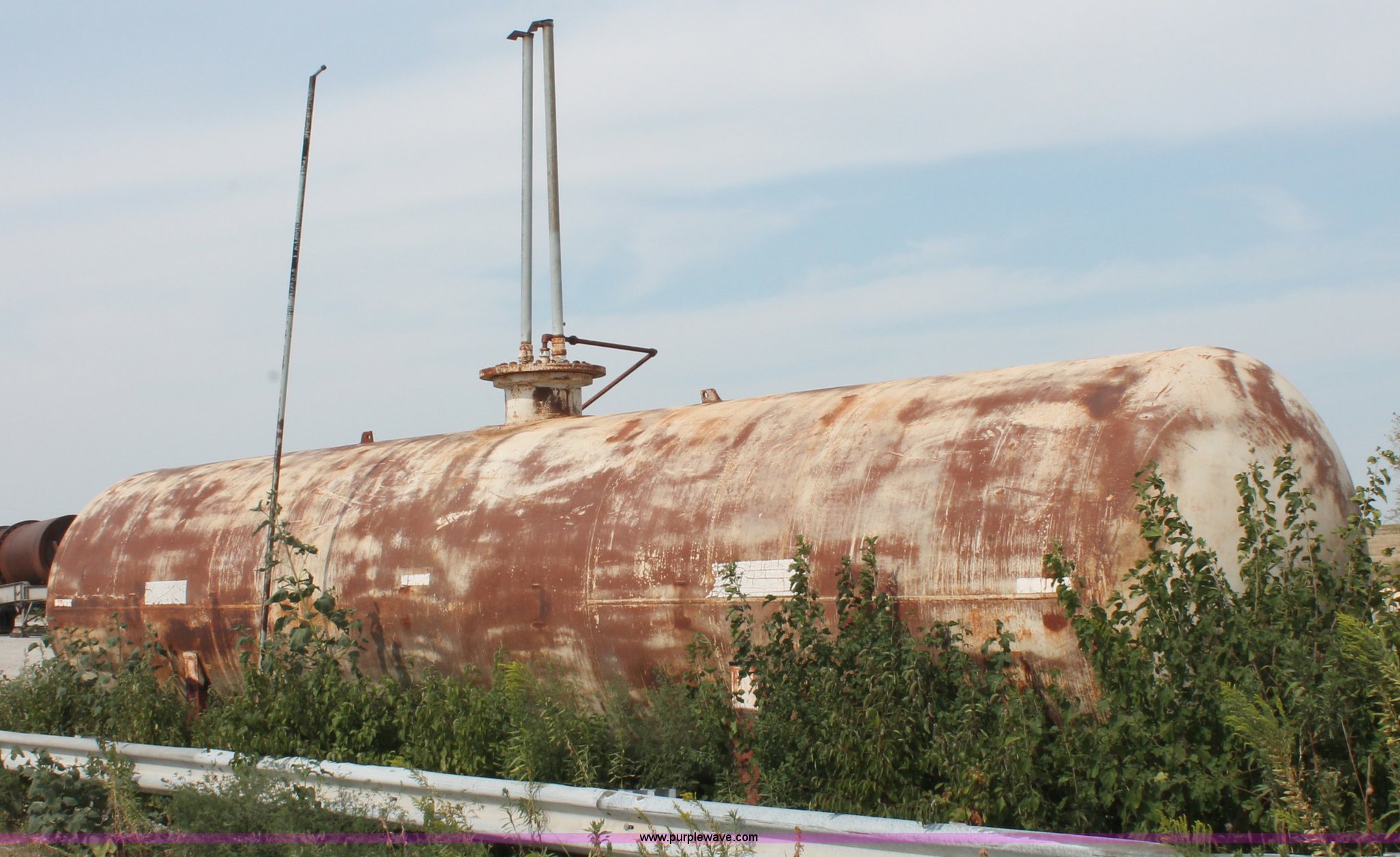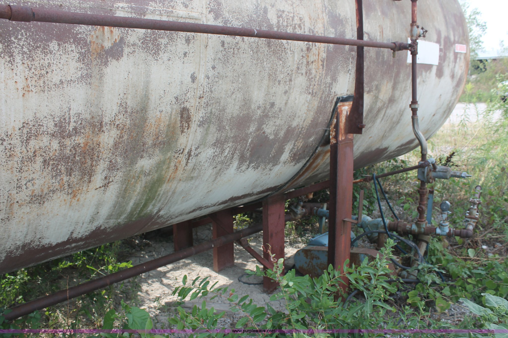 Purple Wave is selling a used Fuel and Lube in Missouri. This item is a 10,000 gallon industrial propane tank with the following: 83,326 lbs water capacity, 35'L x 7' diameter, Master visable LP gas tank capacity meter, Assorted steel plumbing, Original test date May 13, 1957