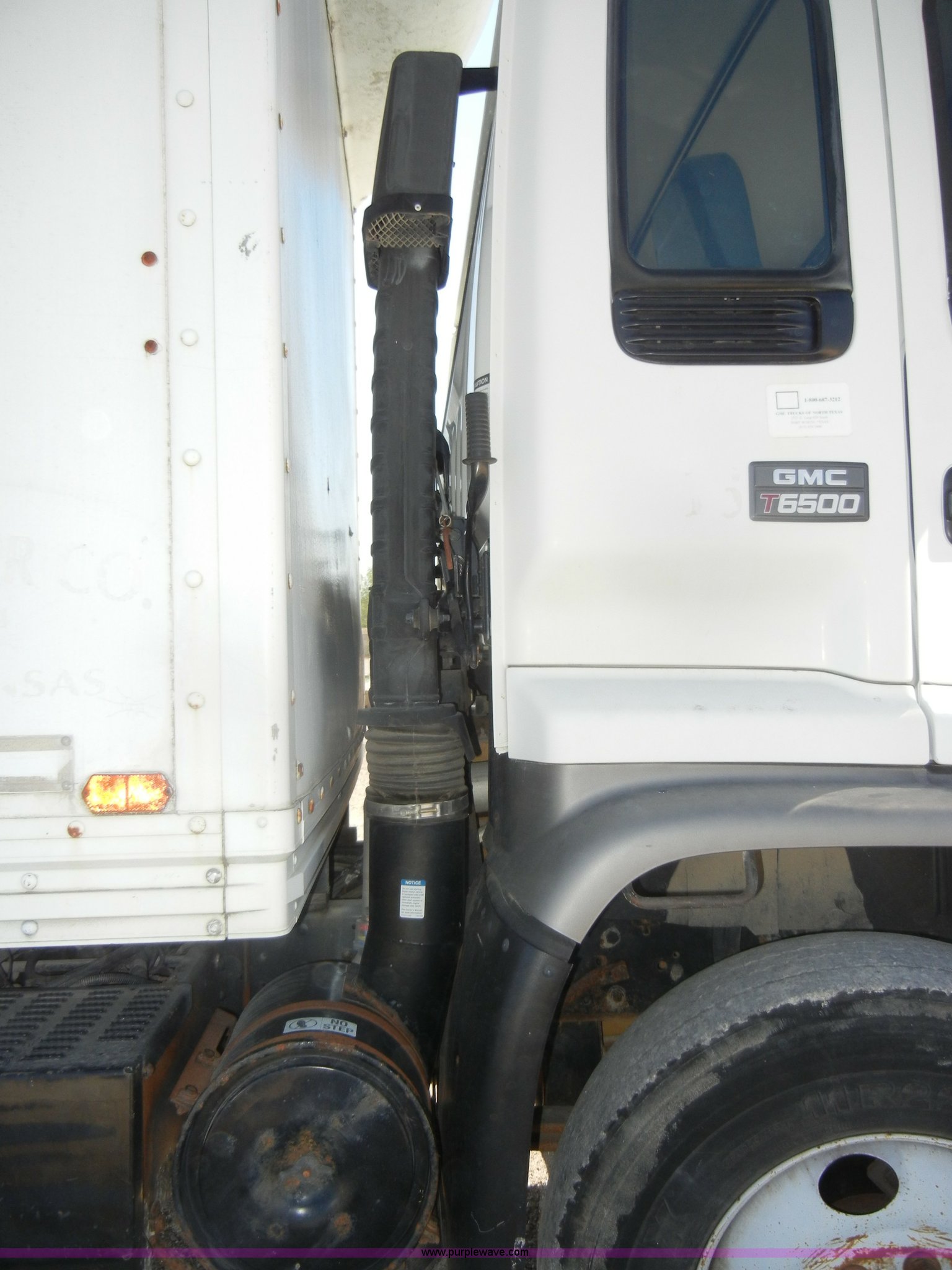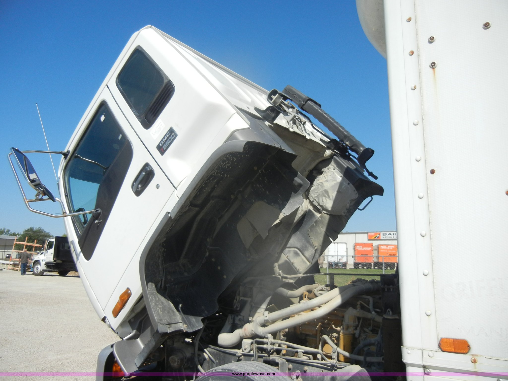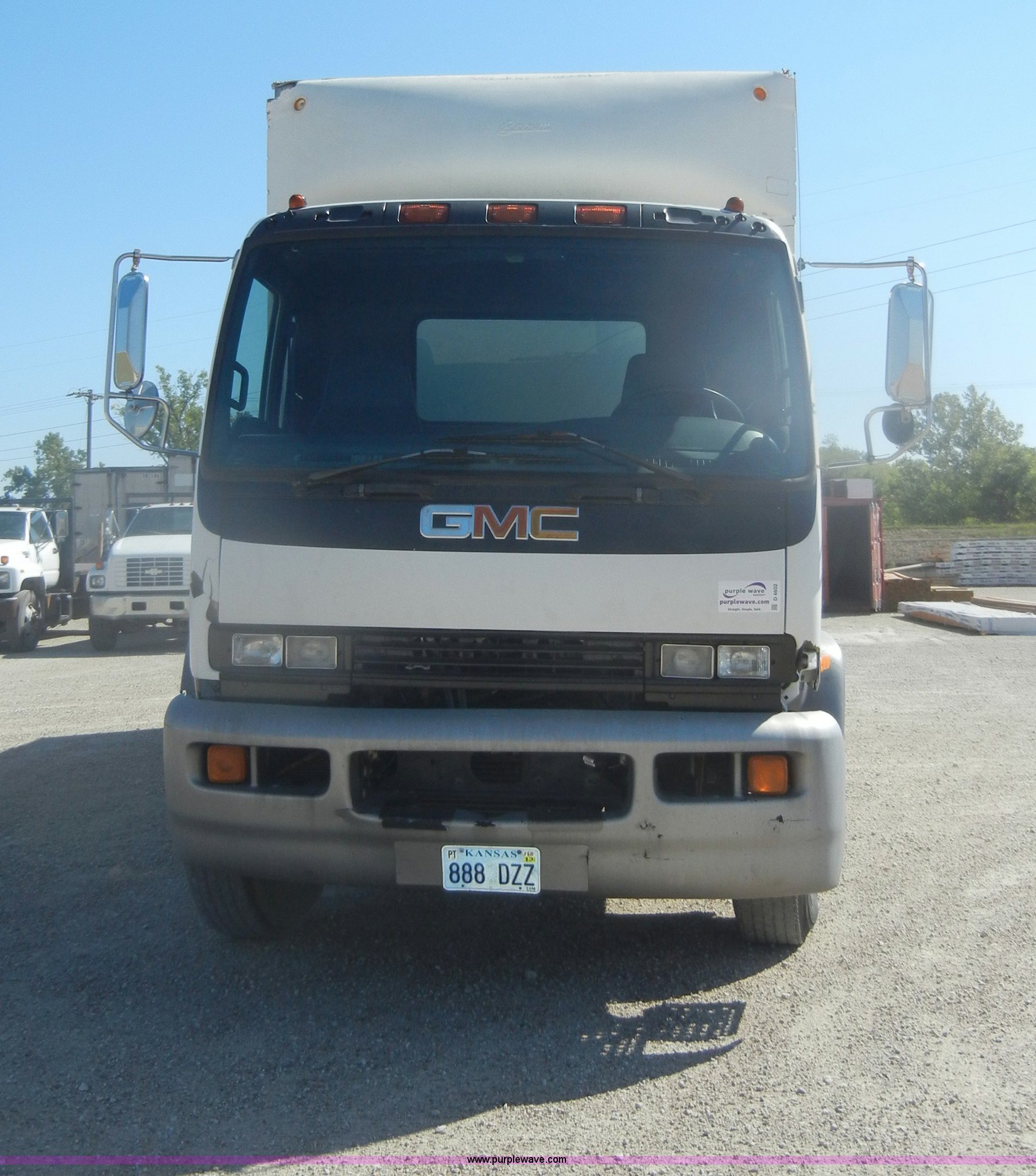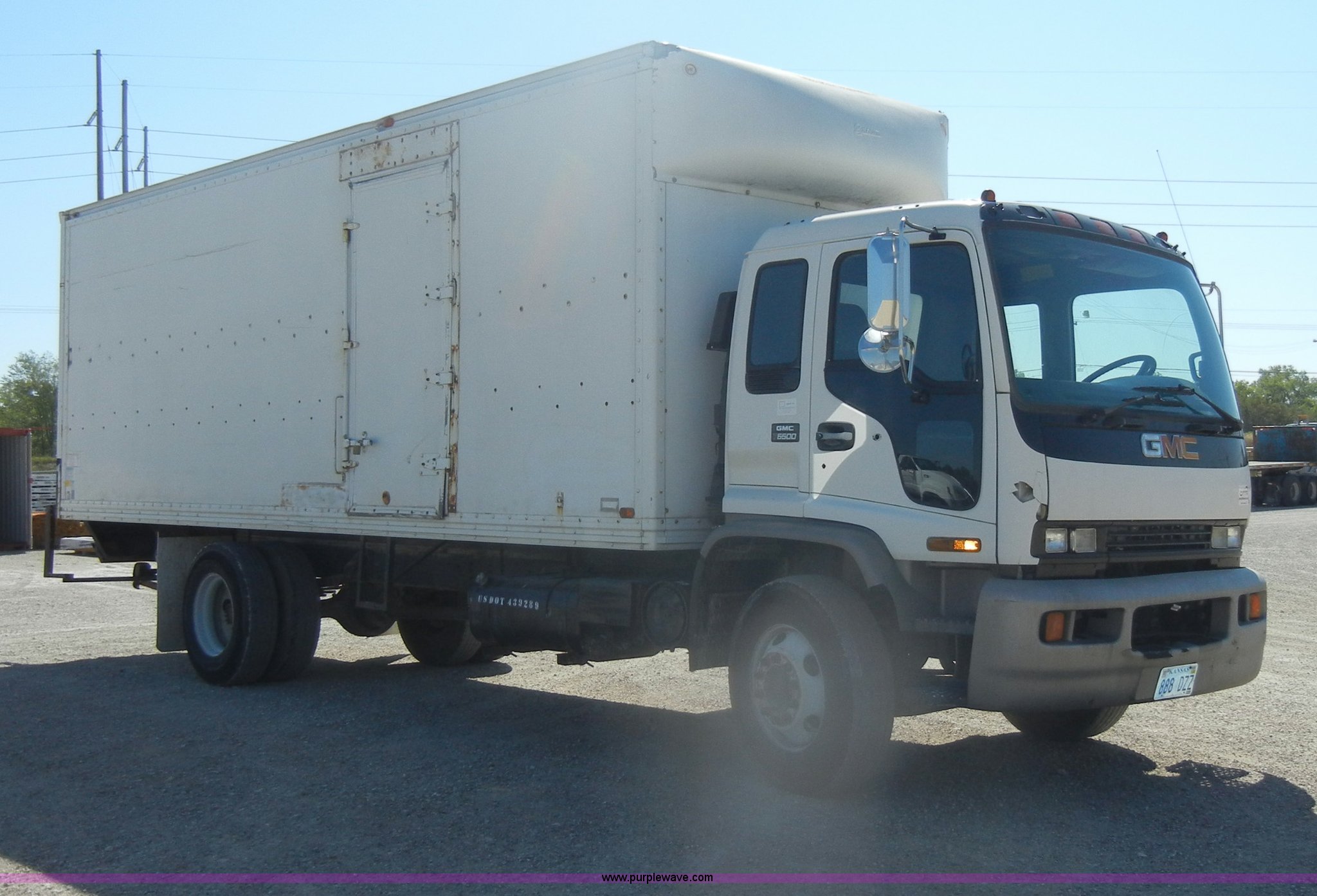Purple Wave is selling a used Box Truck in Kansas. This item is a 1997 GMC T6500 box truck with the following: 114,946 miles on odometer, Caterpillar 3116 6.6L six cylinder diesel engine, 275 HP, Automatic transmission, AC and heat, Tilt, AM/FM, Manual windows and locks, Passenger daylight window, Vinyl interior, Brown cargo box, Model 800W2493 1/2, Serial S533787, 292" x 95", Rear roll up door, 2,000 lb lift, Wood flooring, Interior lights, Single side entry door, Damaged,, Dual 50 gallon fuel tanks, Spring suspension, Hydraulic brakes, 11R22.5 tires, GVWR 25,950 lbs, FAWR 10,000 lbs, RAWR 17,850 lbs, Passenger side mirror cracked, Interior/exterior cosmetic damage, Damage to hood
