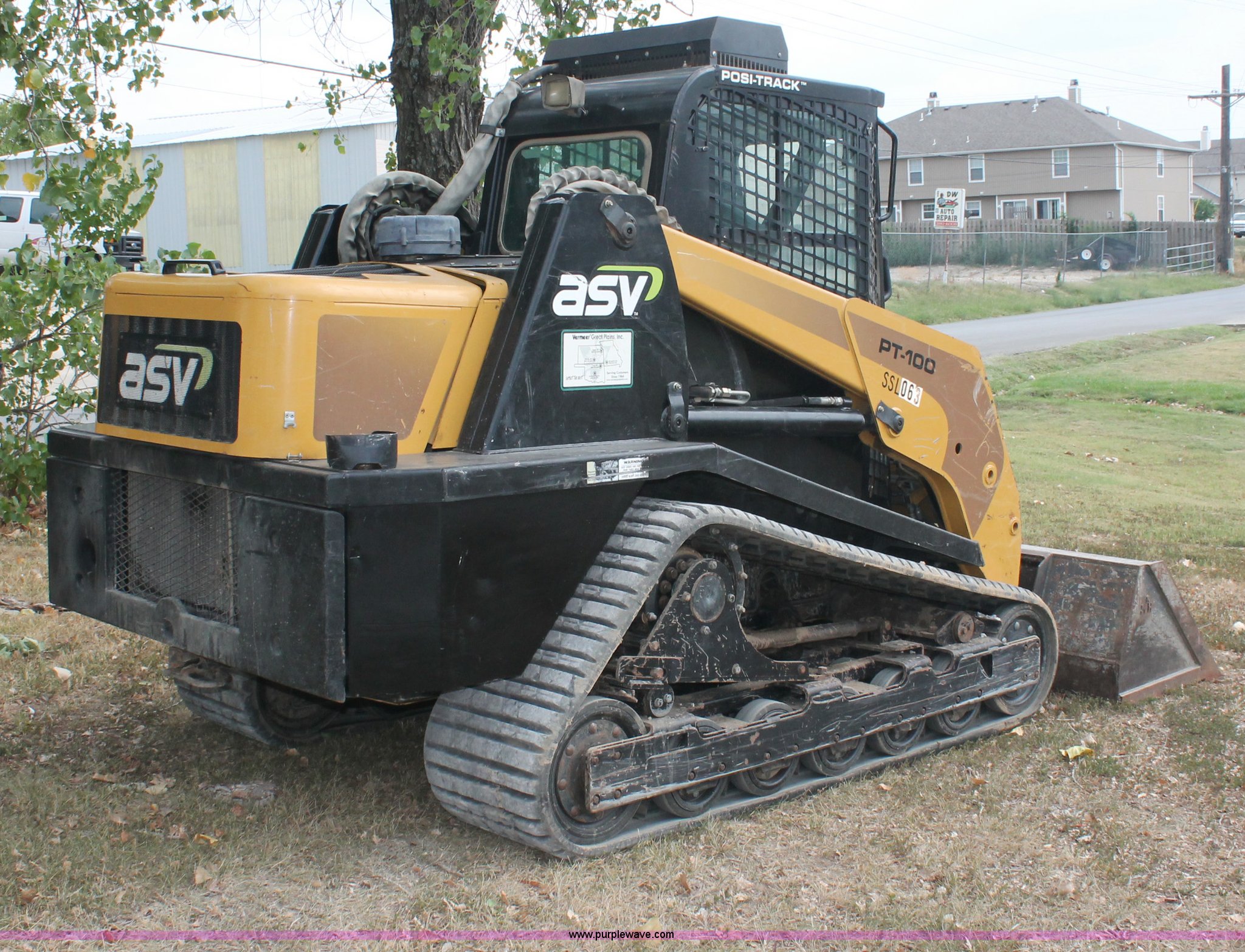 Purple Wave is selling a used Tracked Skid Steer Loader in Missouri. This item is a 2007 ASV PT100 track skid steer with the following: 1,252 hours on meter, Posi-Track, Perkins four cylinder turbo diesel engine, 100 HP, Two speed transmission, Enclosed cab, AC and heat, 74"W smooth bucket, Bolt on butting edge, Hydraulic quick attach for bucket, High flow and low flow auxiliary hydraulics, Rear receiver hitch, 18"W rubber tracks, Replaced within last 40 hours, Serial PTD03674