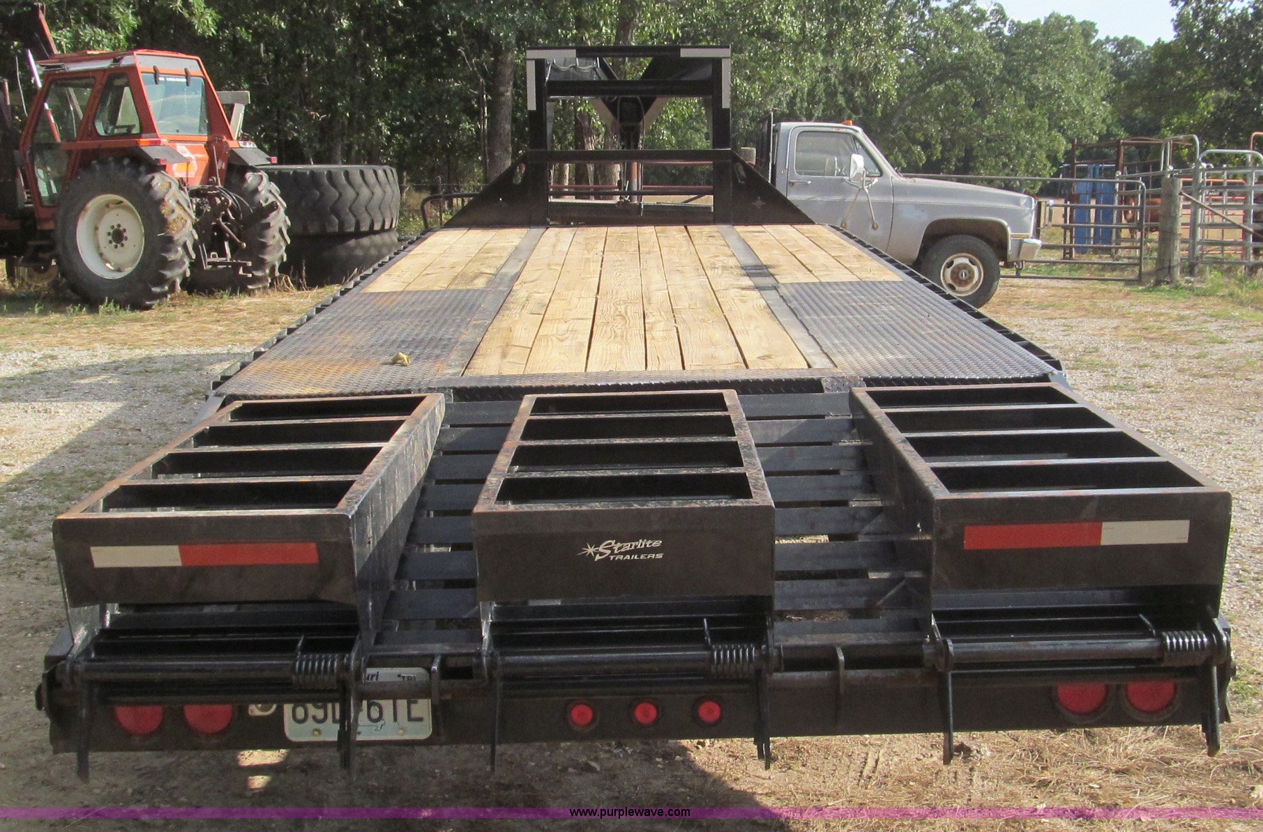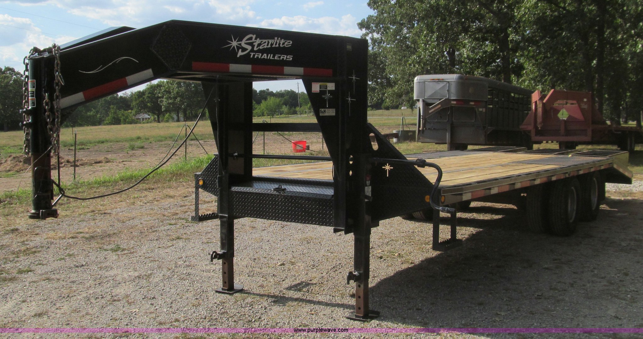 Purple Wave is selling a used Equip. Trailer in Missouri. This item is a 2010 Starlite 25' gooseneck trailer with the following: Model Lo Profile 20+5TDGN, 20' deck, 5' dove tail, (3) 5' fold over ramps, Spring assist, 102" width, Wood deck, 2x8 treated pine, Stake pockets, Gooseneck toolbox, Electric brakes, Lo Profile frame, 12" x 19' I-beams, 3" channel iron cross members on 16" centers, 2 5/16" coupler, Adjustable landing gear, DOT 7-way plug with junction box, Breakaway kit, (2) 10,000 lbs axles, ST235/80R16 tires, 10 ply, GVWR 20,000 lbs